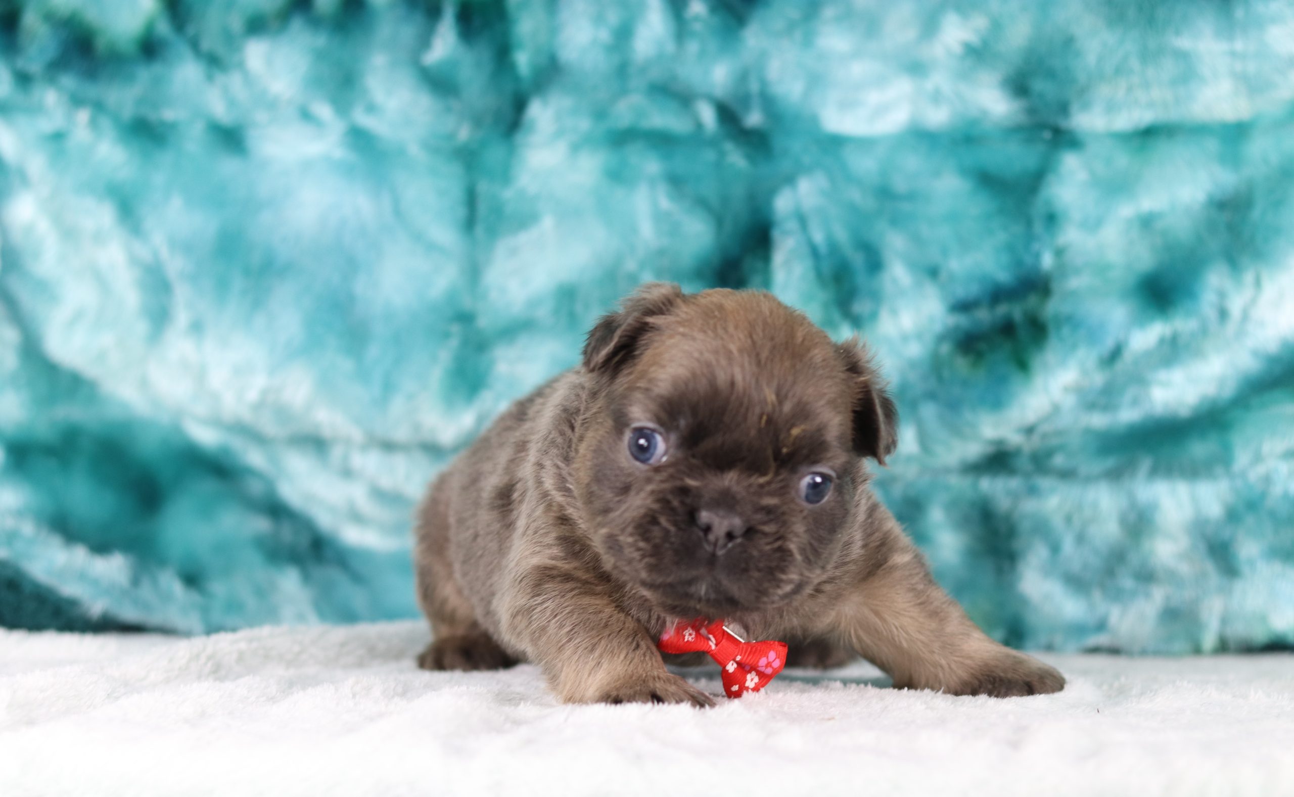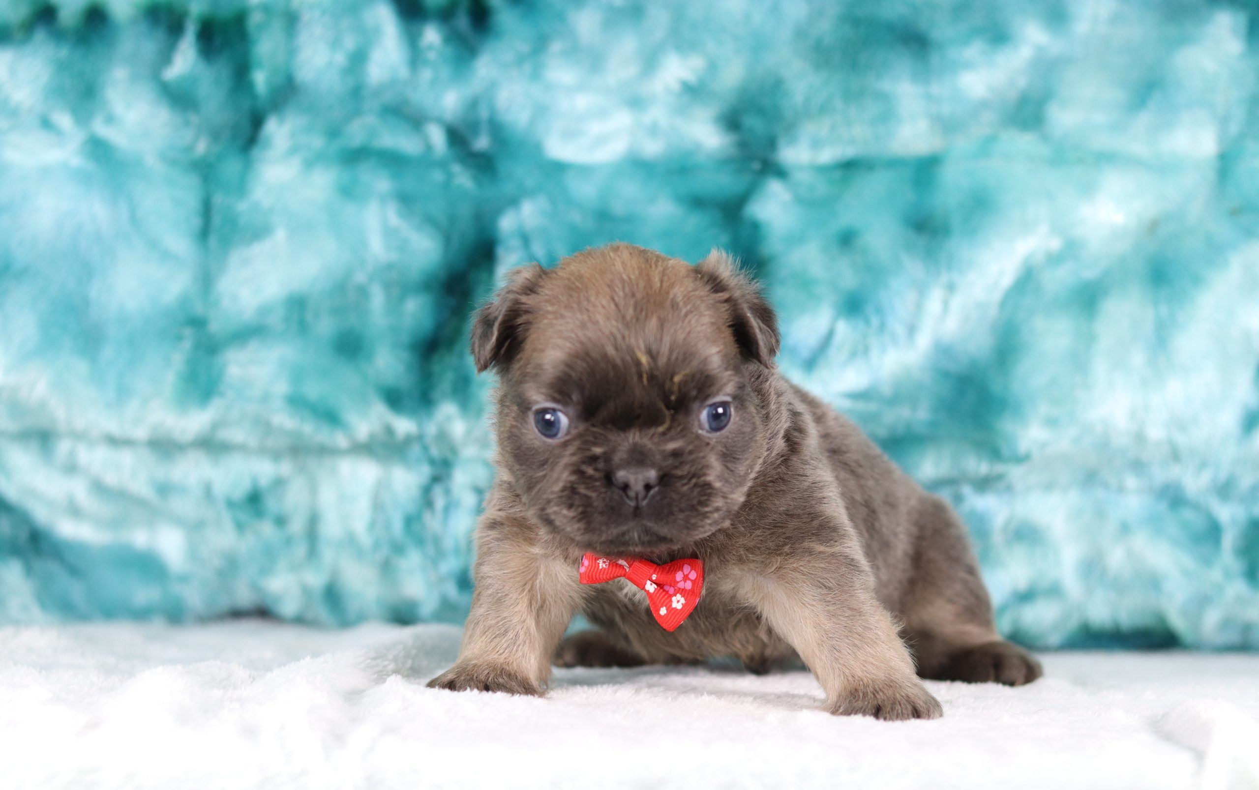 Myles, the Lilac, Fluffy Frenchie enjoys getting all the attention he can and, is just such a little sweetheart! He did great with his (ENS) Early Neurological Stimulation, he is definitly a joy to have around. He is happy to please, just a super friendly little guy!