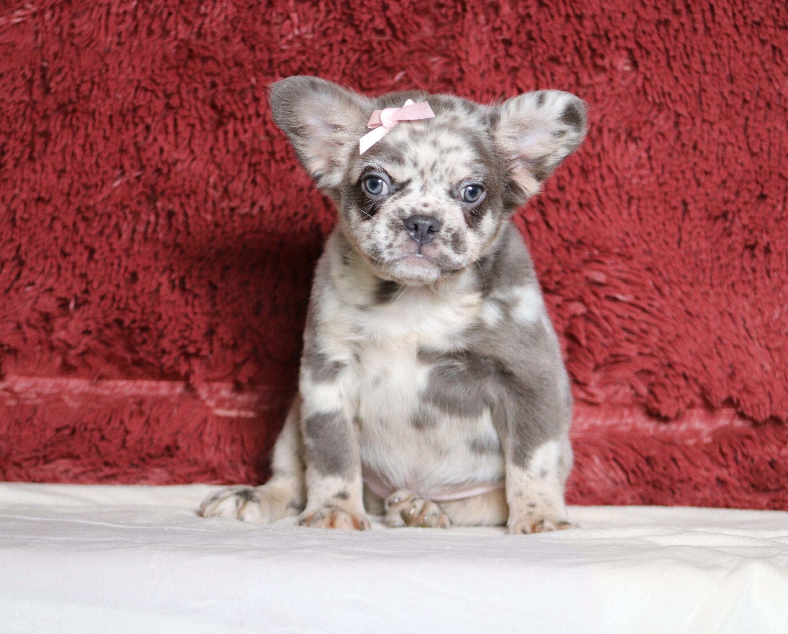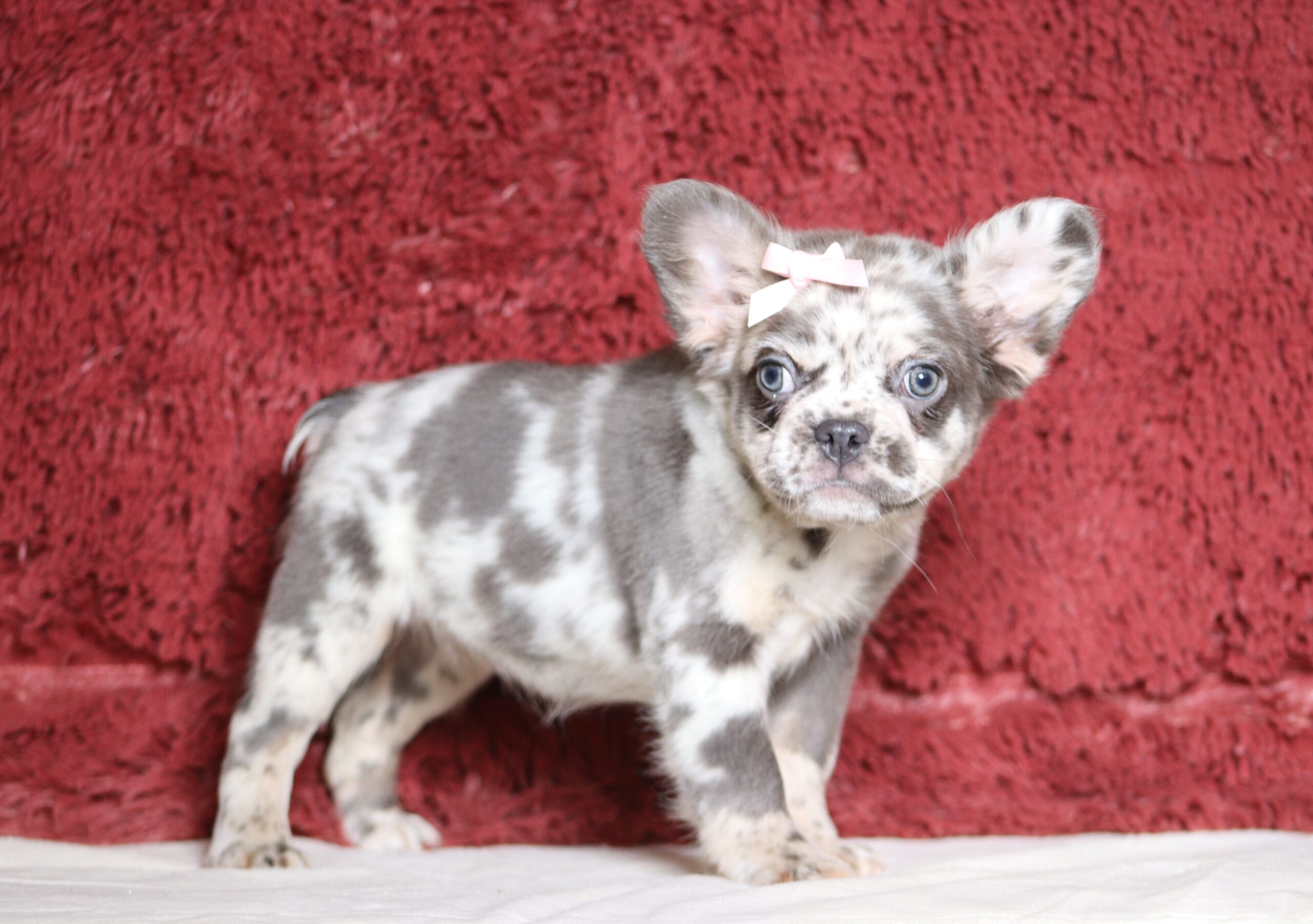 Alaya the Lilac Merle, frenchie is very caring and sweet! She is such a cheerful little girl a great companion to her littermates! Her temperament is wonderful, some of her favorites is playing with toys and being snuggled in your lap! She is eager to please and a bundle of love!