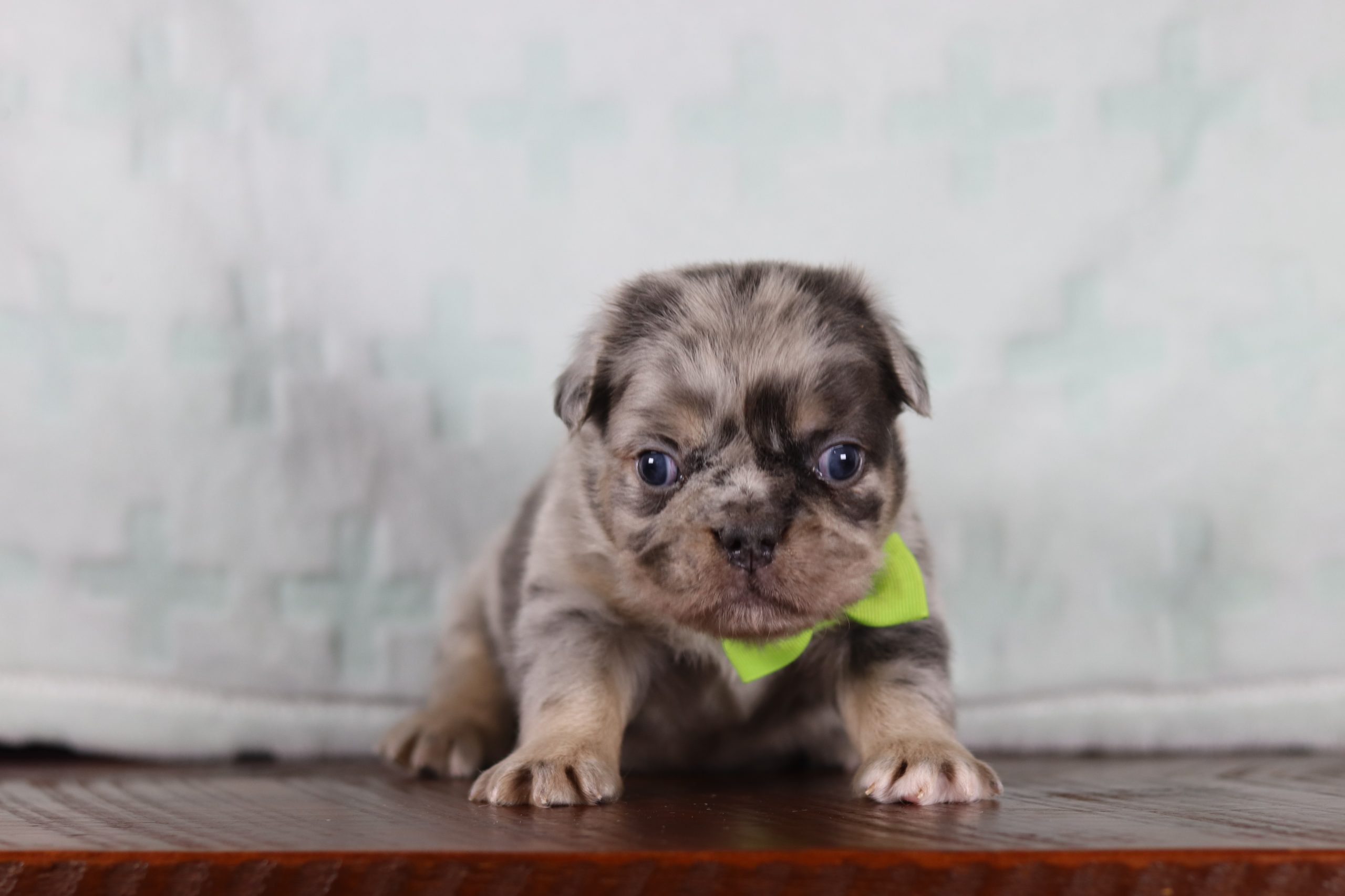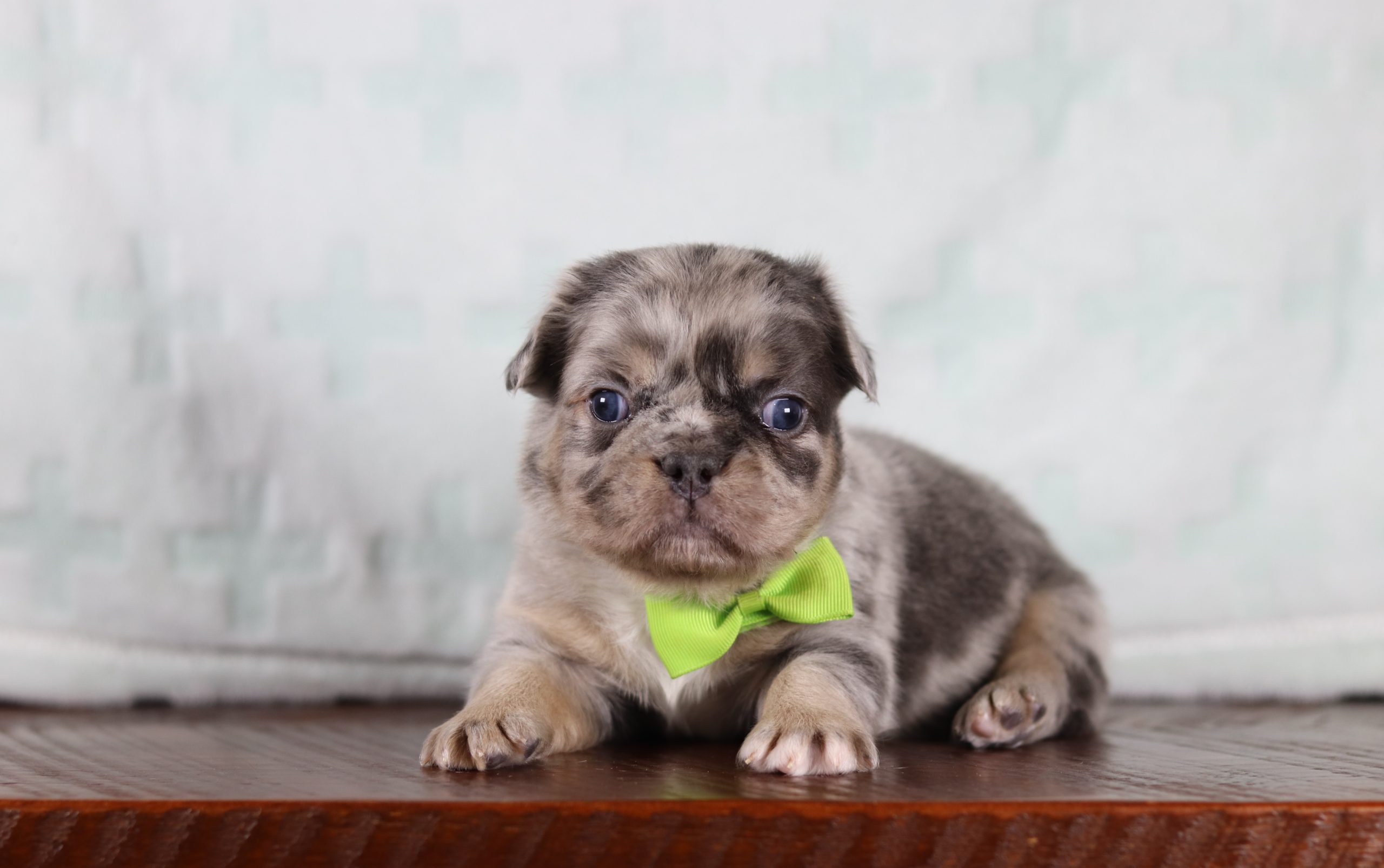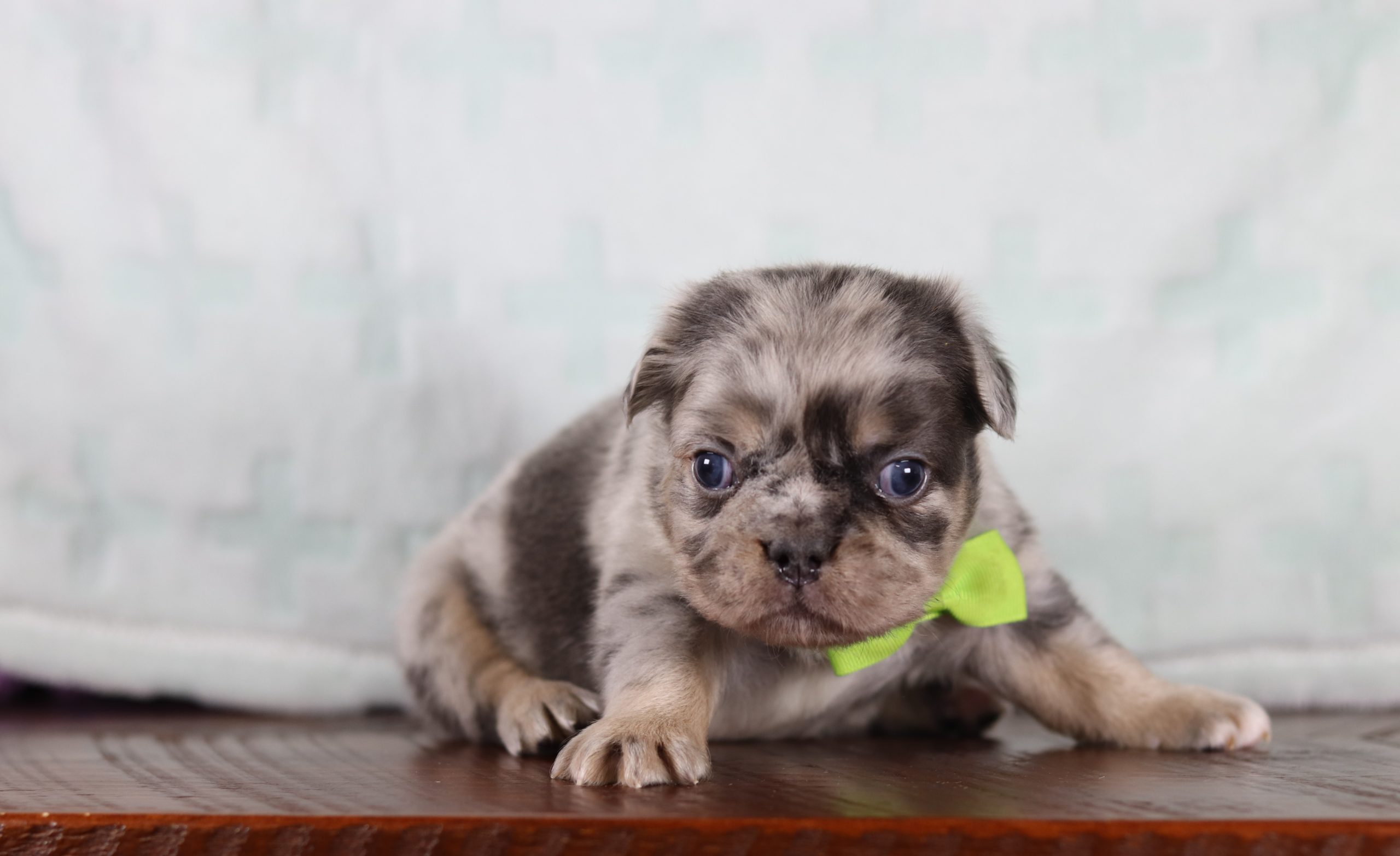 Hello, this is Alexander! He’s a cute little fluffy frenchie boy with a blue merle, soft, furry coat and 2 shining eyes. He loves to play with his siblings and also loves to be held and cuddled! He will be sure to shower you with lots of kisses!