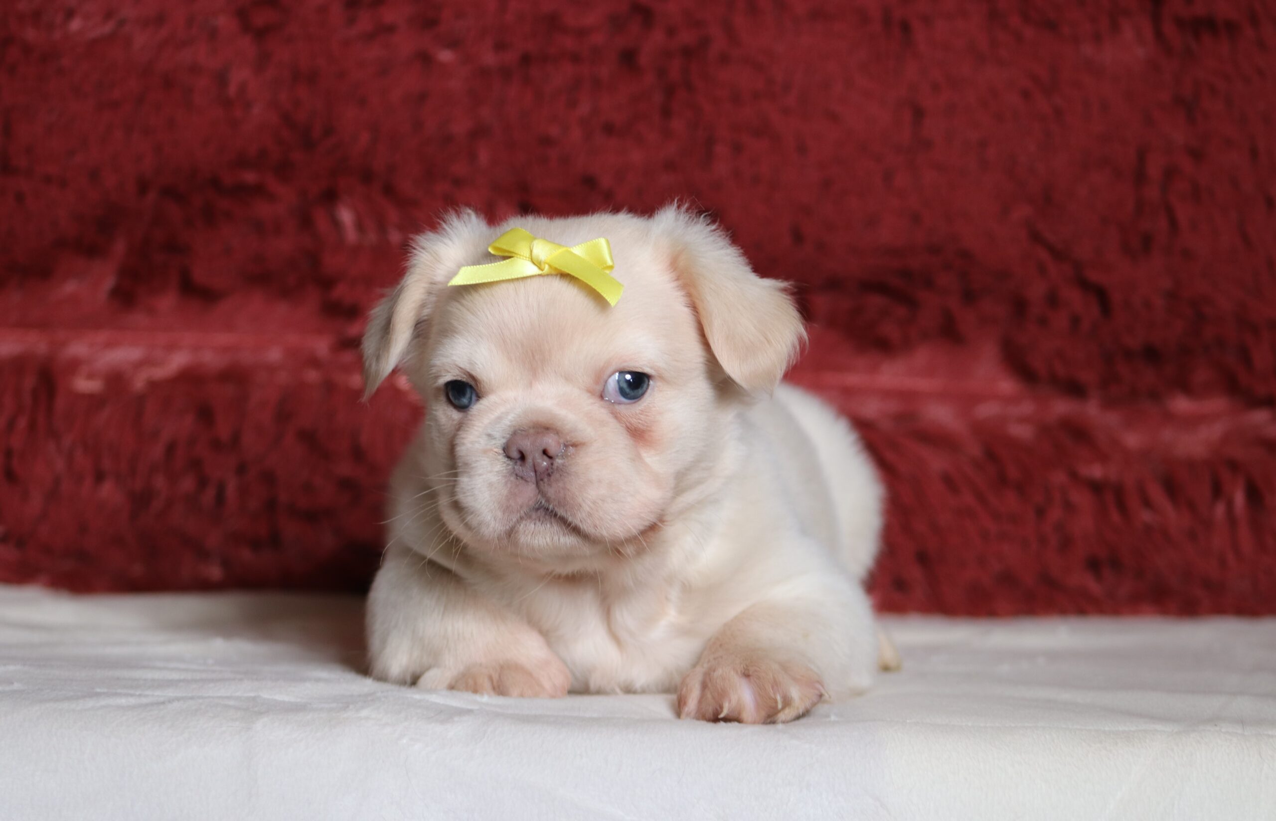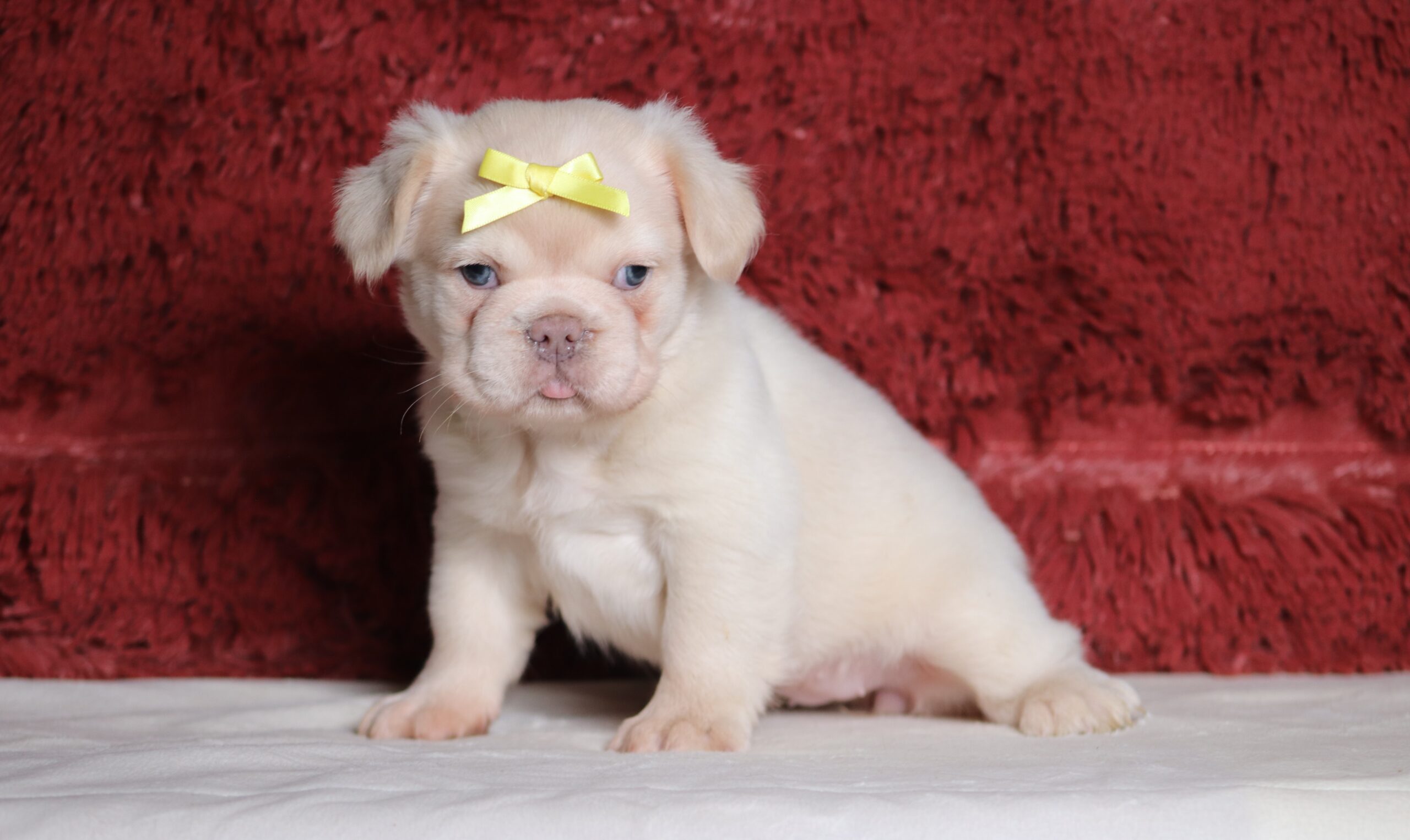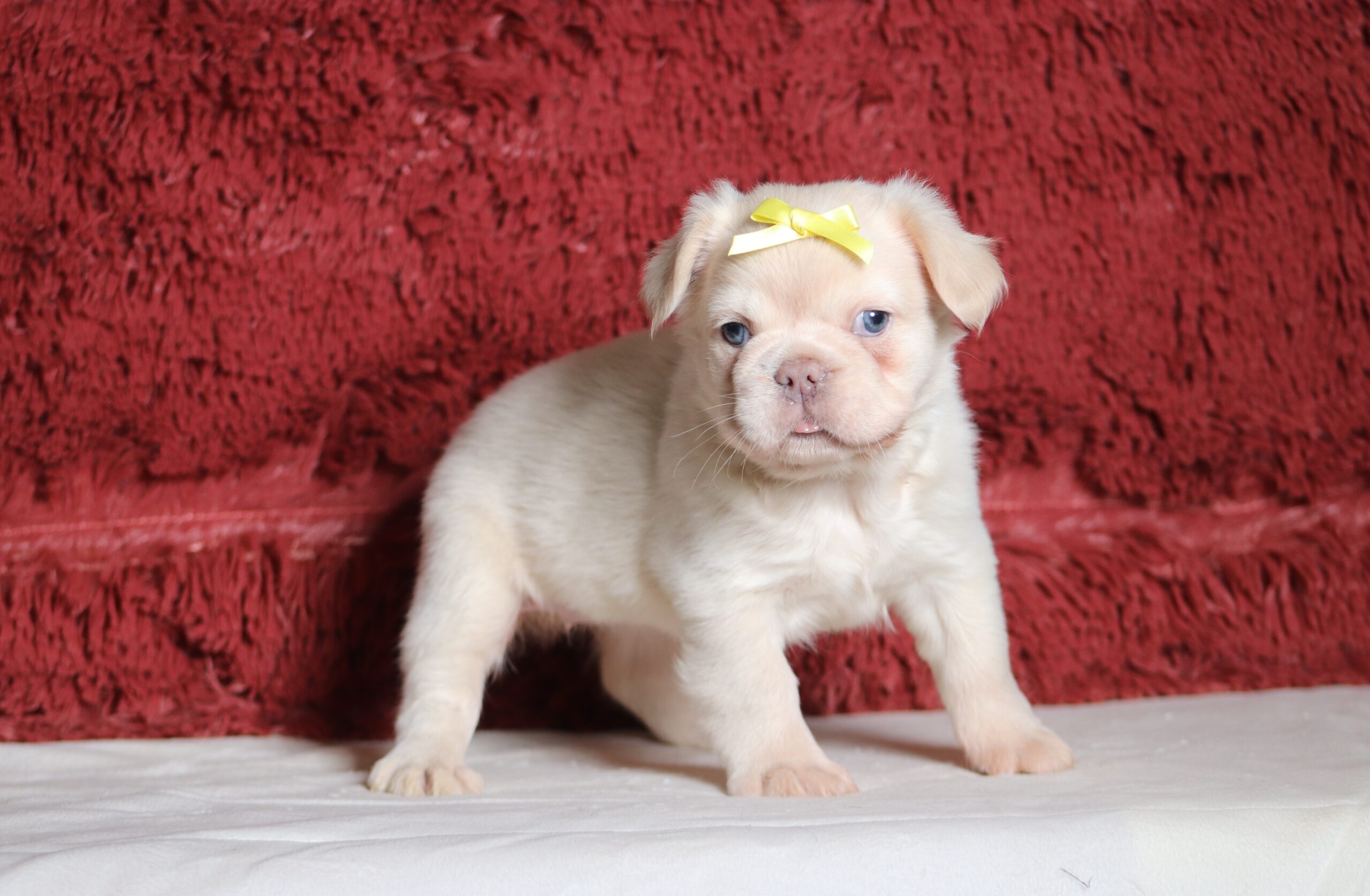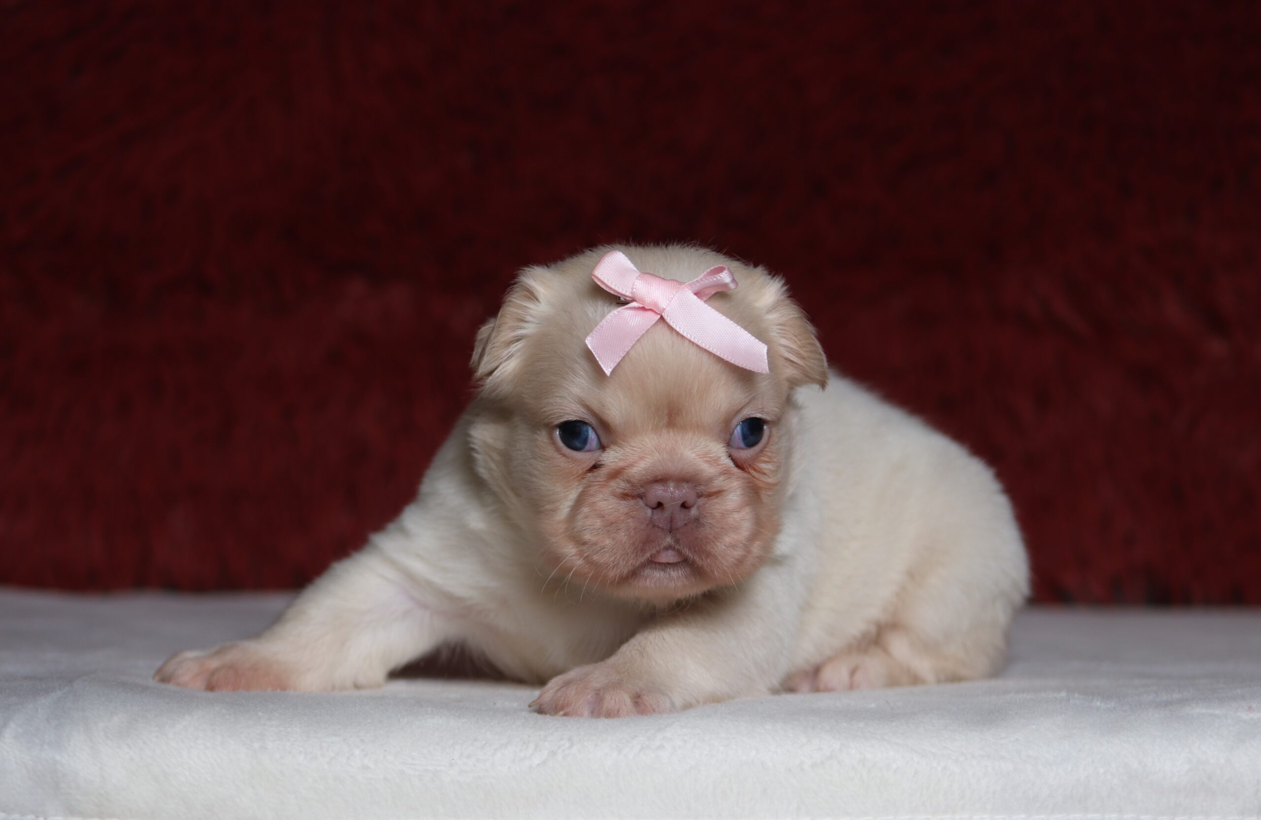 Hi there! This is Ariella a sweet little Frenchie girl! She has a beautiful cream coat and 2 shining blue eyes! She is happiest when she is with you, snuggling by your feet or going on a walk, that is just what she loves! She has a great temperament and loves to play with kids!