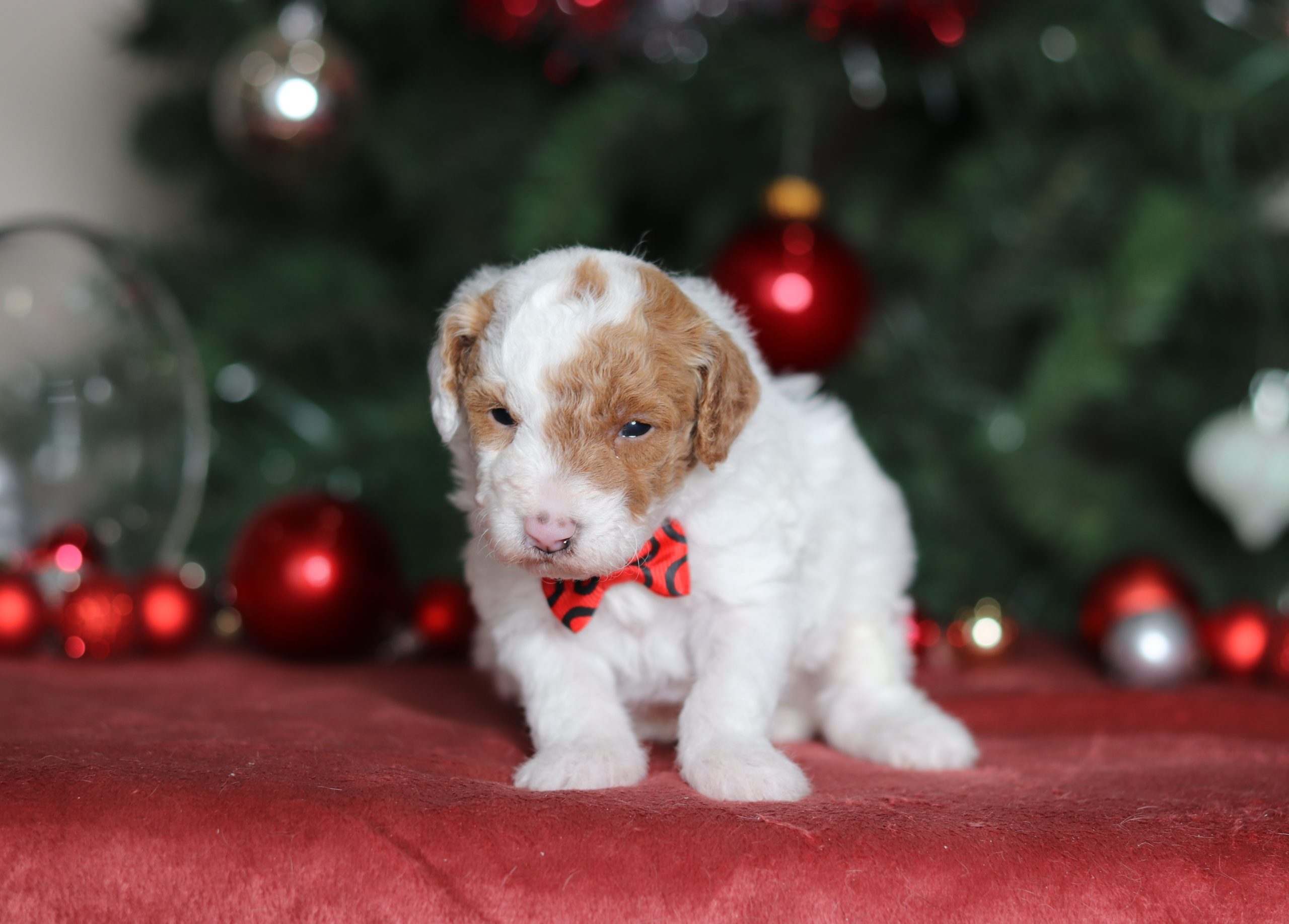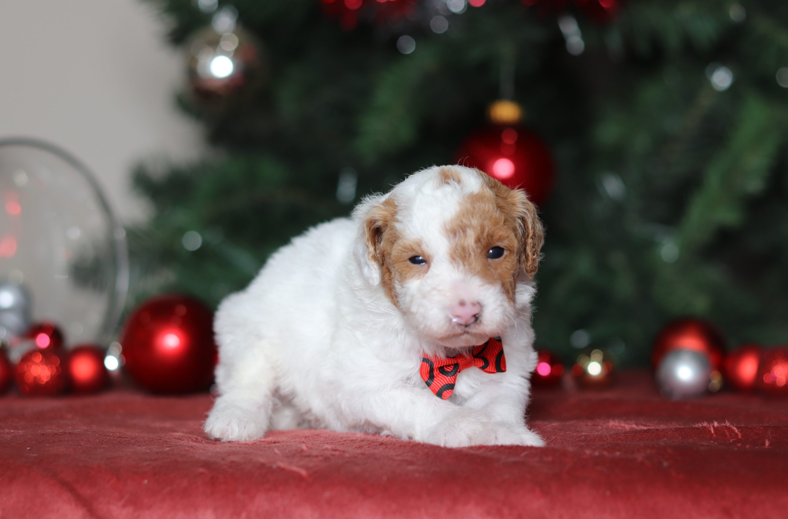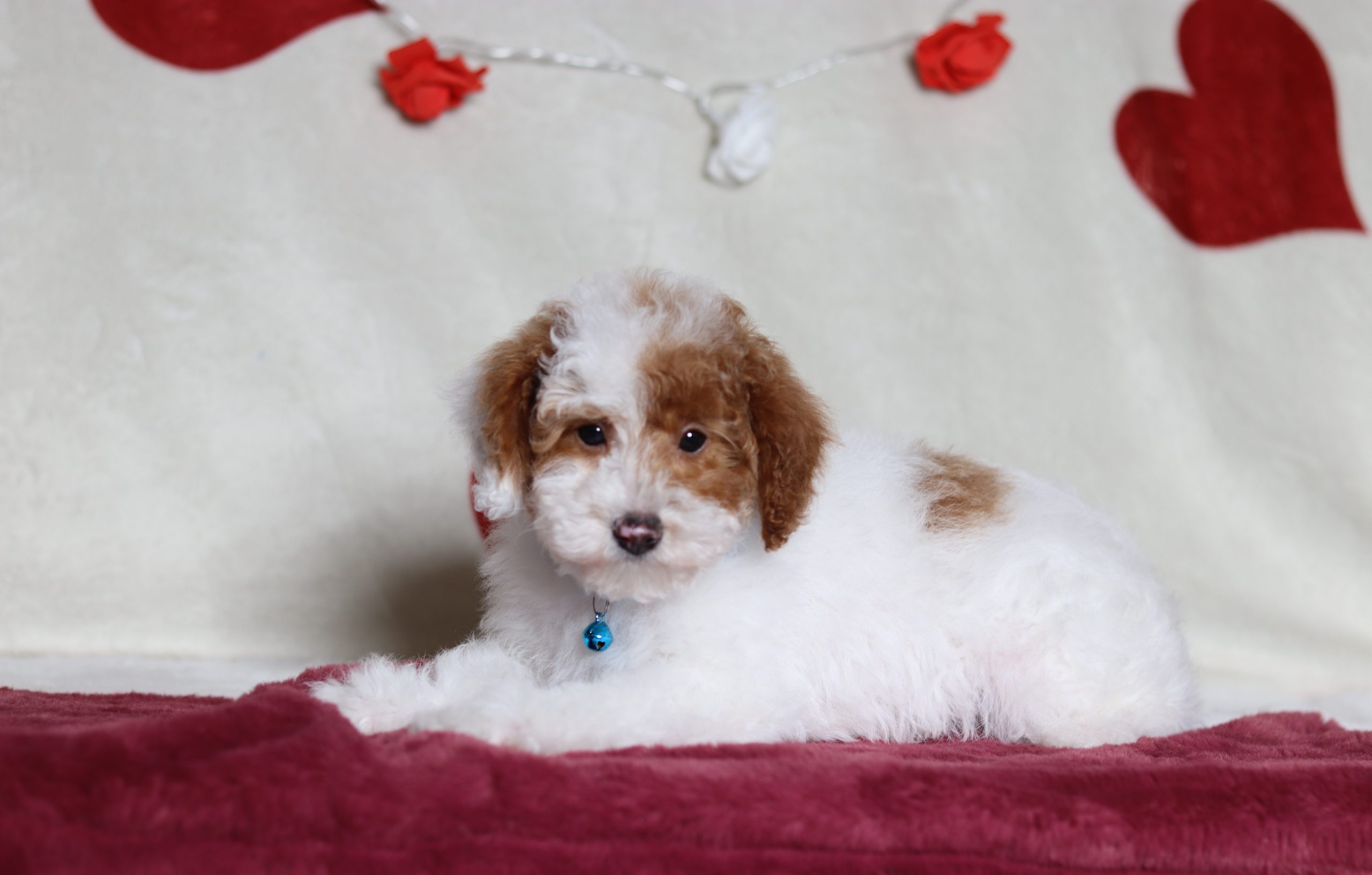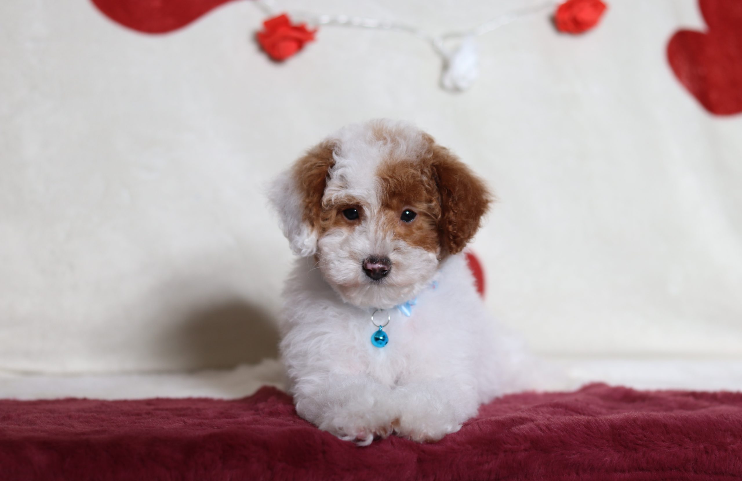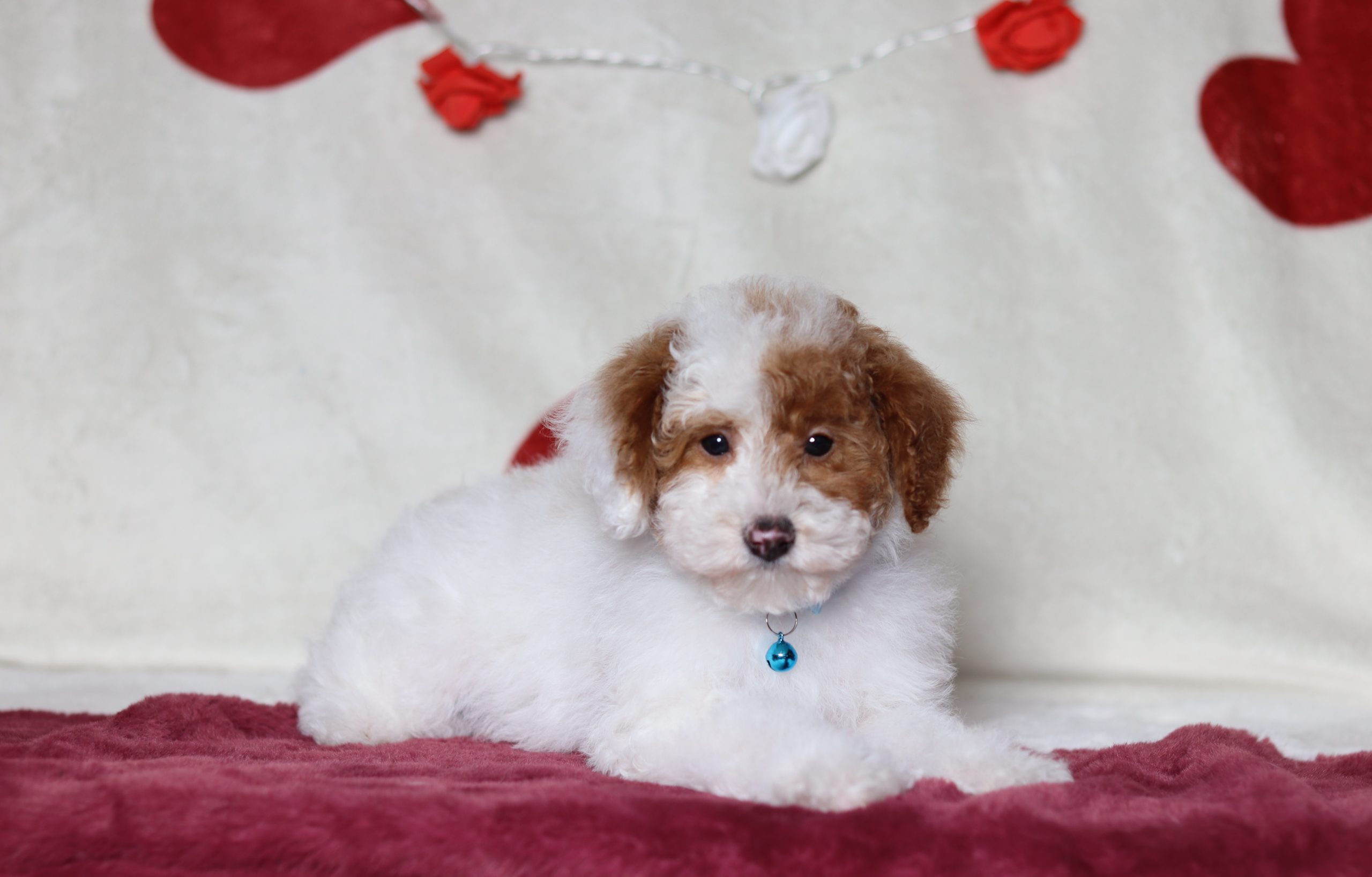 Hello, this is Barock! He’s a cute little mini poodle boy with a beautiful red and white, soft, furry coat and 2 shining eyes. He loves to play with his siblings and also loves to be held and cuddled! He will be sure to shower you with lots of kisses!