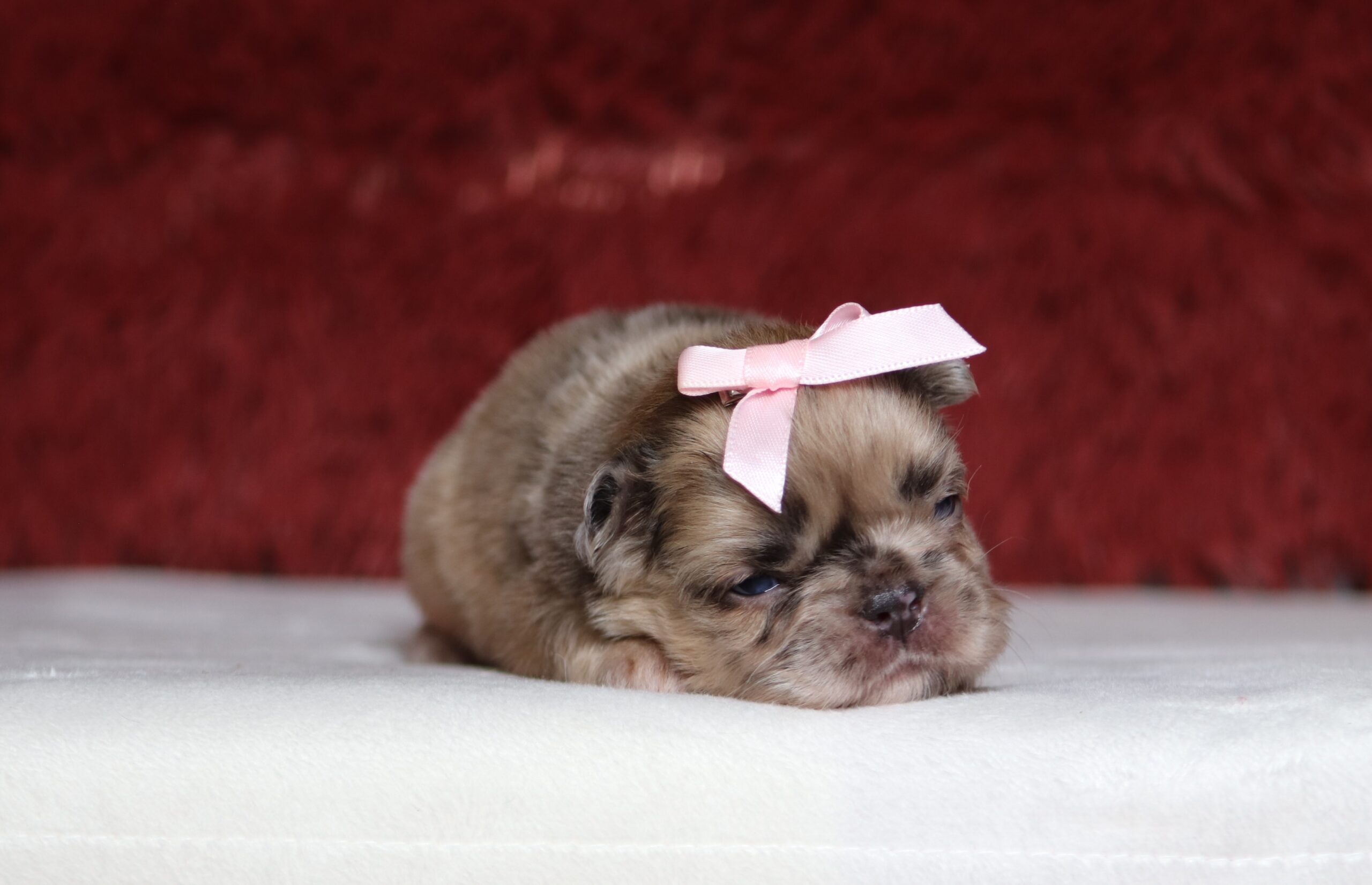 Brianna a precious sable merle, Frenchie girl! She enjoys every minute of snuggling together! She loves being pampered and getting belly rubs! She did great with (ENS) Early Neurological Stimulation and enjoys playing with toys and running around! She is a friendly and adorable girl!
