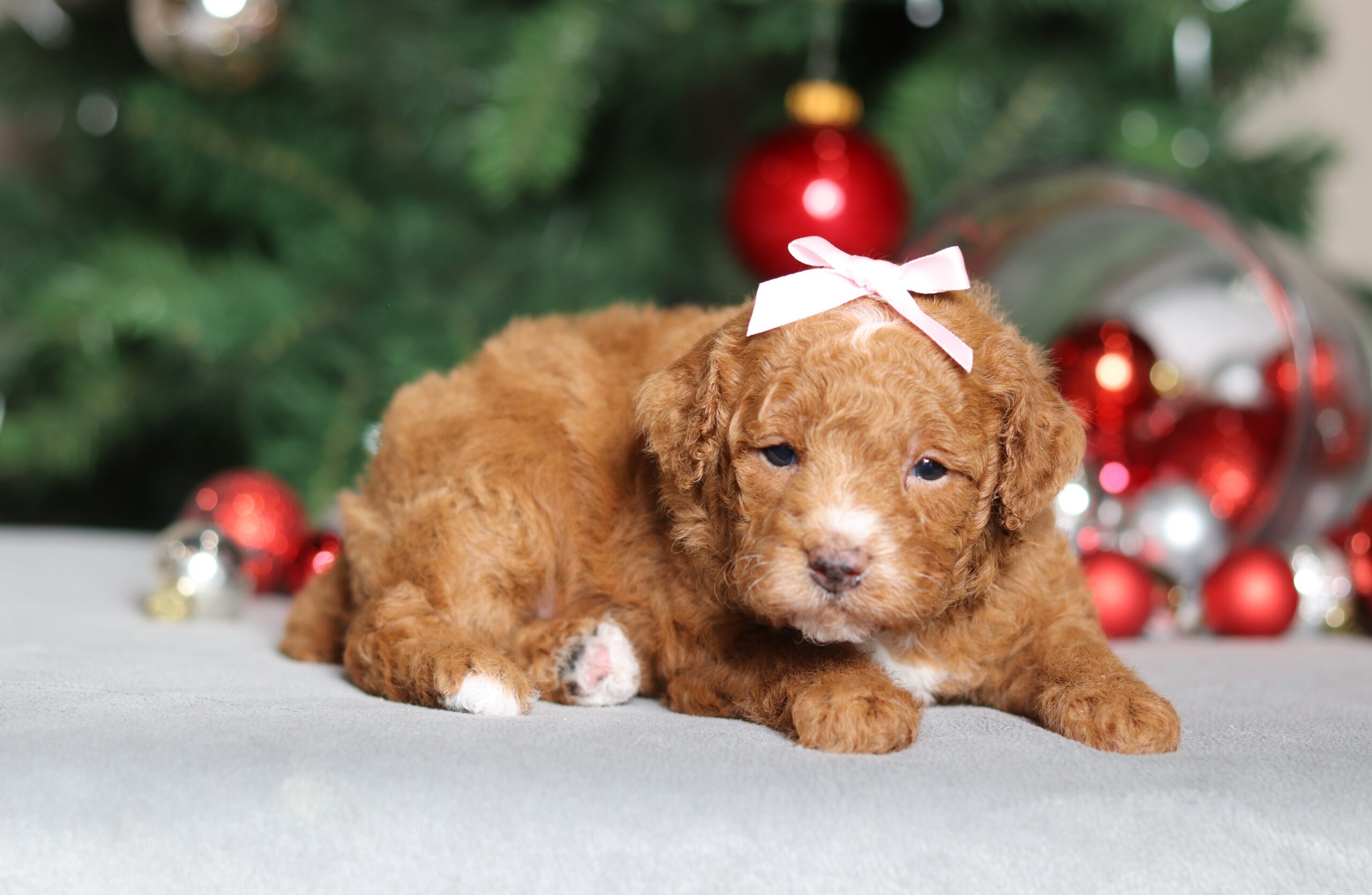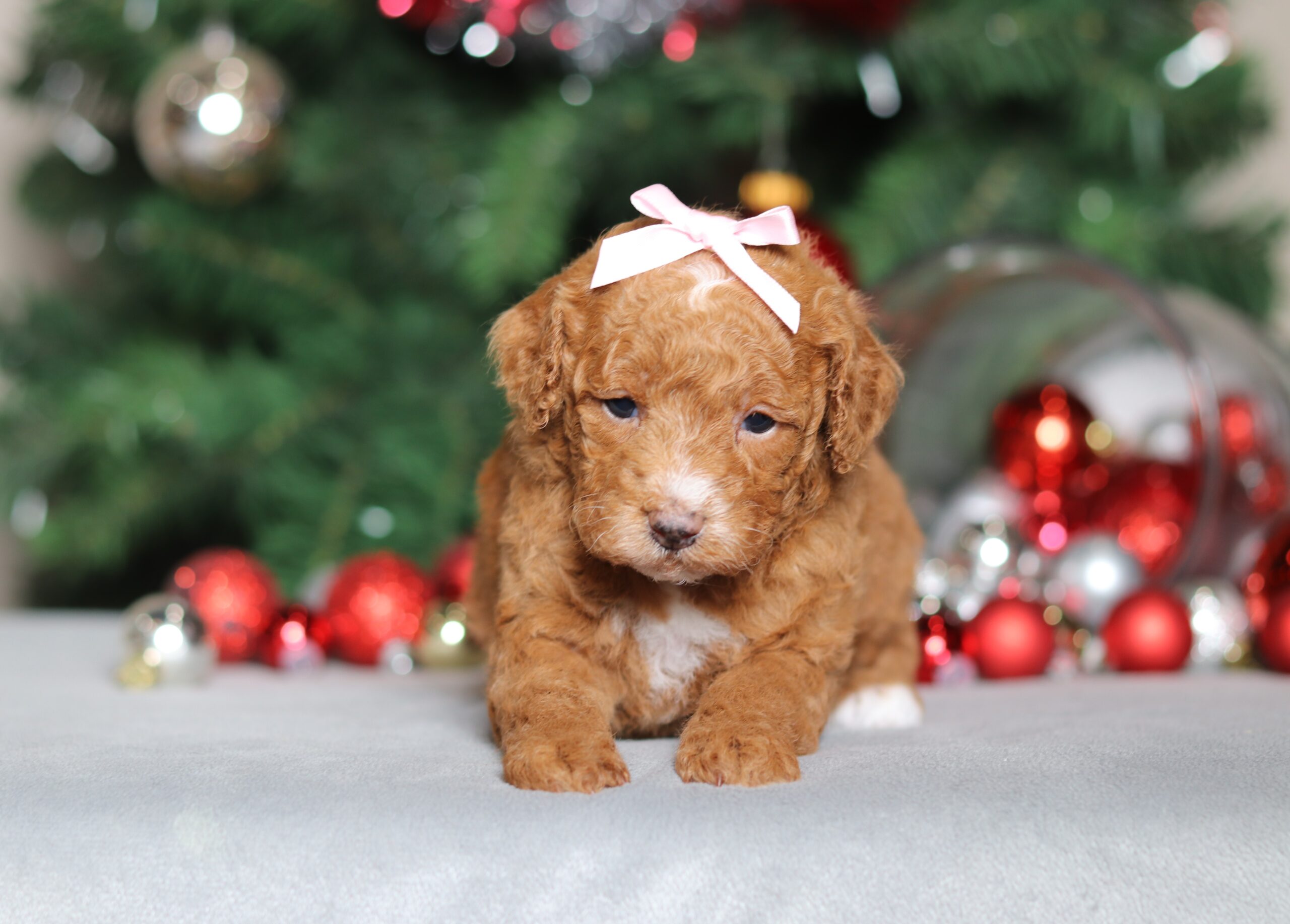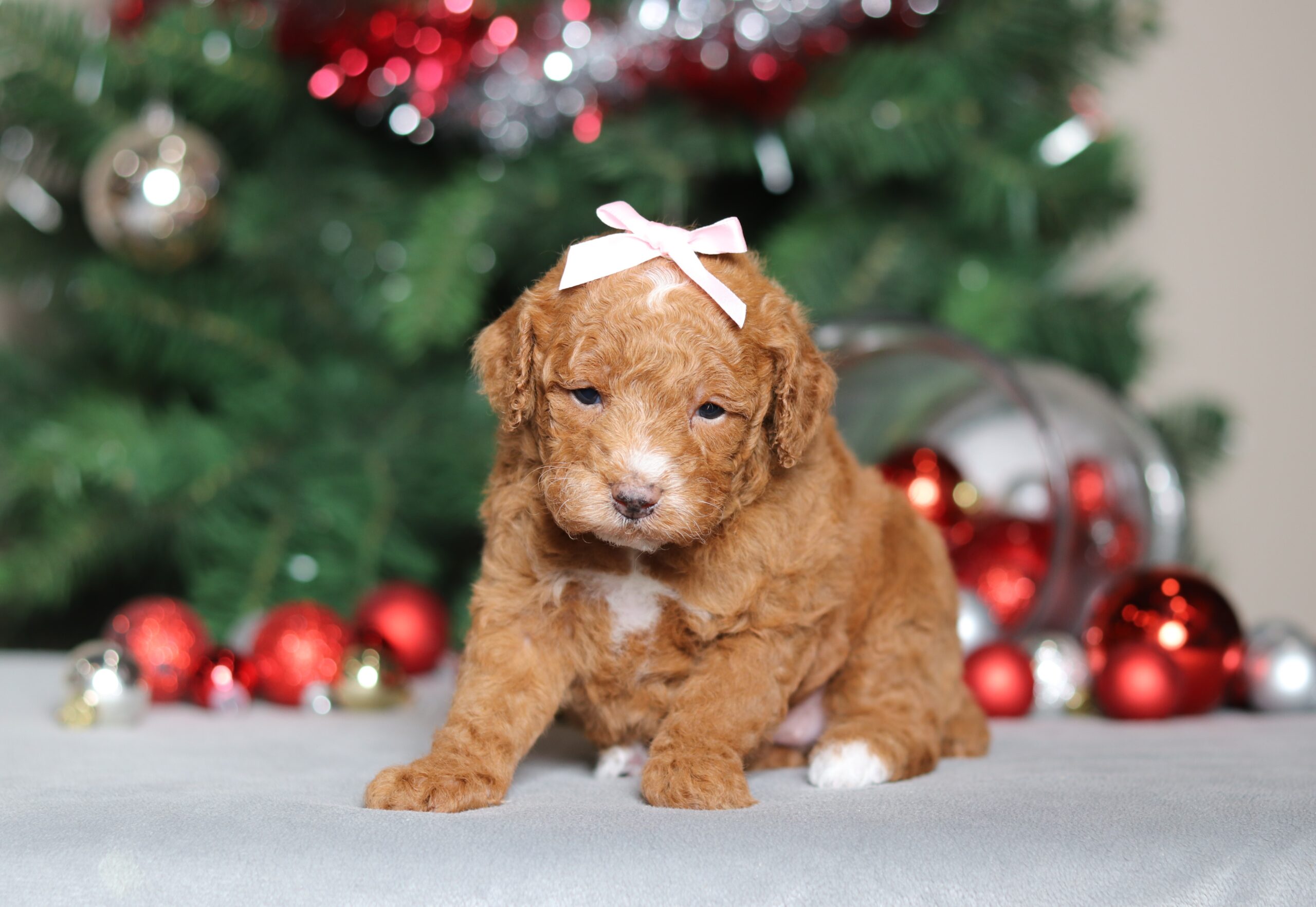 Hi there! This is Bristol a sweet little Mini Poodle girl! She has a beautiful, red coat! She is happiest when she is with you, snuggling by your feet or cuddling on your lap, that is just what she loves! She has a great temperament and loves to play with kids!