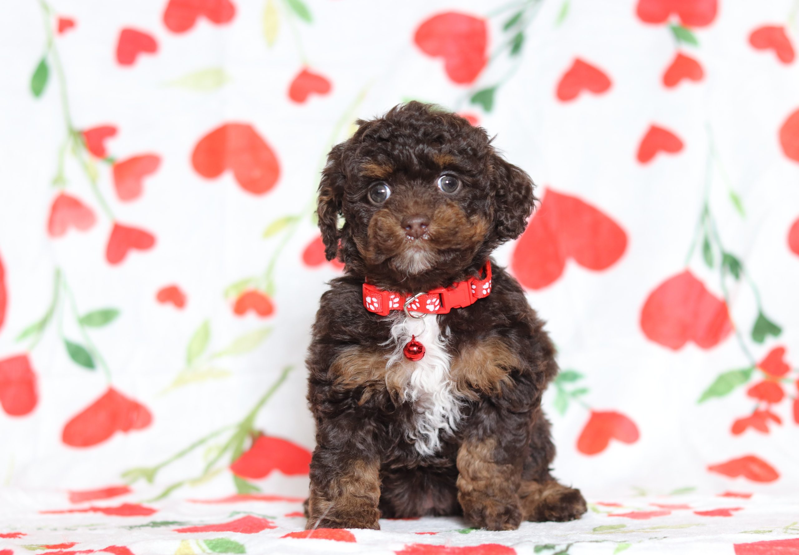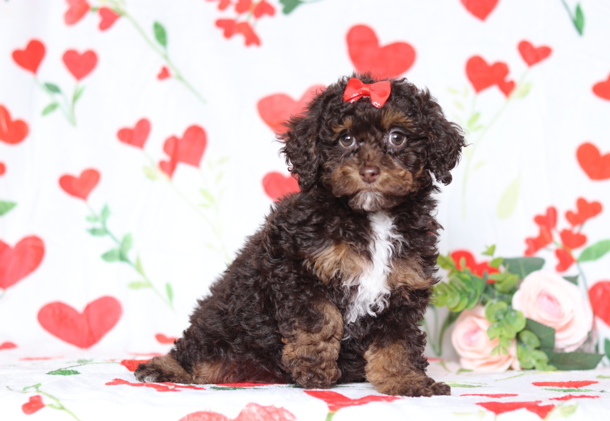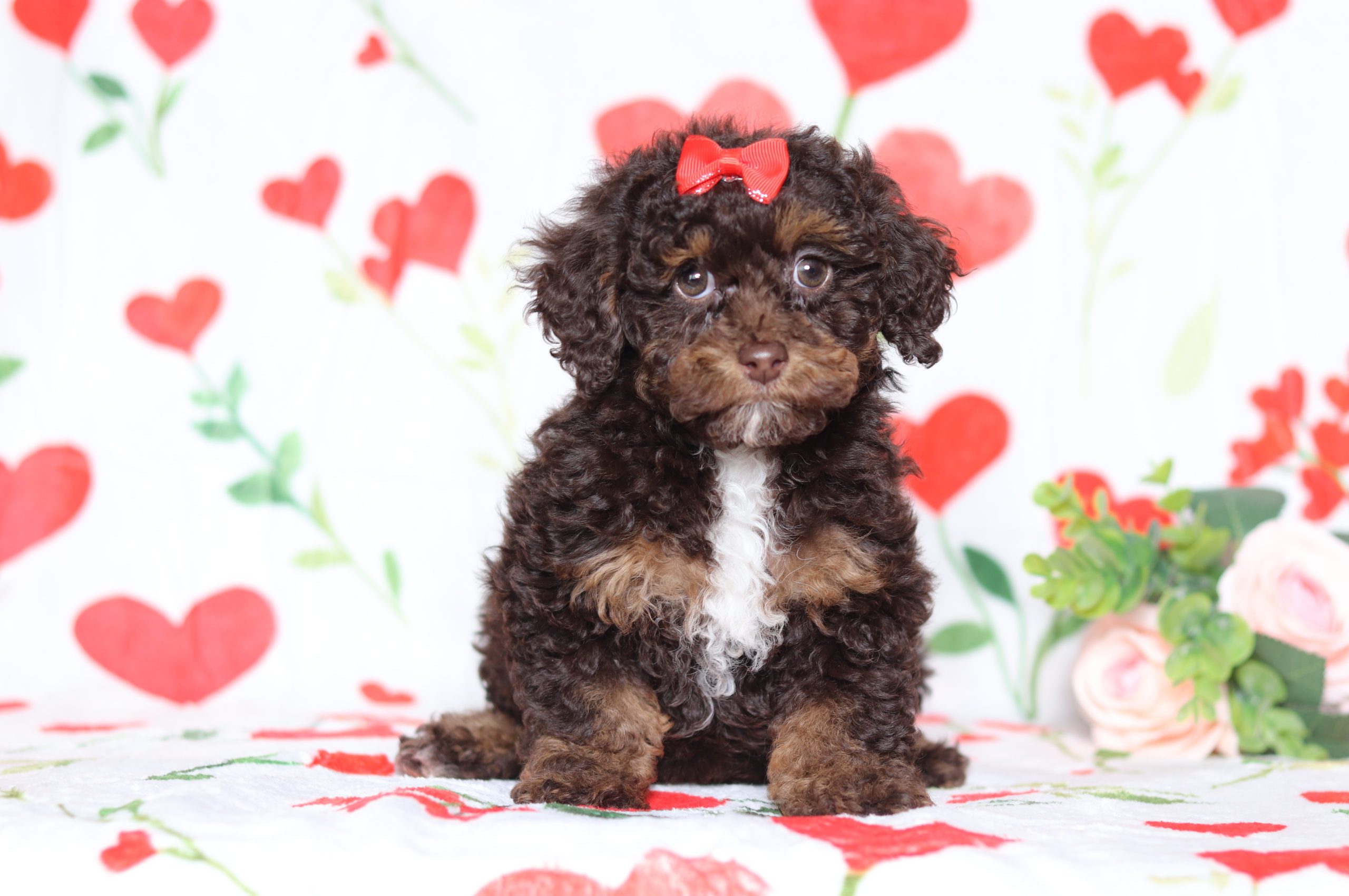 Hello, this is Darcy! She’s a cute little mini poodle girl with a beautiful chocolate and white soft, furry coat and 2 shining eyes. She loves to play with toys! She will be sure to shower you with lots of kisses!