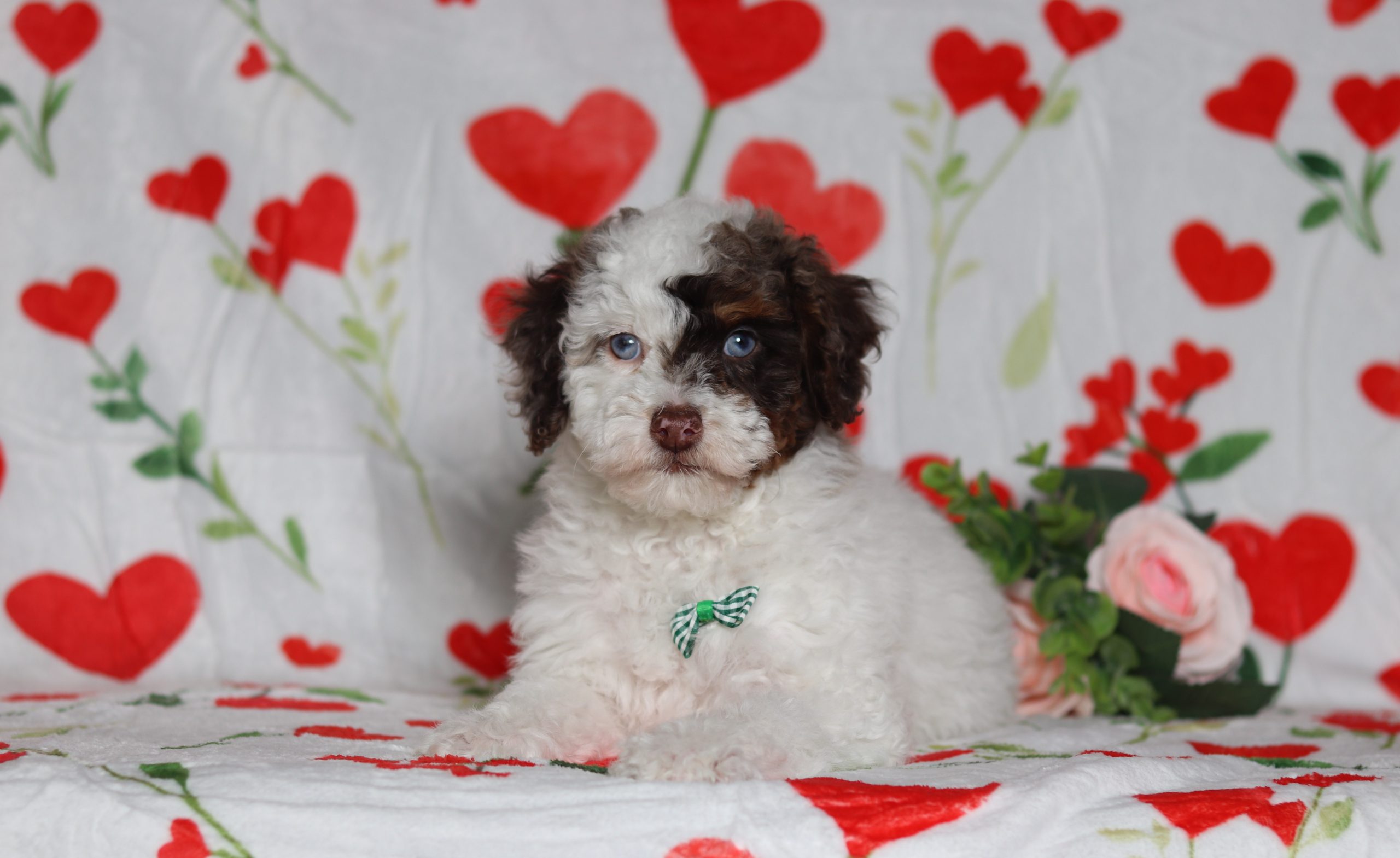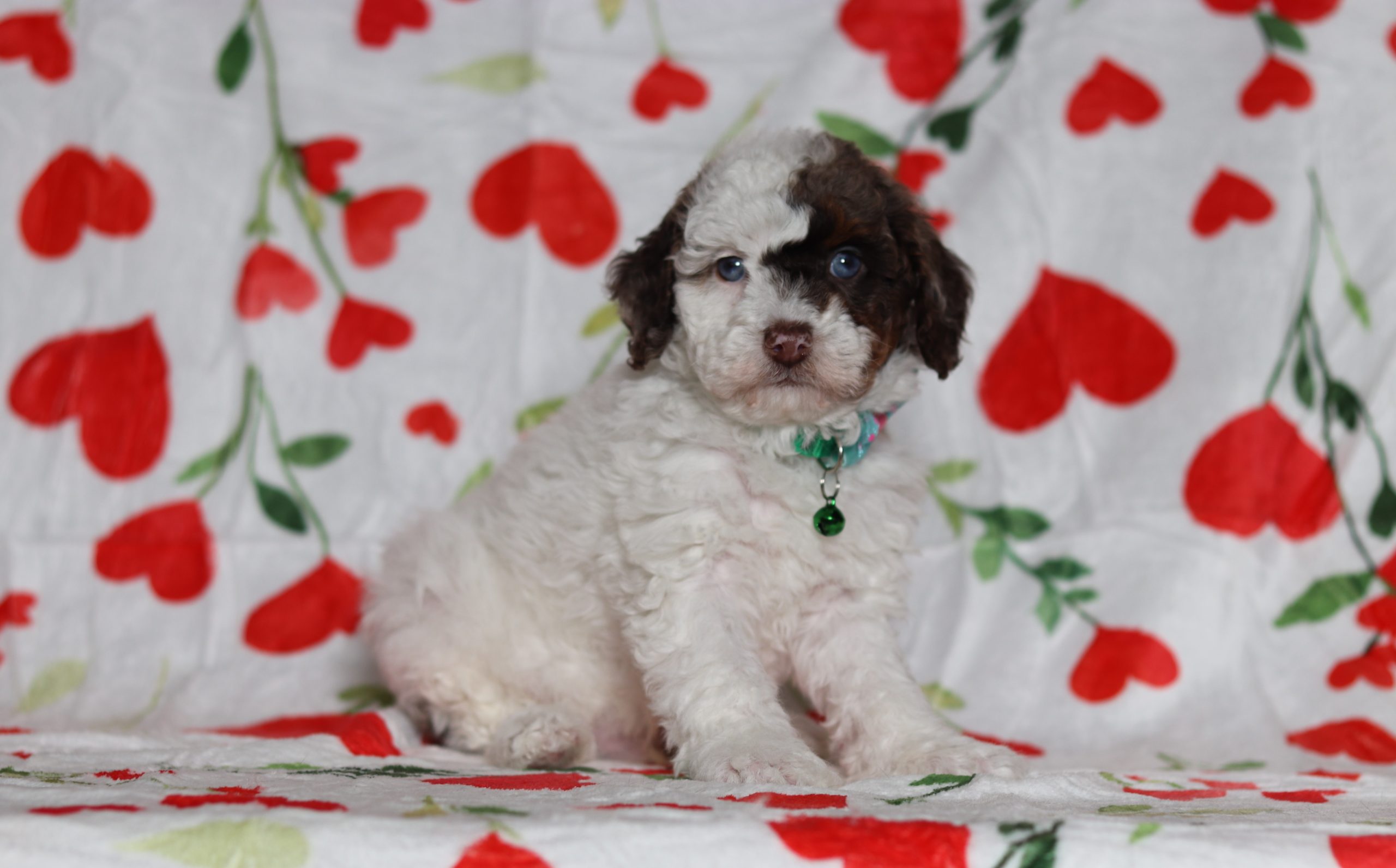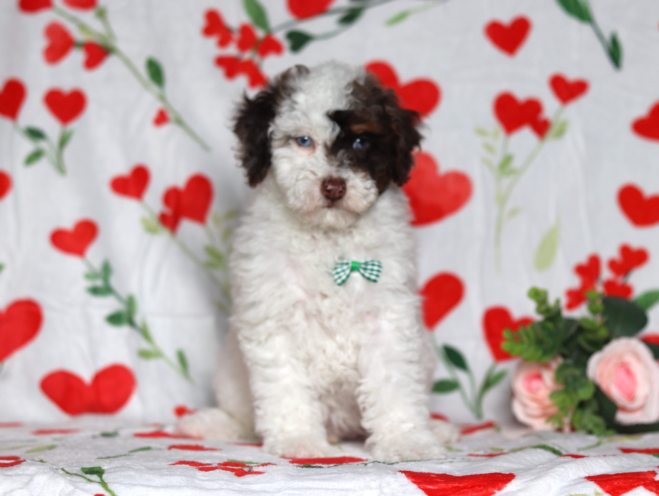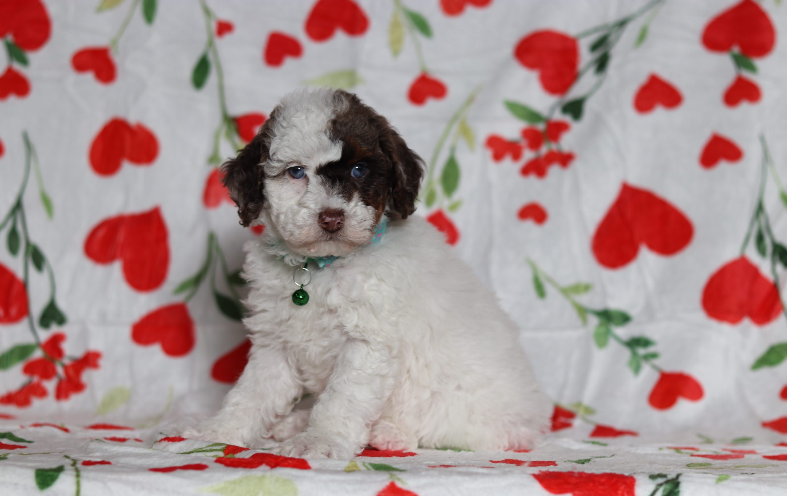Daryl, a precious little Mini Poodle boy! He has a nice white merle coat and 2 shining blue eyes! He loves being pampered and getting belly rubs! He did great with (ENS) Early Neurological Stimulation and enjoys playing with toys and running around! He is a friendly and adorable little boy!