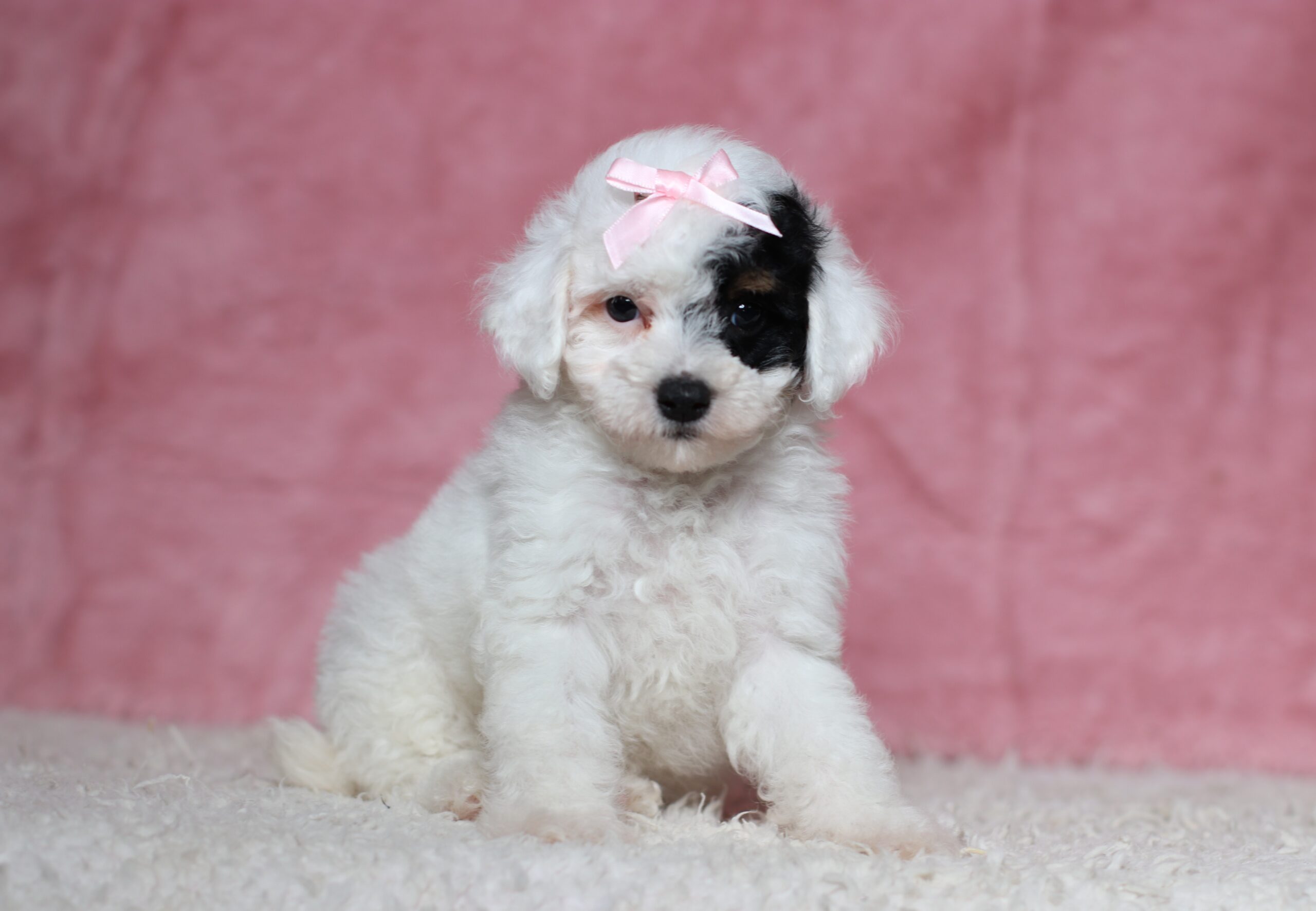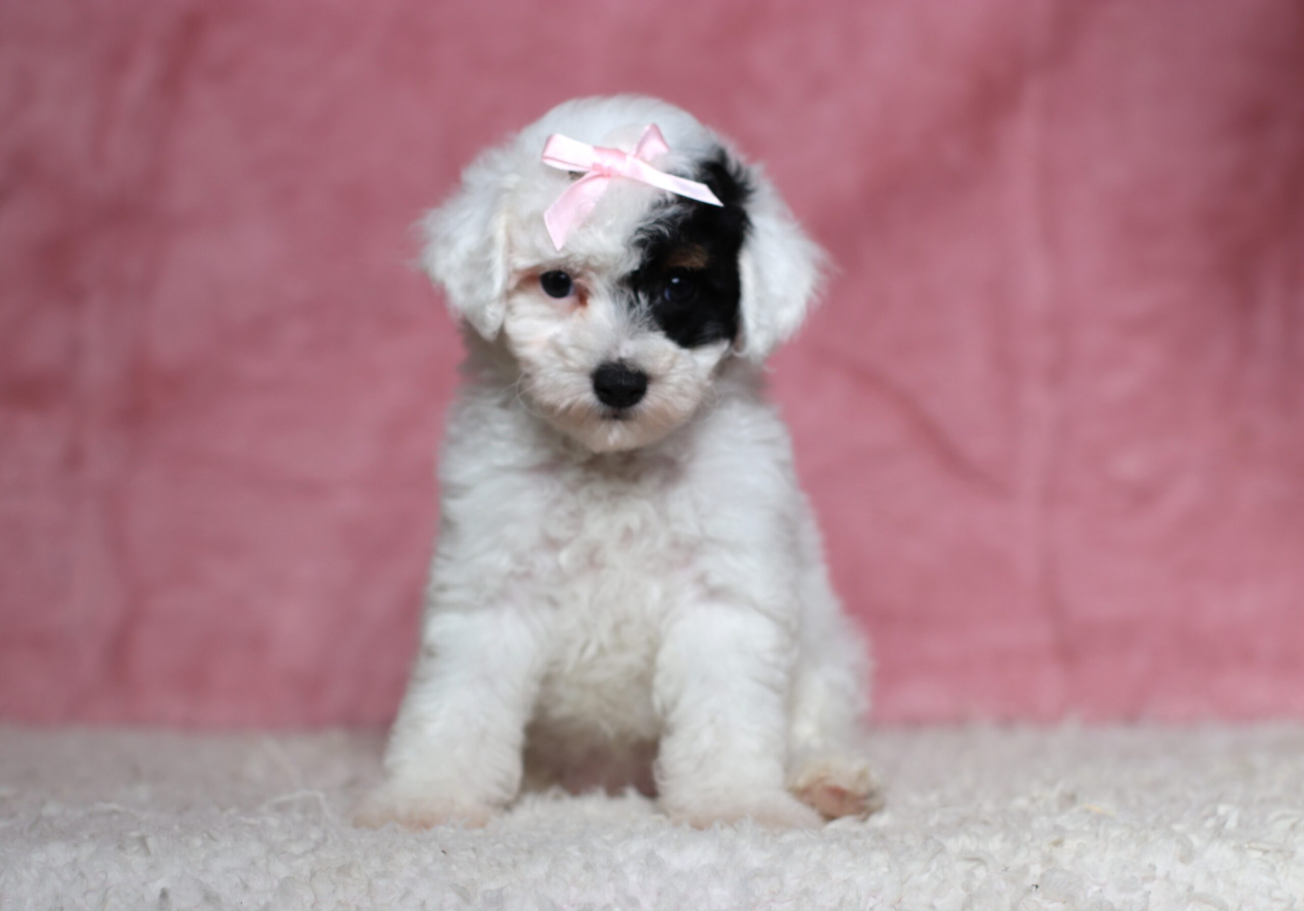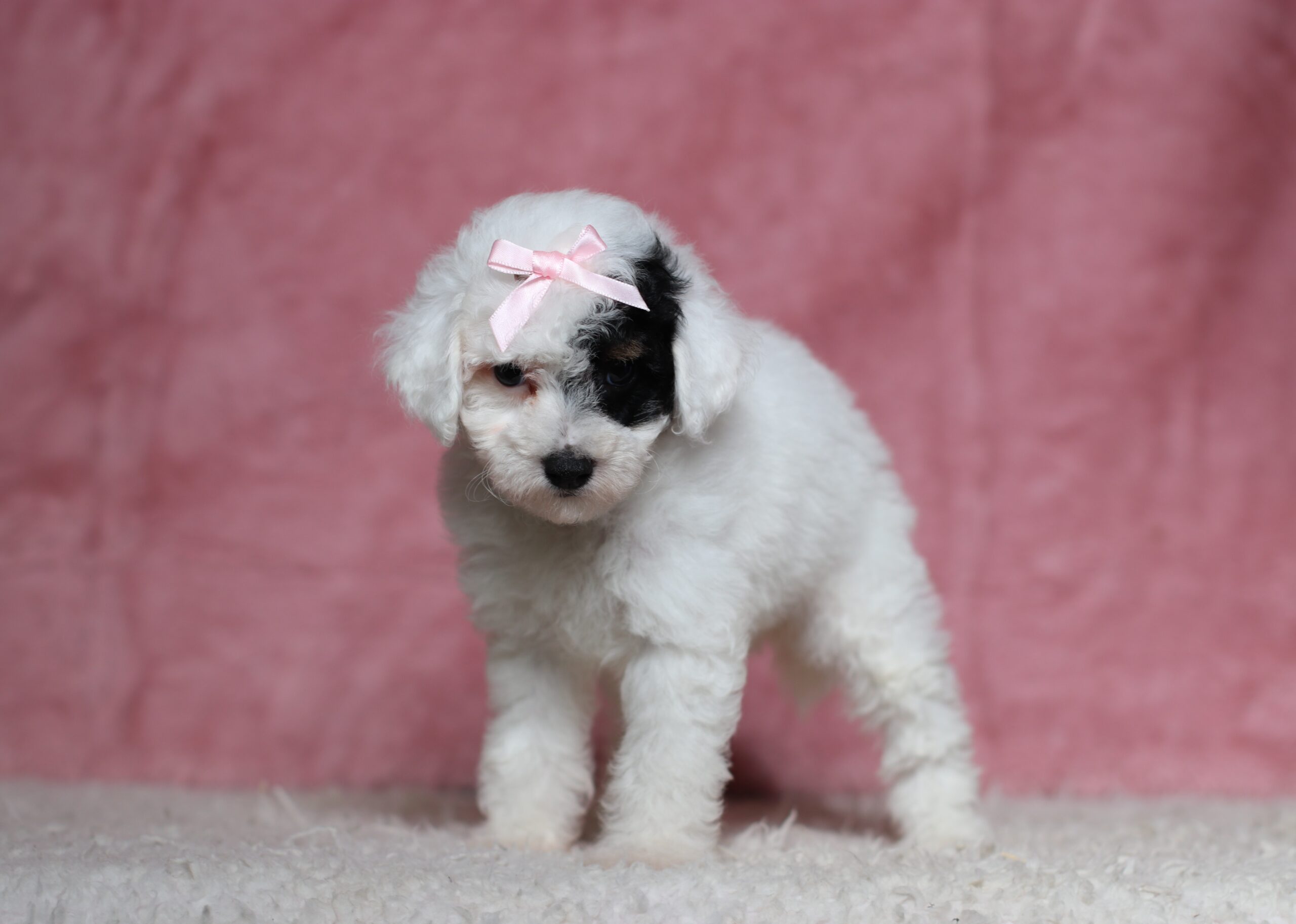Dawn the Mini Poodle is very caring and sweet she has a clean white coat color and a black patch with a tan point by her one eye! She is such a cheerful little girl a great companion to her littermates! Her temperament is wonderful, some of her favorites is playing outdoors and going on a walk to explore and sniff new things! She is eager to please and a bundle of love!