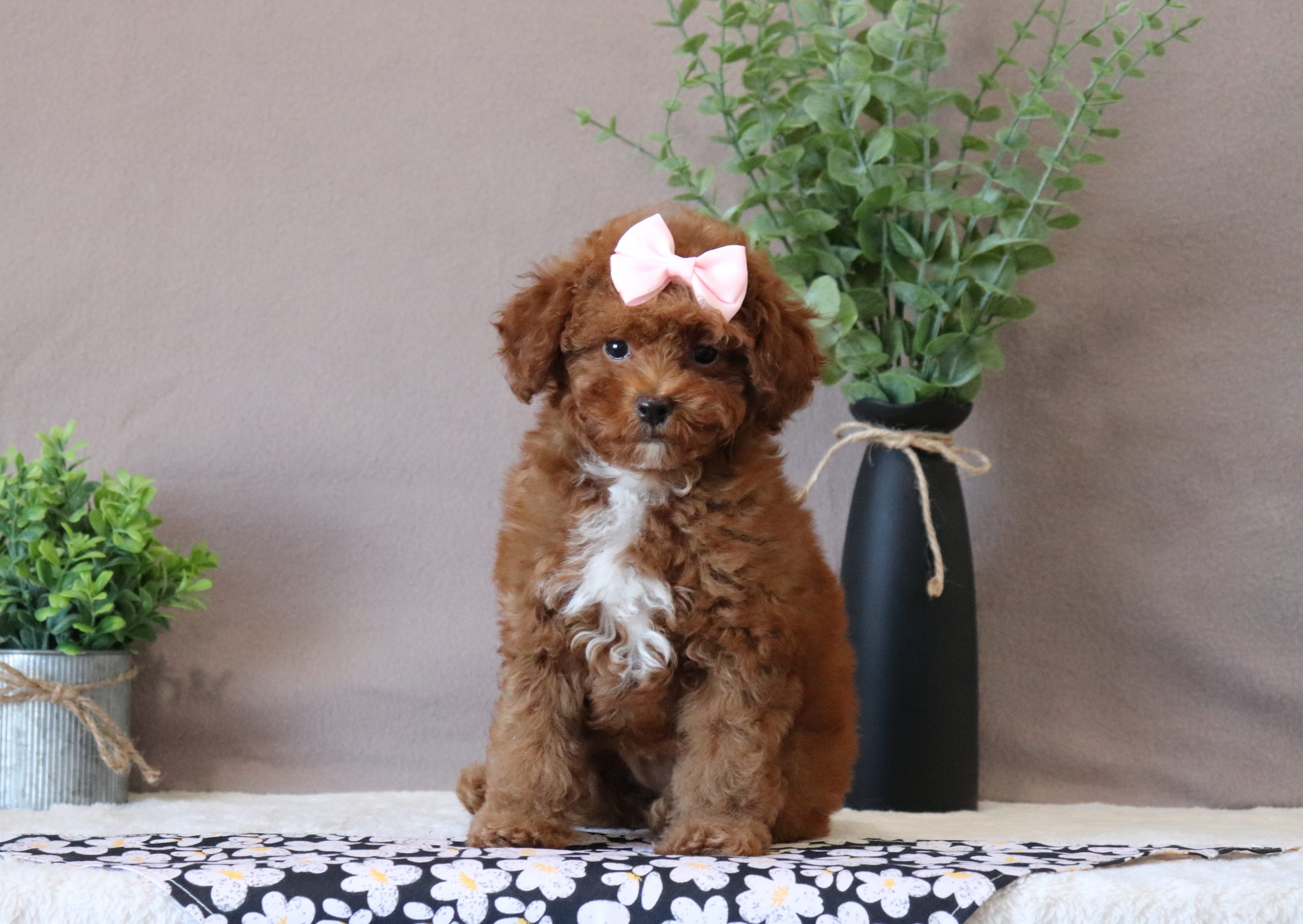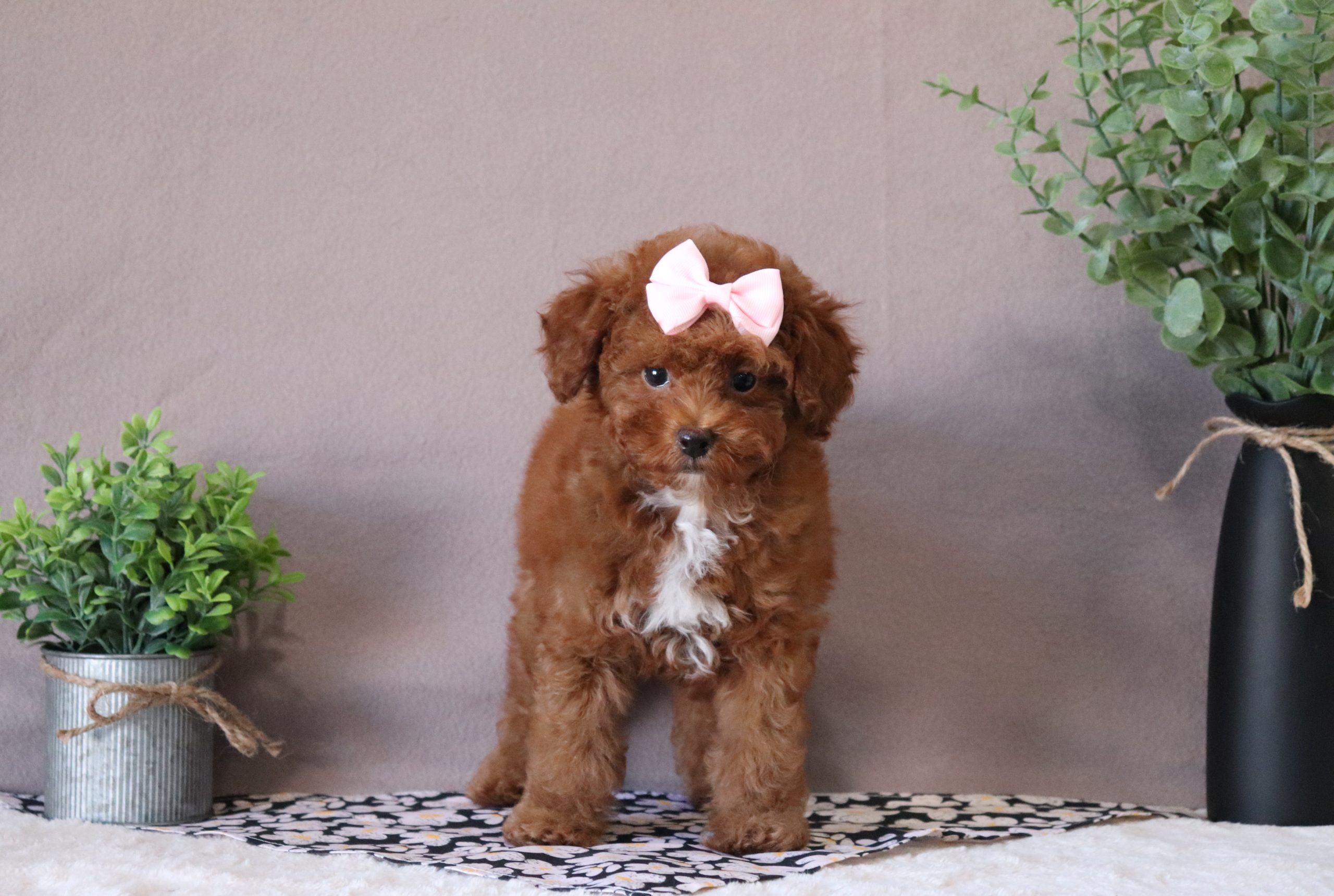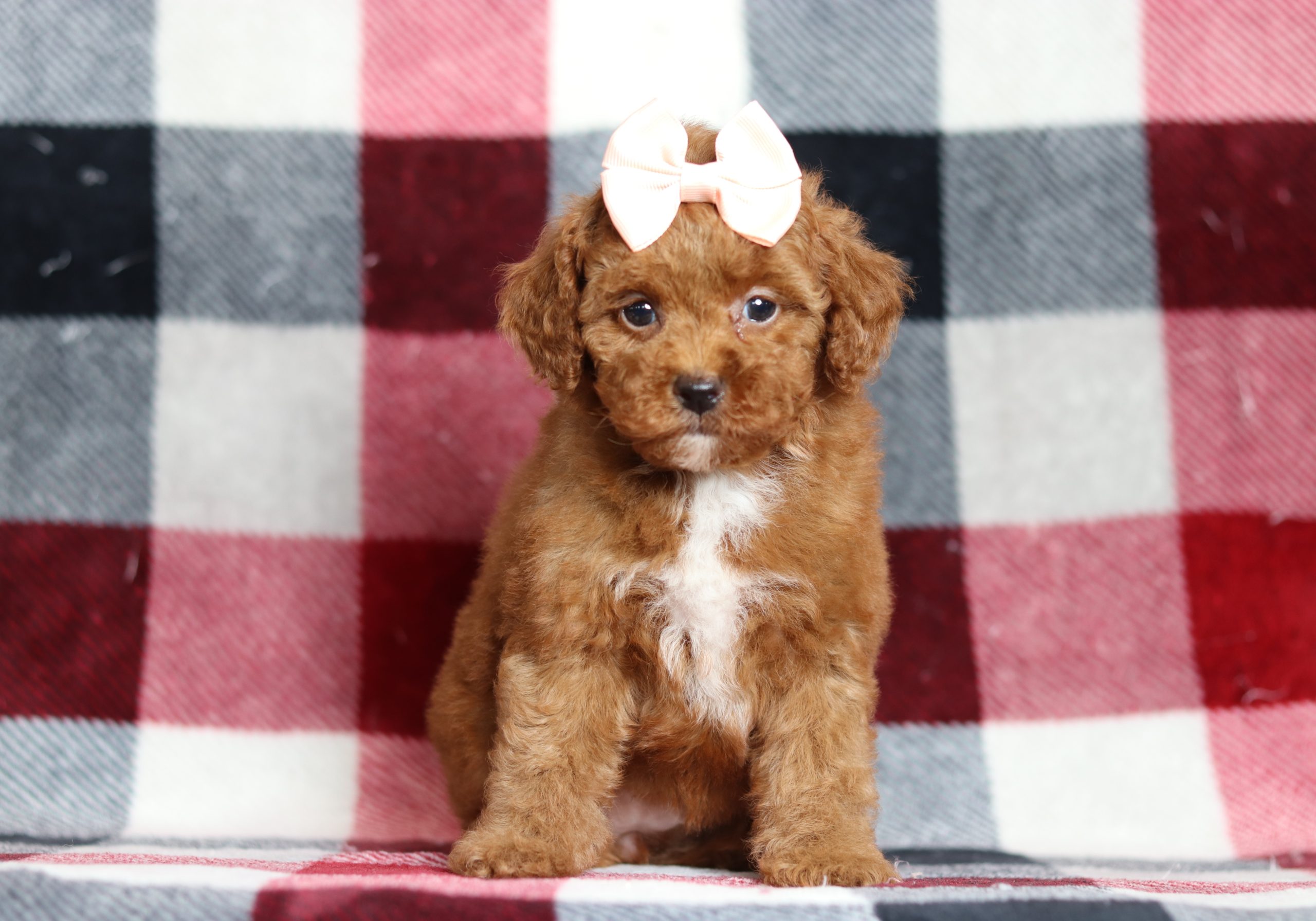 Hello, this is Debbie! She’s a cute little mini poodle girl, with a red and white soft, furry coat and 2 shining eyes. She loves to play with her siblings and also loves to be held and cuddled! She will be sure to shower you with lots of kisses!