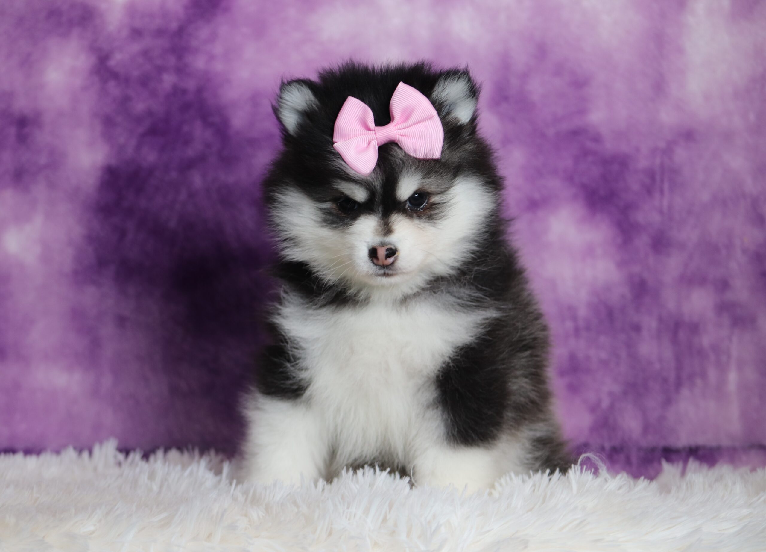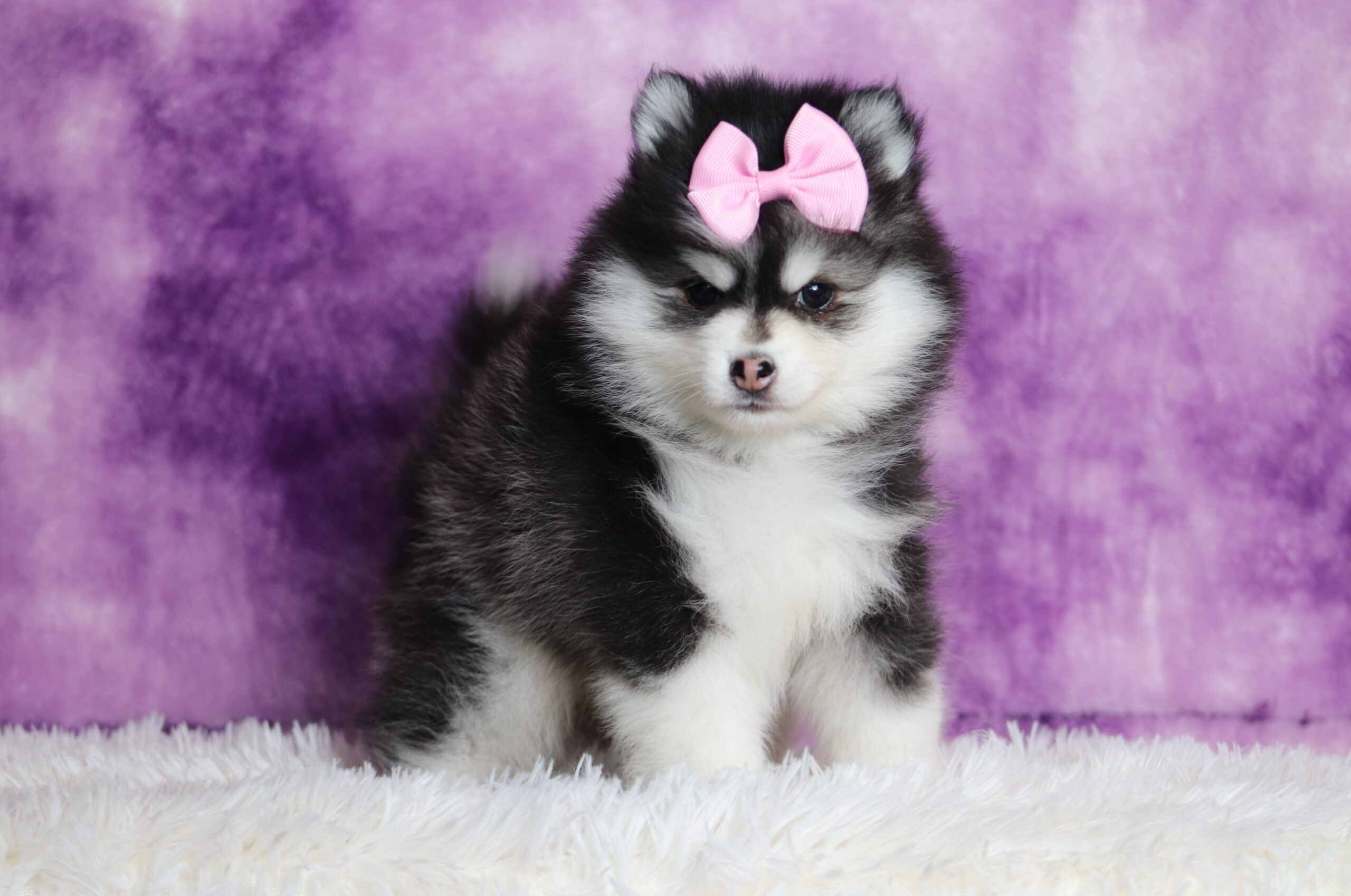 Denise the Pomsky girl is an absolute cutie, she has a beautiful fluffy black and white coat, enjoys playing outdoors and is very adventurous! Some of her favorites include being pampered and getting belly rubs! She loves getting all the attention!