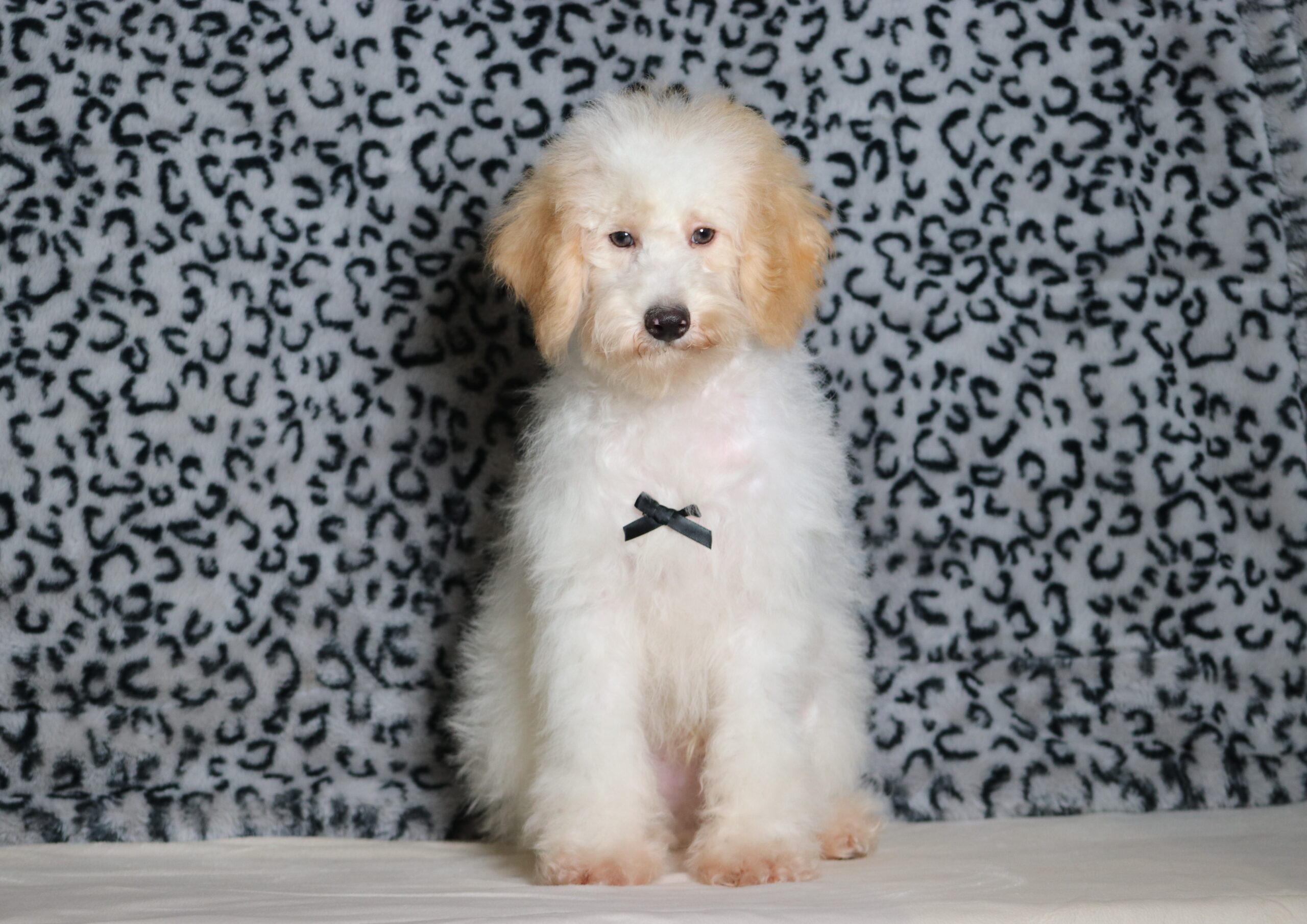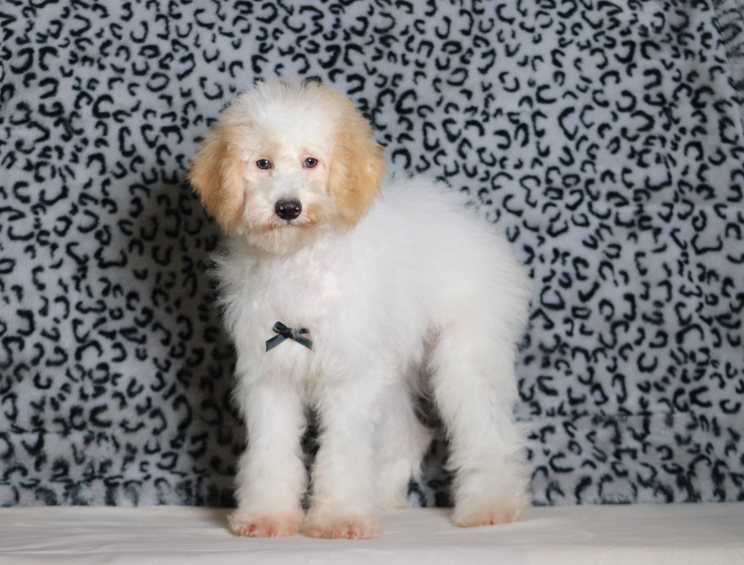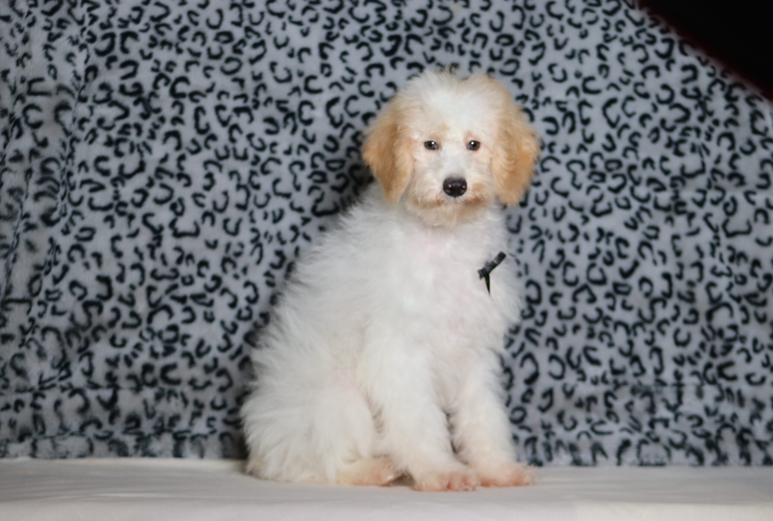 Hello, this is Edgar! He’s a cute looking little Mini Poodle boy with a light apricot and white, soft, furry coat and 2 shining eyes. He loves to romp and play with his siblings and also loves to spend time playing in the yard! He will be sure to shower you with lots of kisses!