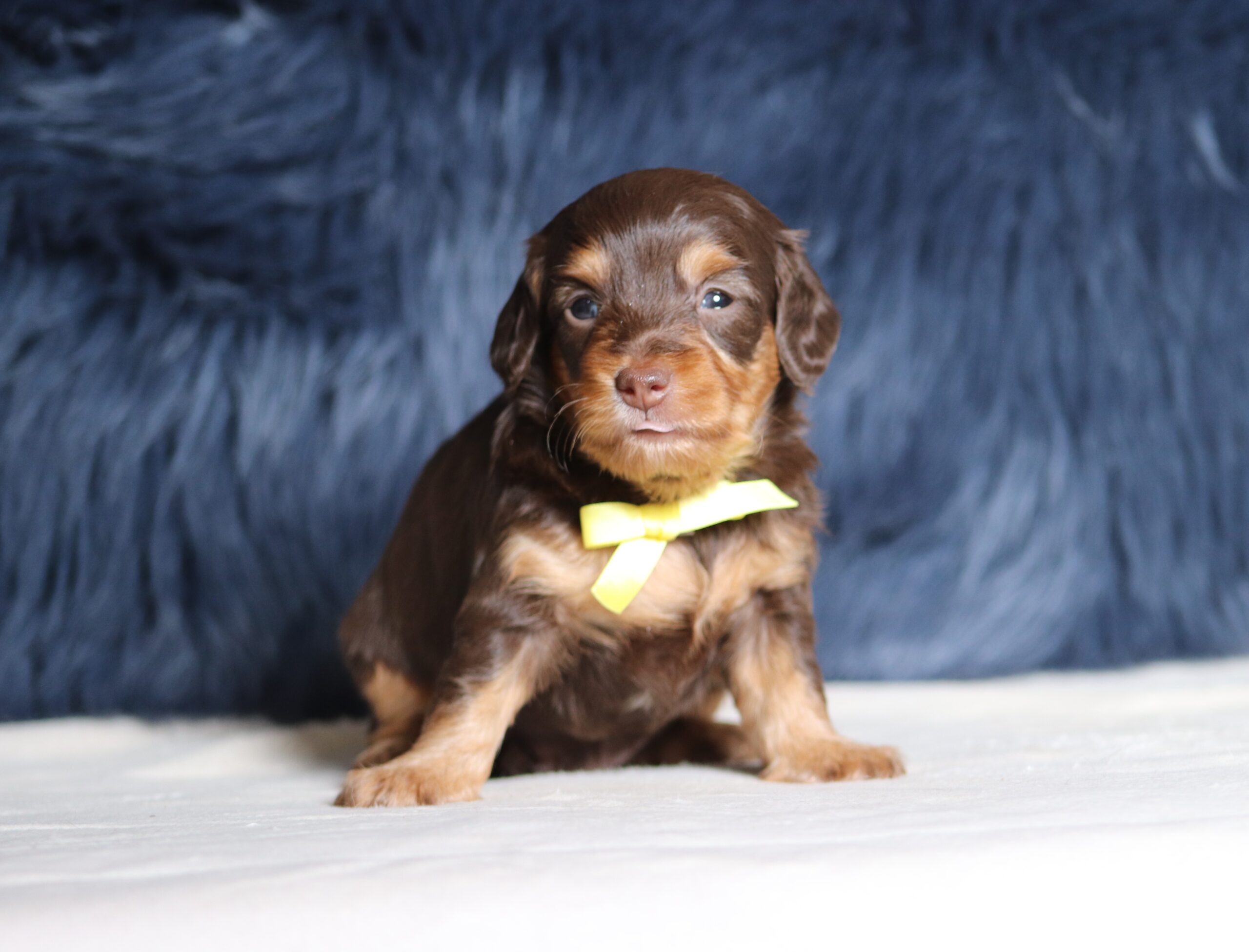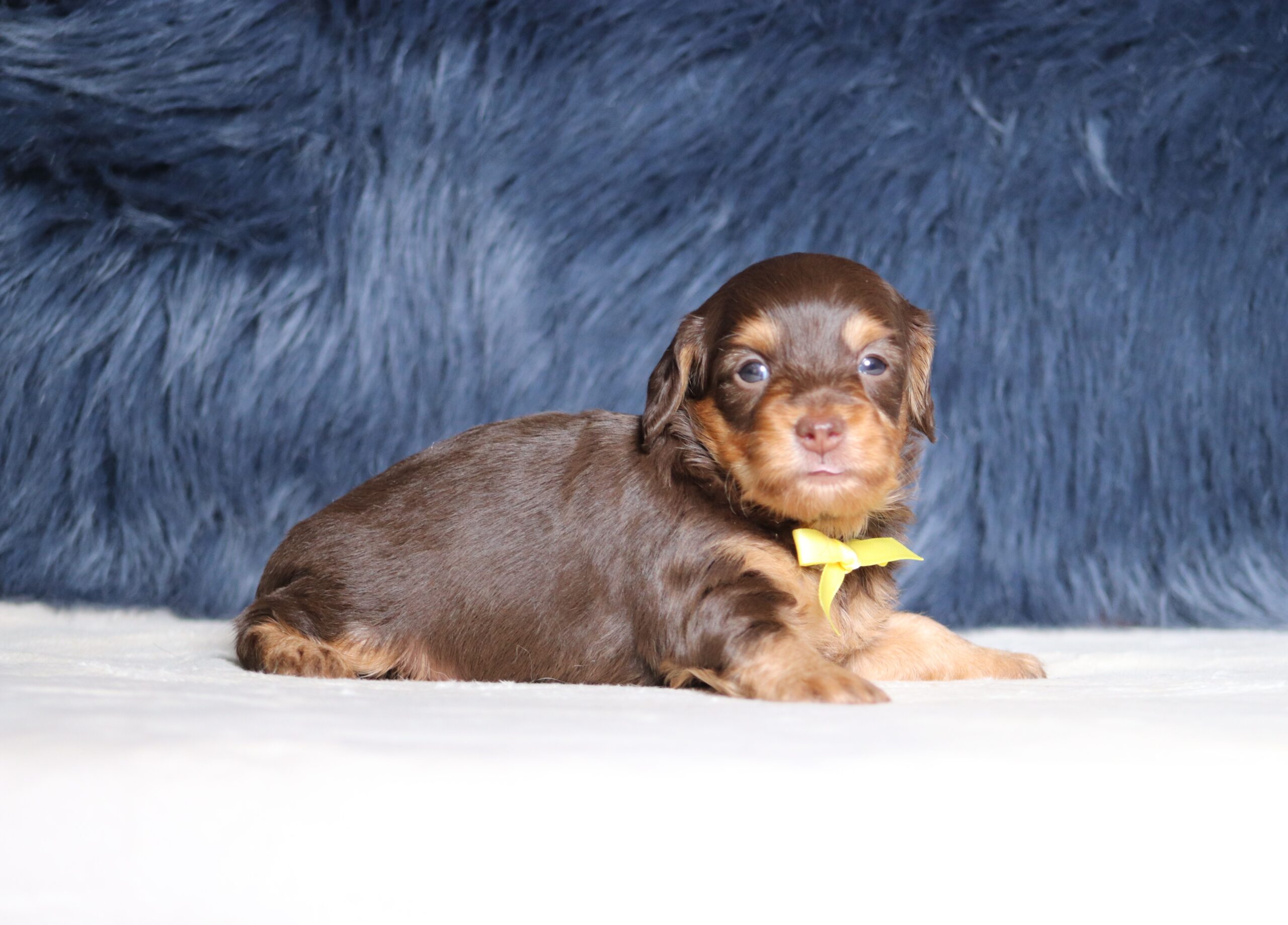Hello, this is Ethan! He’s a cute looking little Doxiedoodle boy with a lighter chocolate and tan coat and 2 shining eyes. He loves to play with his siblings and also loves to be held and cuddled! He will be sure to shower you with lots of kisses!