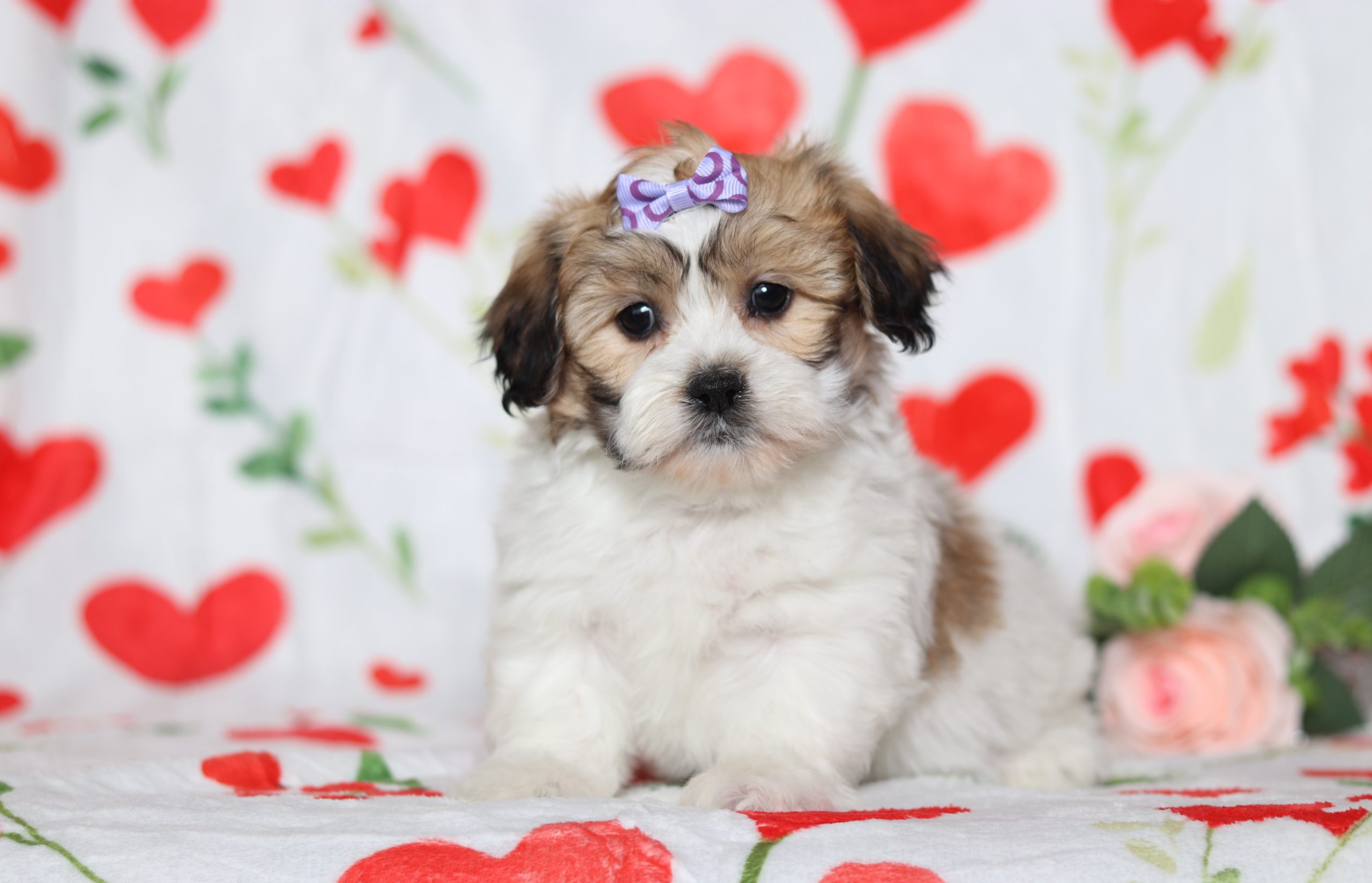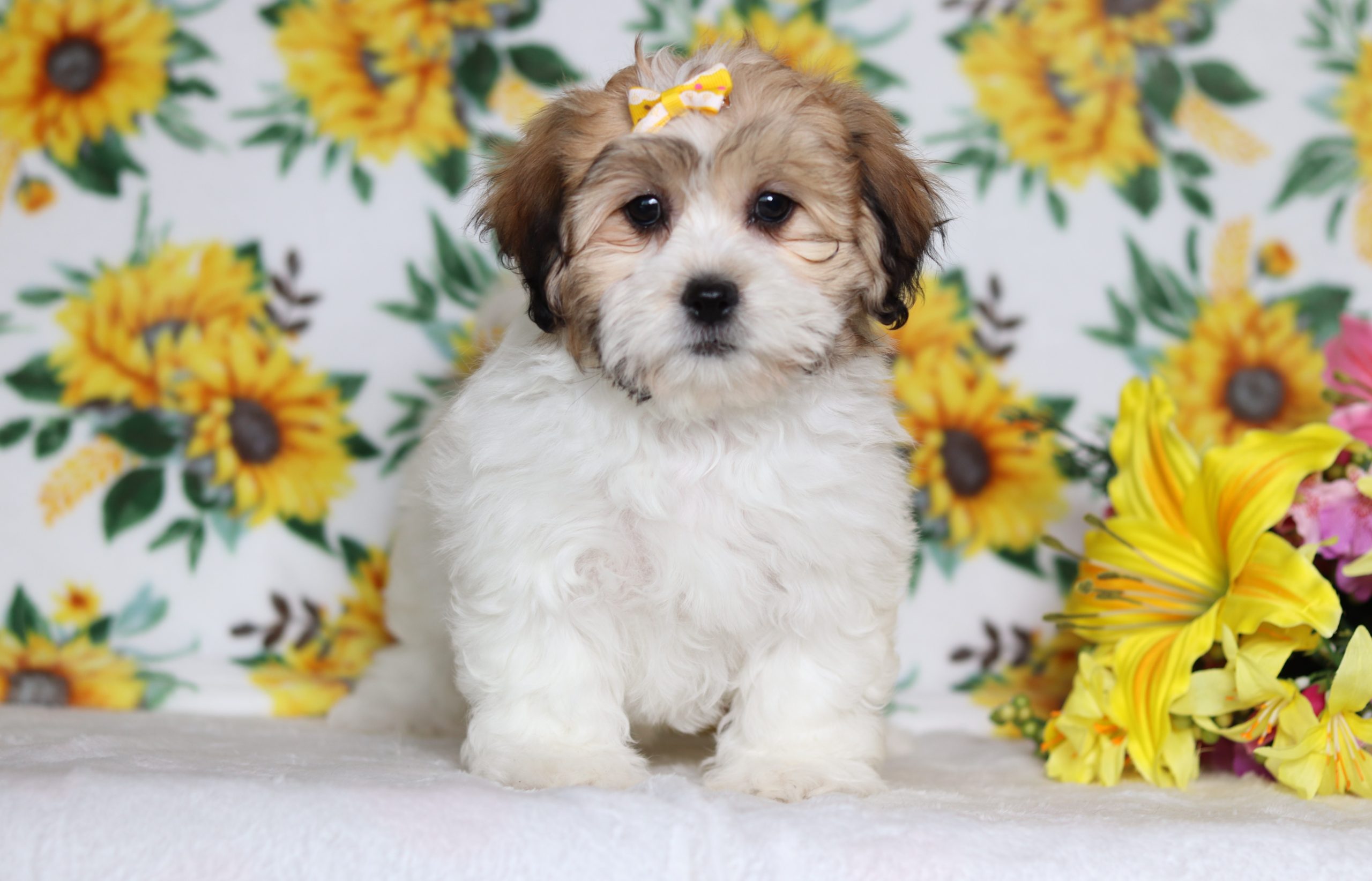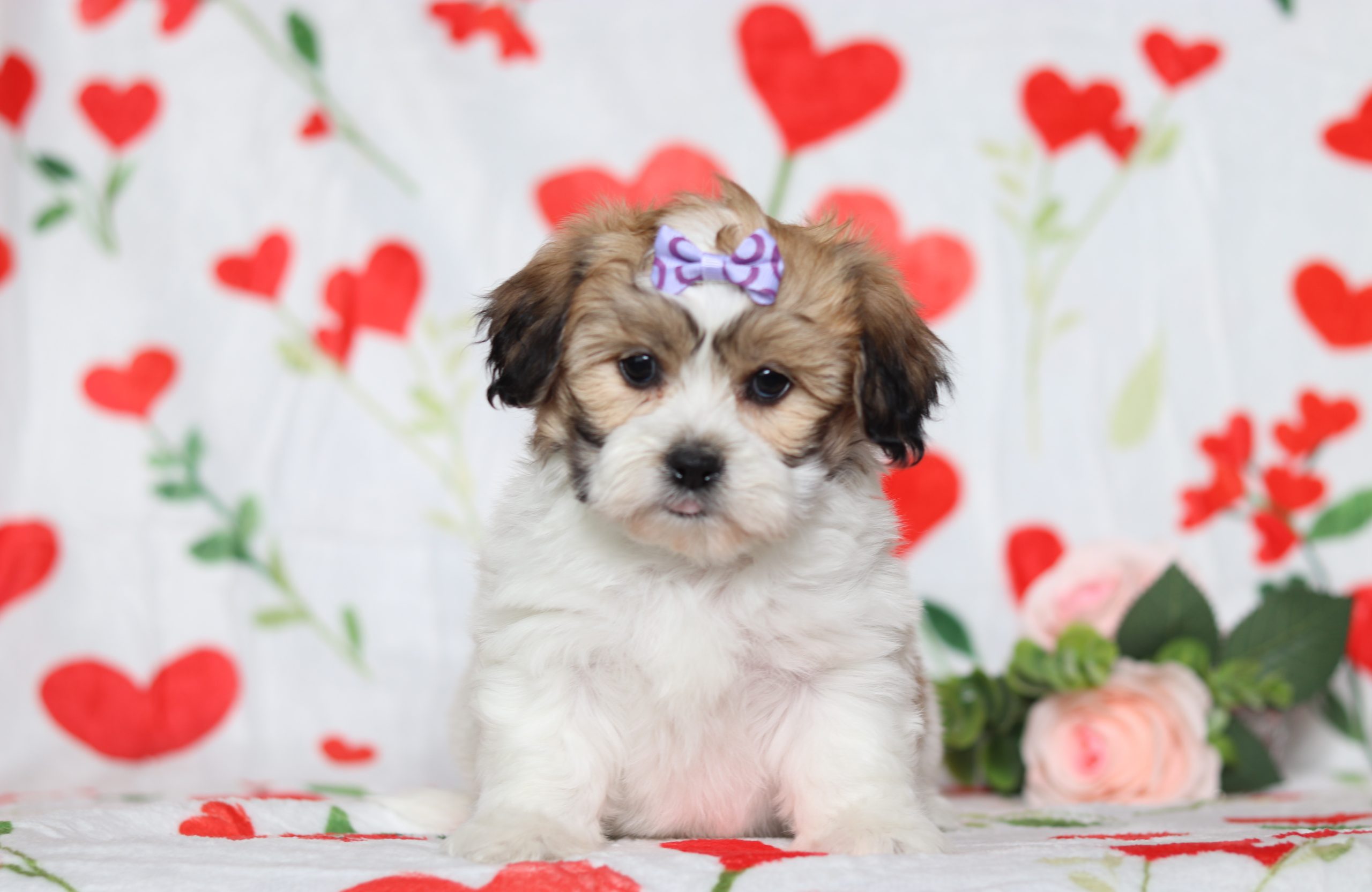 Hi there! This is Everley a sweet little Teddy Bear girl! She has a clean mostly white, w/light brown coat! She is happiest when she is with you, snuggling by your feet or cuddling on your lap, that is just what she loves! She has a great temperament and loves to play with kids!