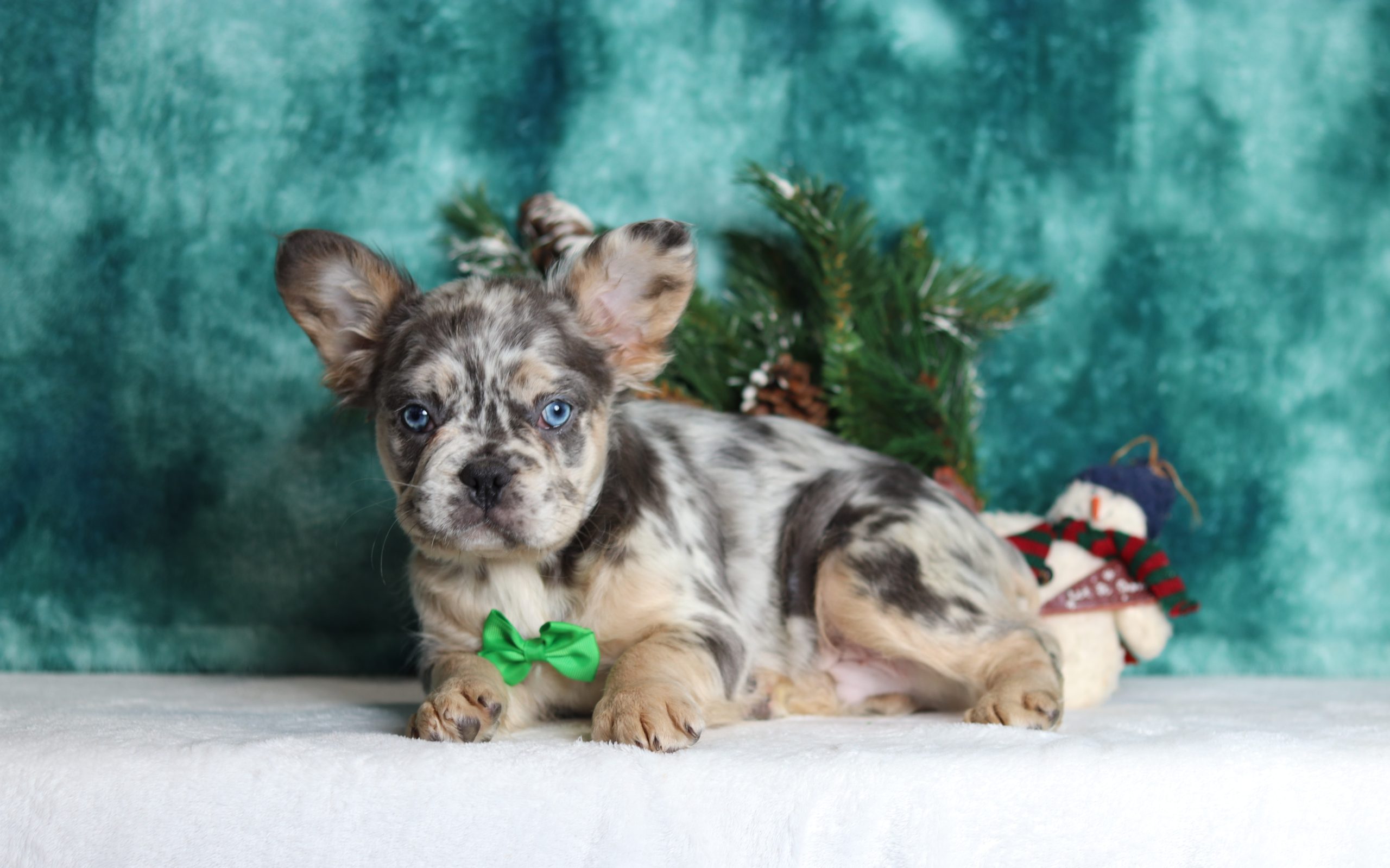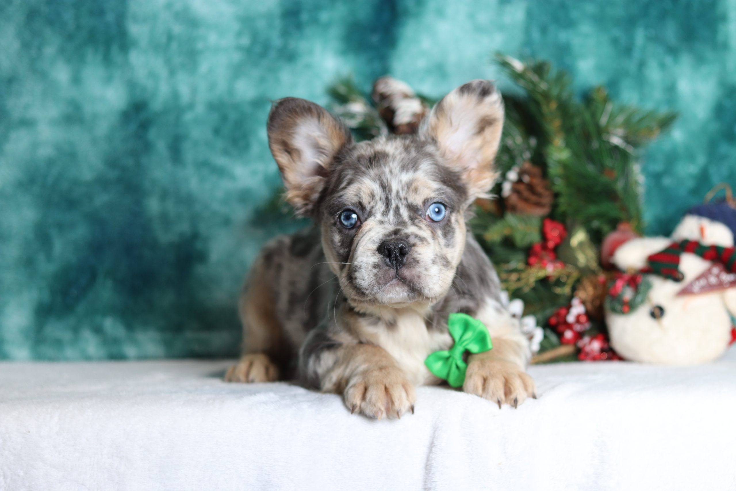 Hello, this is Frank! He’s a cute looking little Frenchy boy with a beautiful blue merle and soft, furry coat and 2 shining blue eyes. He loves to play with his siblings and also loves to be held and cuddled! He will be sure to shower you with lots of kisses!