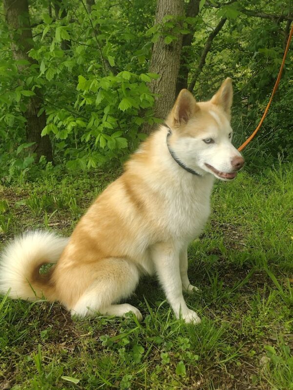 Hello, this is Garrett! He’s a cute looking pomsky boy with a lighter chocolate and soft, furry coat and 2 shining blue eyes. He loves to romp and play with other puppies and also loves to spend time playing in the yard! He will be sure to shower you with lots of kisses! Garrett has gone thru the 4 week training program and is ready for his forever Home! In his 4 weeks of training he got leashed trained to: