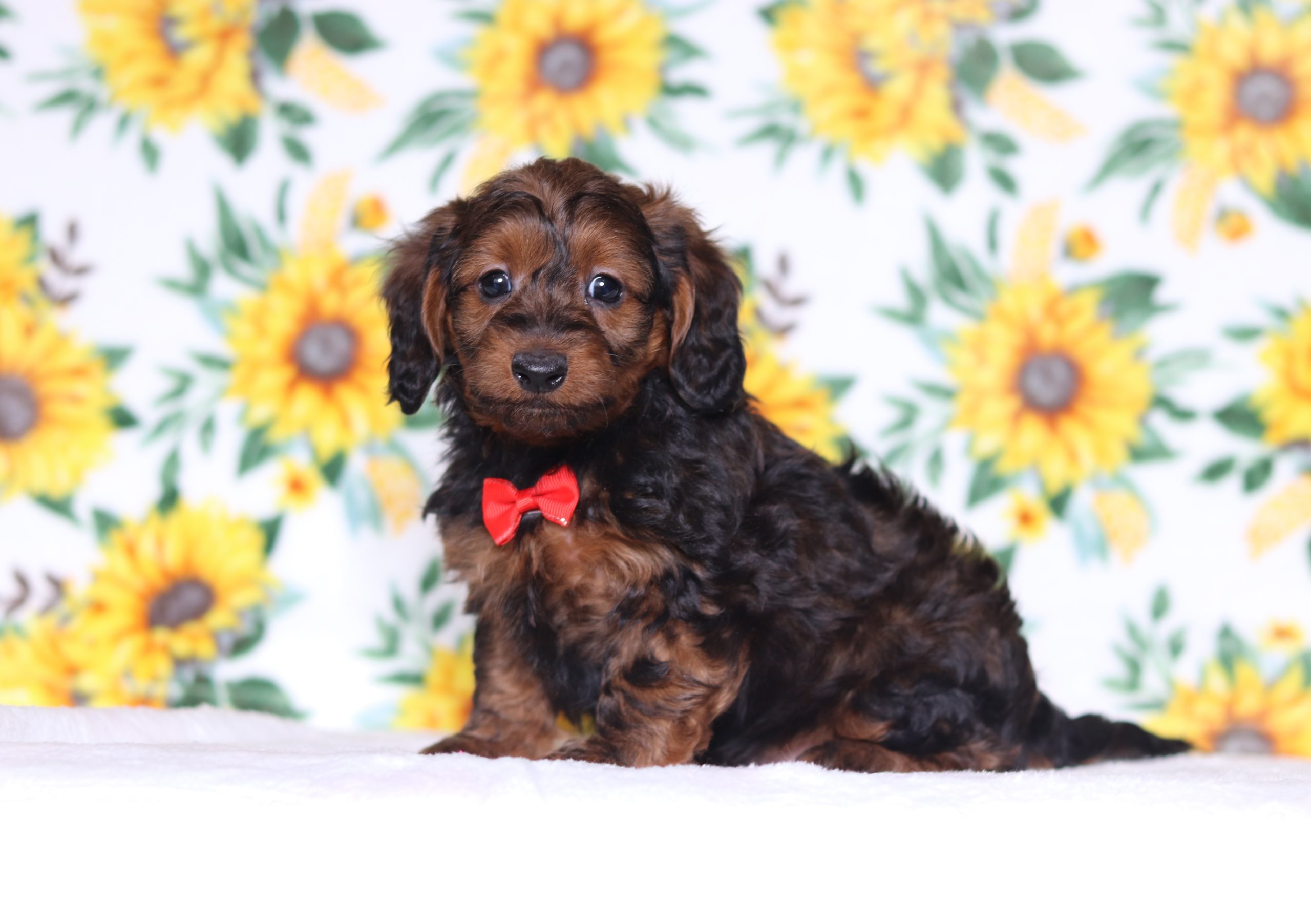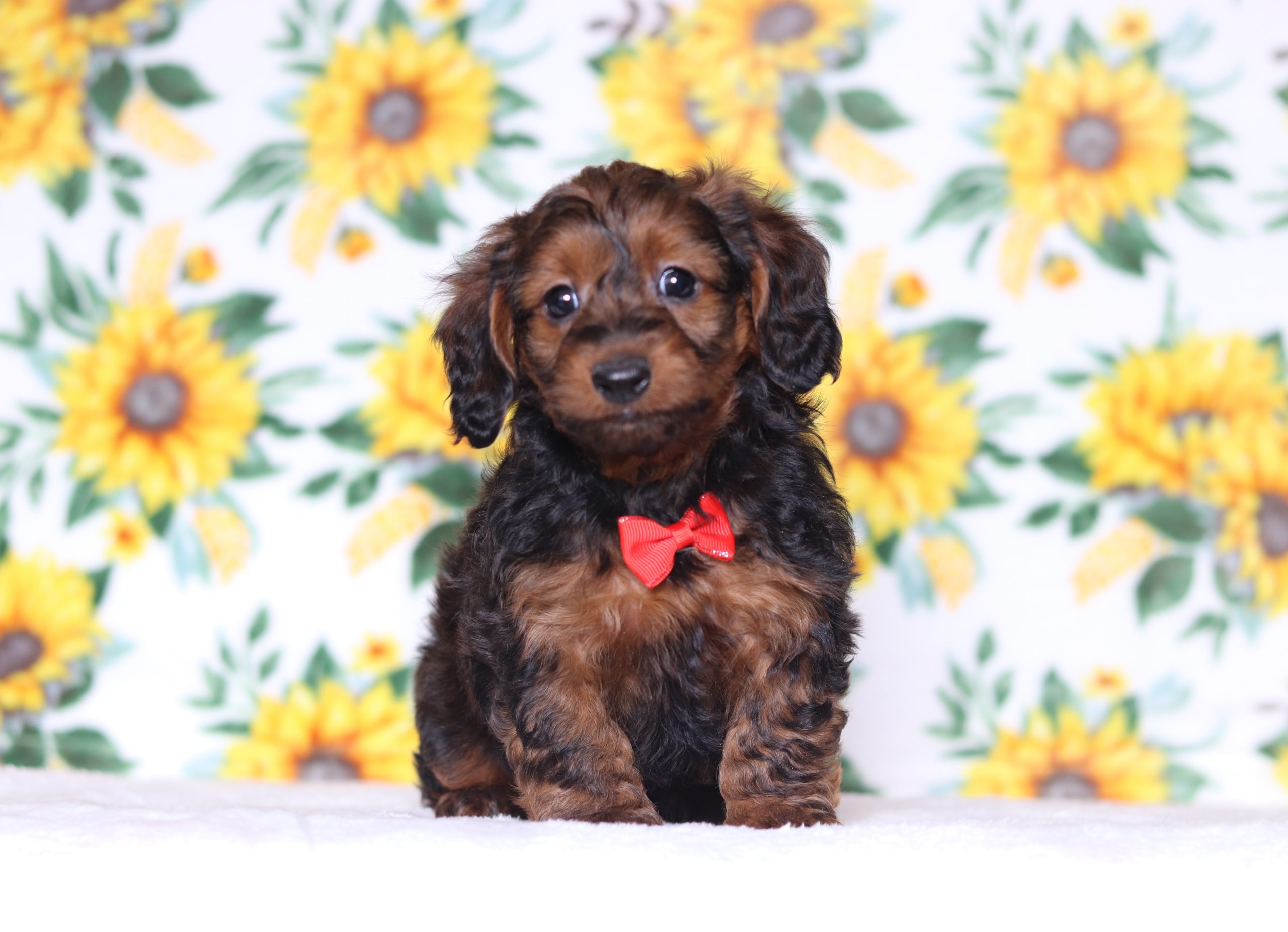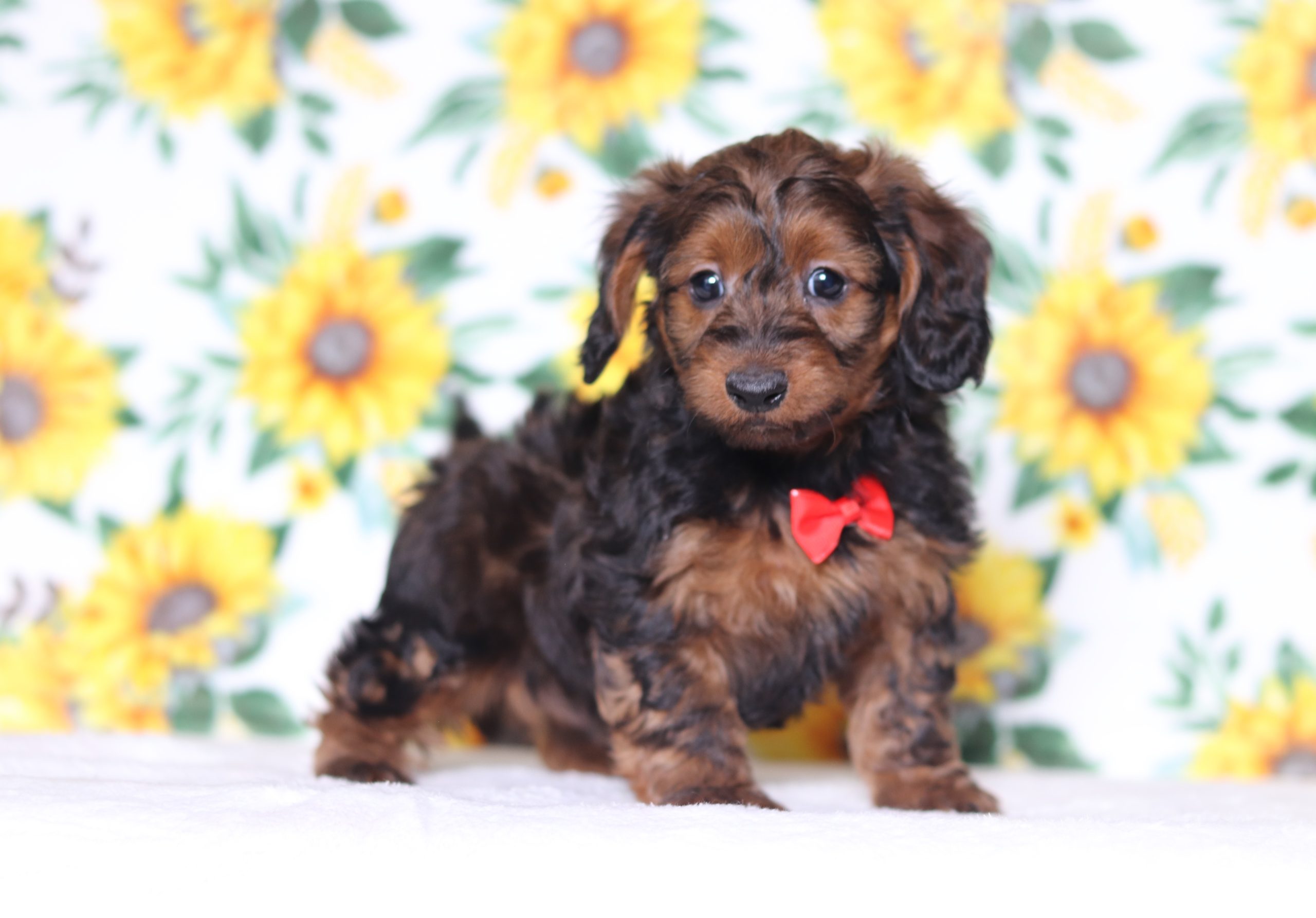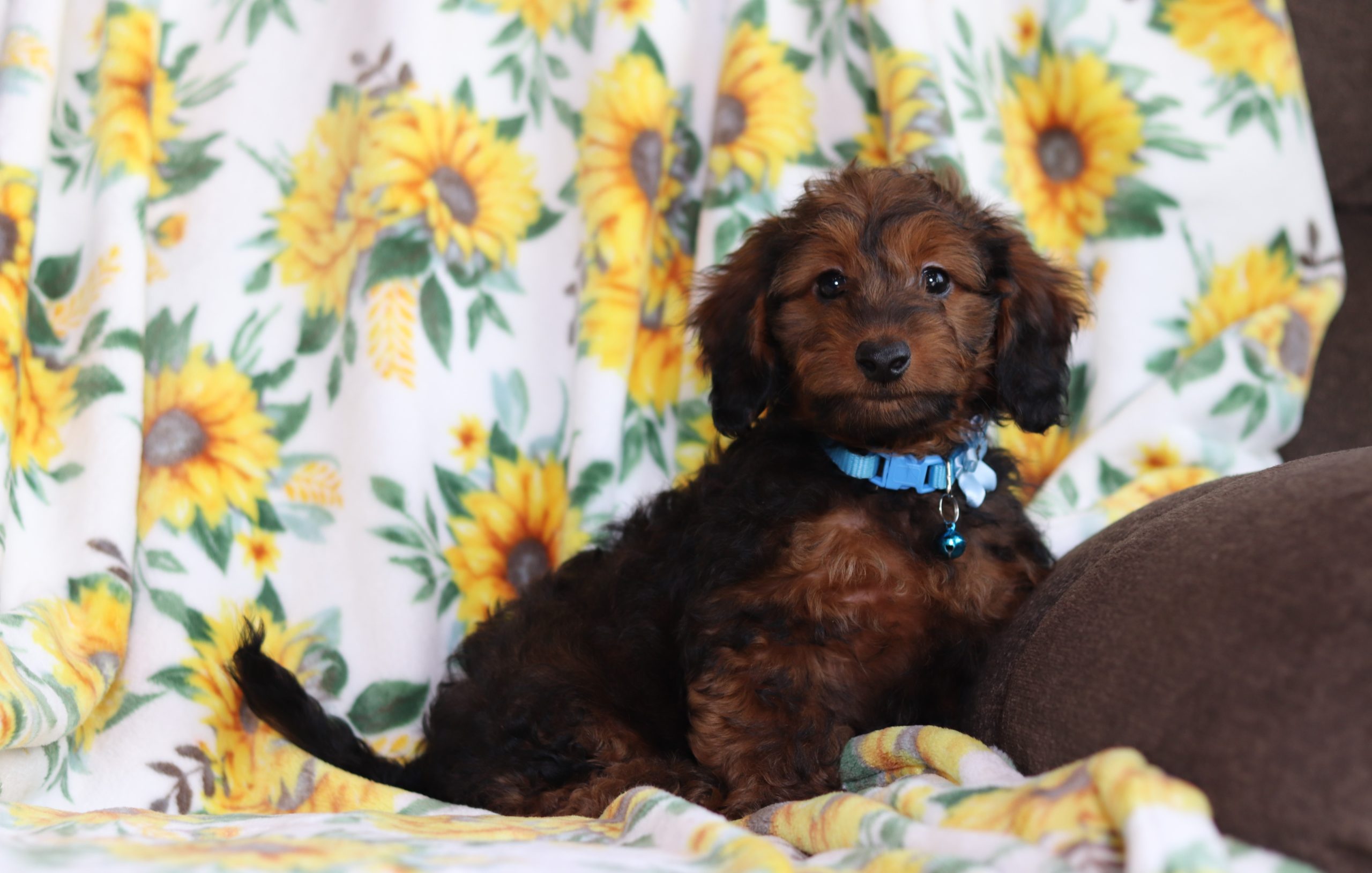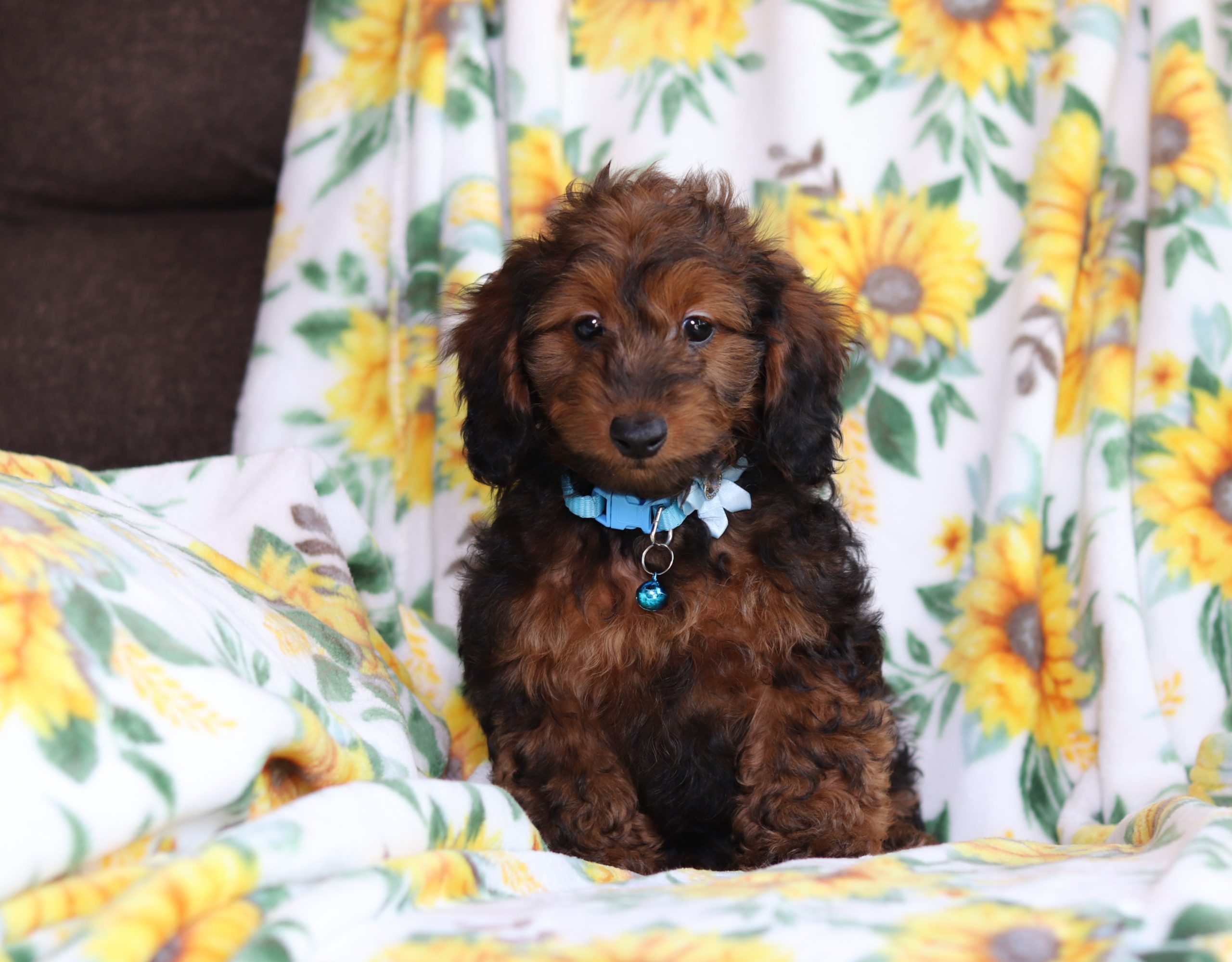 George, the Doxypoo boy is soft and cuddly! He is calm and easy going loves to be held and cuddled. Enjoys playing with the kids and loves to snuggle up to take a nap. He did great with his (ENS) Early Neurological Stimulation, and is enjoyable all around. A very friendly and lovable guy!