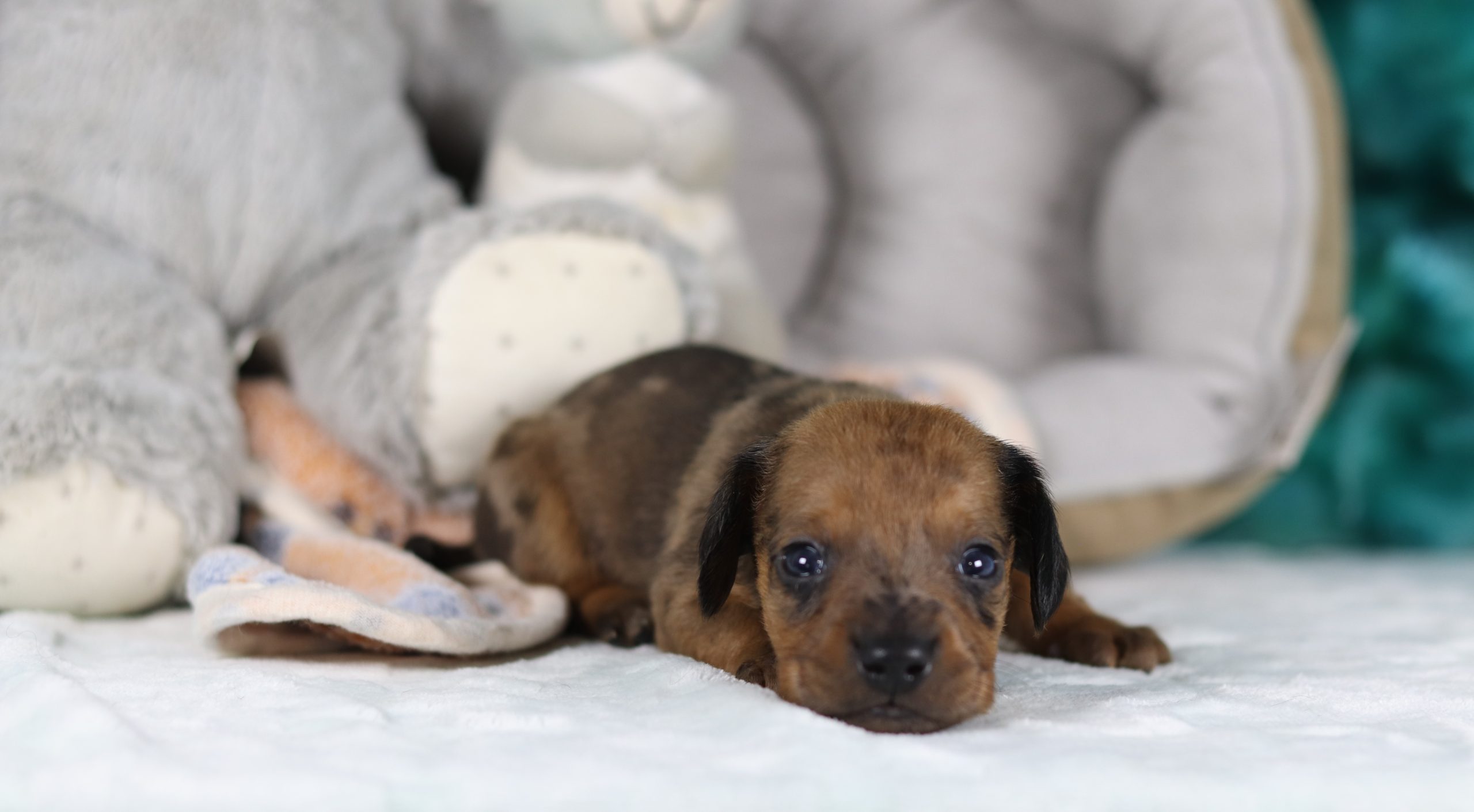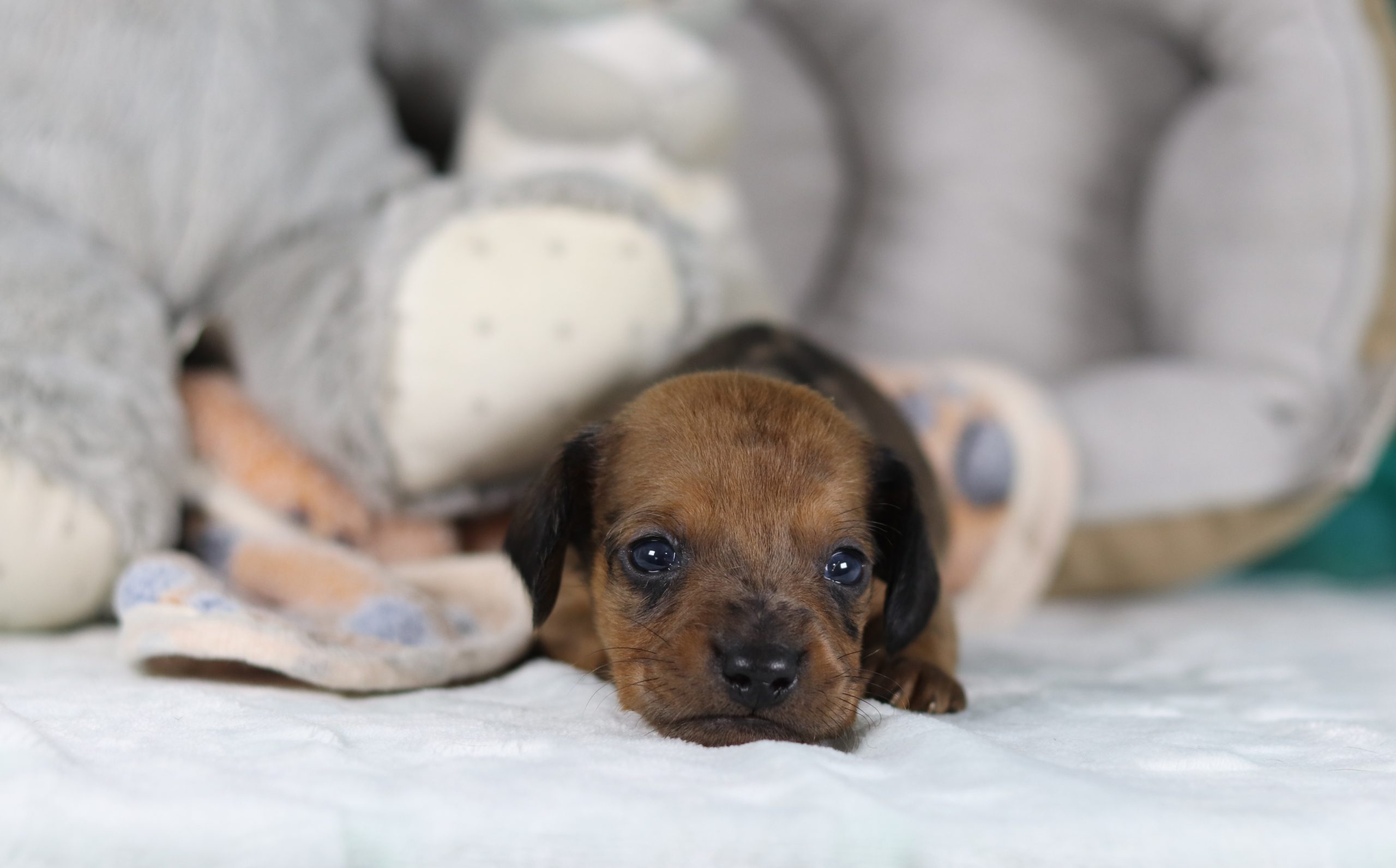 Gilbert, the shorthaired Mini Dachshund boy, is very caring and sweet! He is such a cheerful little boy! A great companion to his littermates! His temperament is wonderful! He is eager to please and a bundle of love!