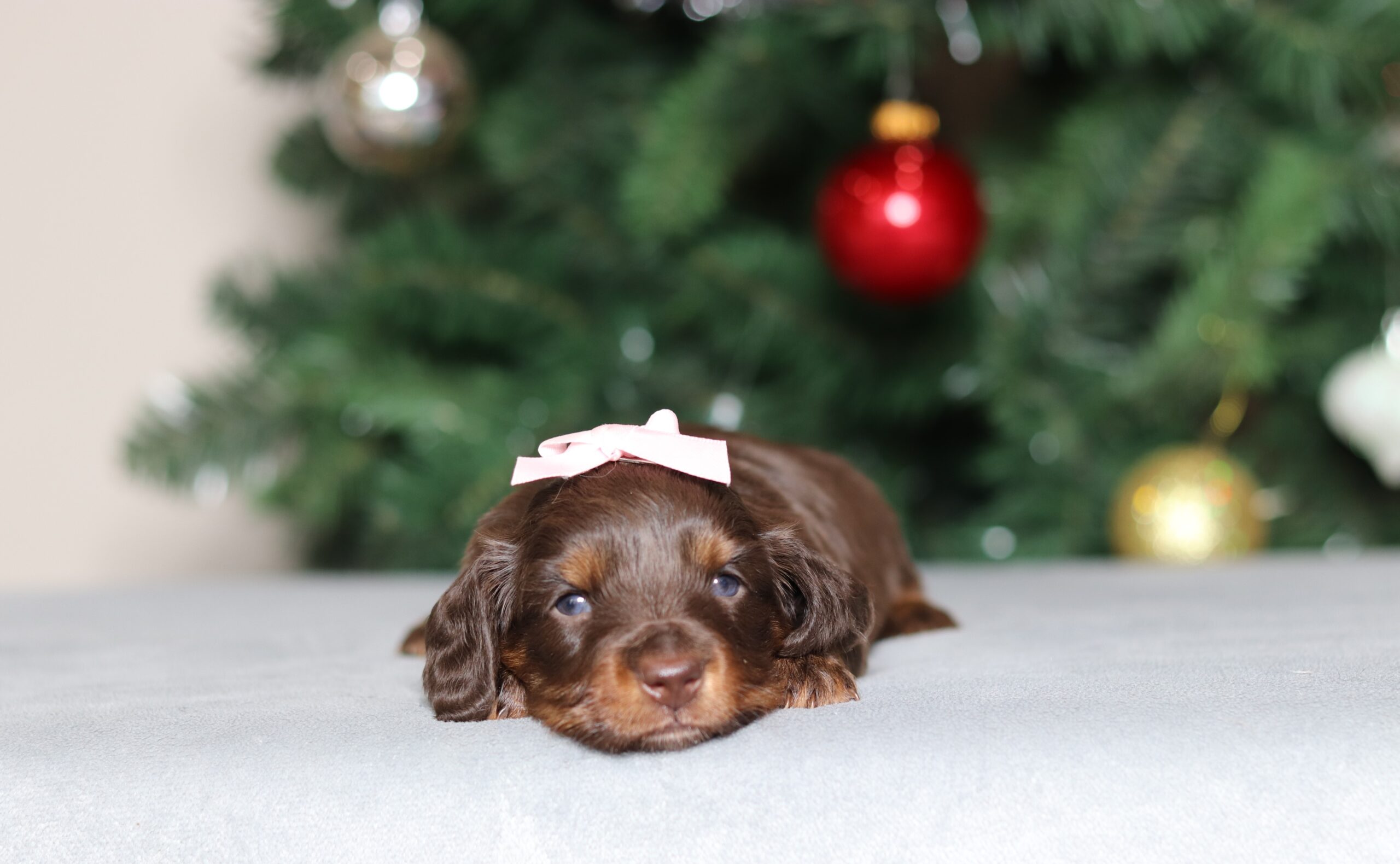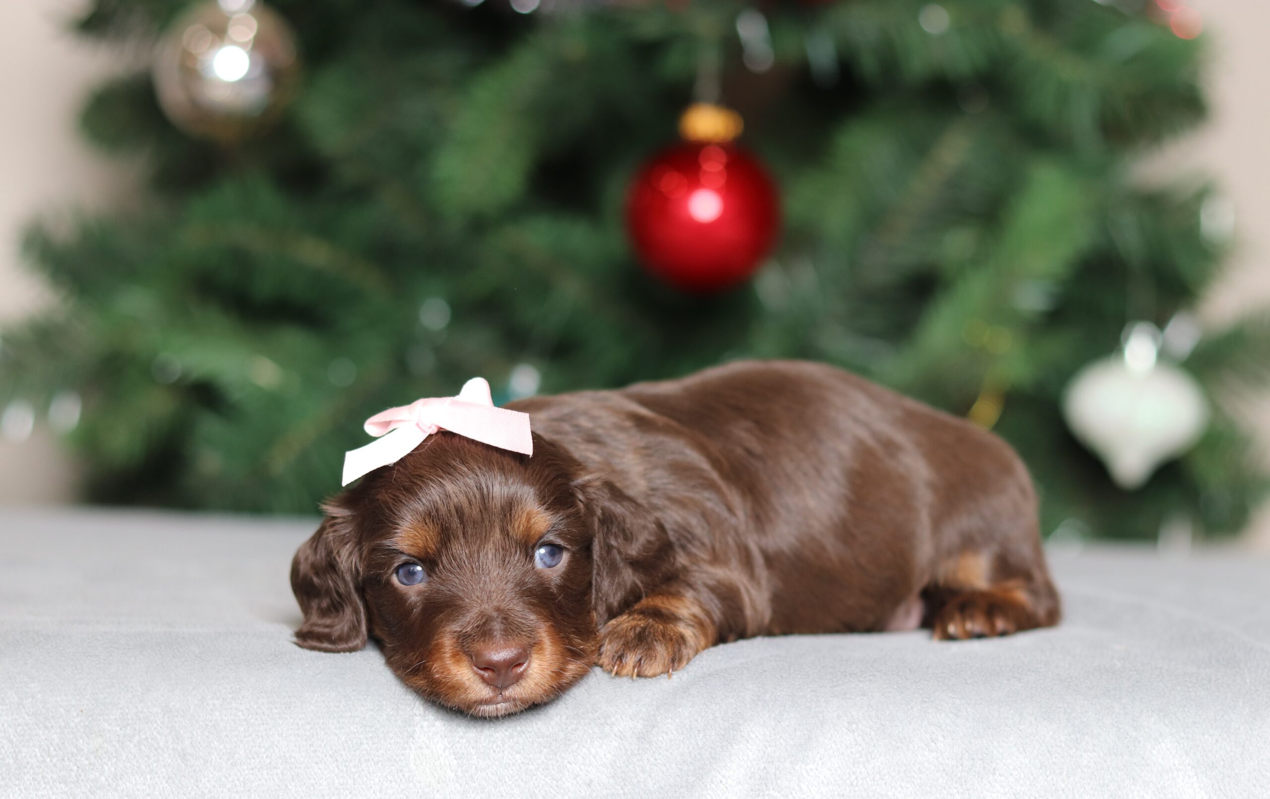 Gladys, a precious little, longhaired Mini Dachshund girl! She enjoys every minute of snuggling together! She loves being pampered and getting belly rubs! She did great with (ENS) Early Neurological Stimulation and enjoys playing with toys and running around! She is a friendly and adorable girl!