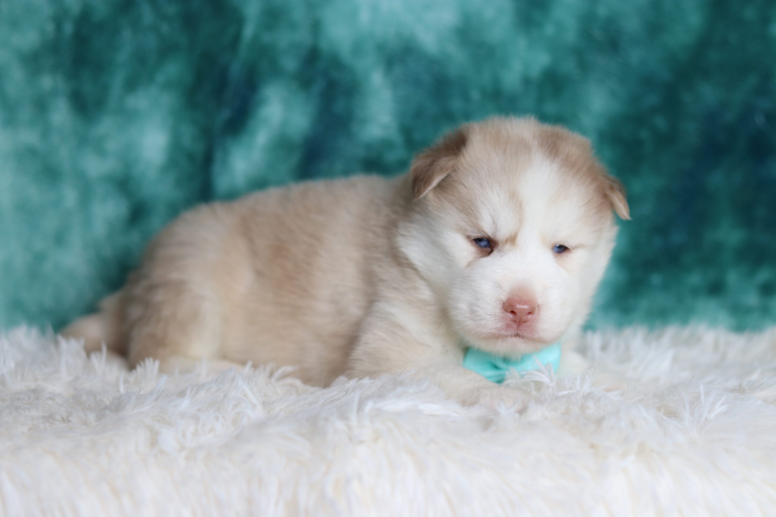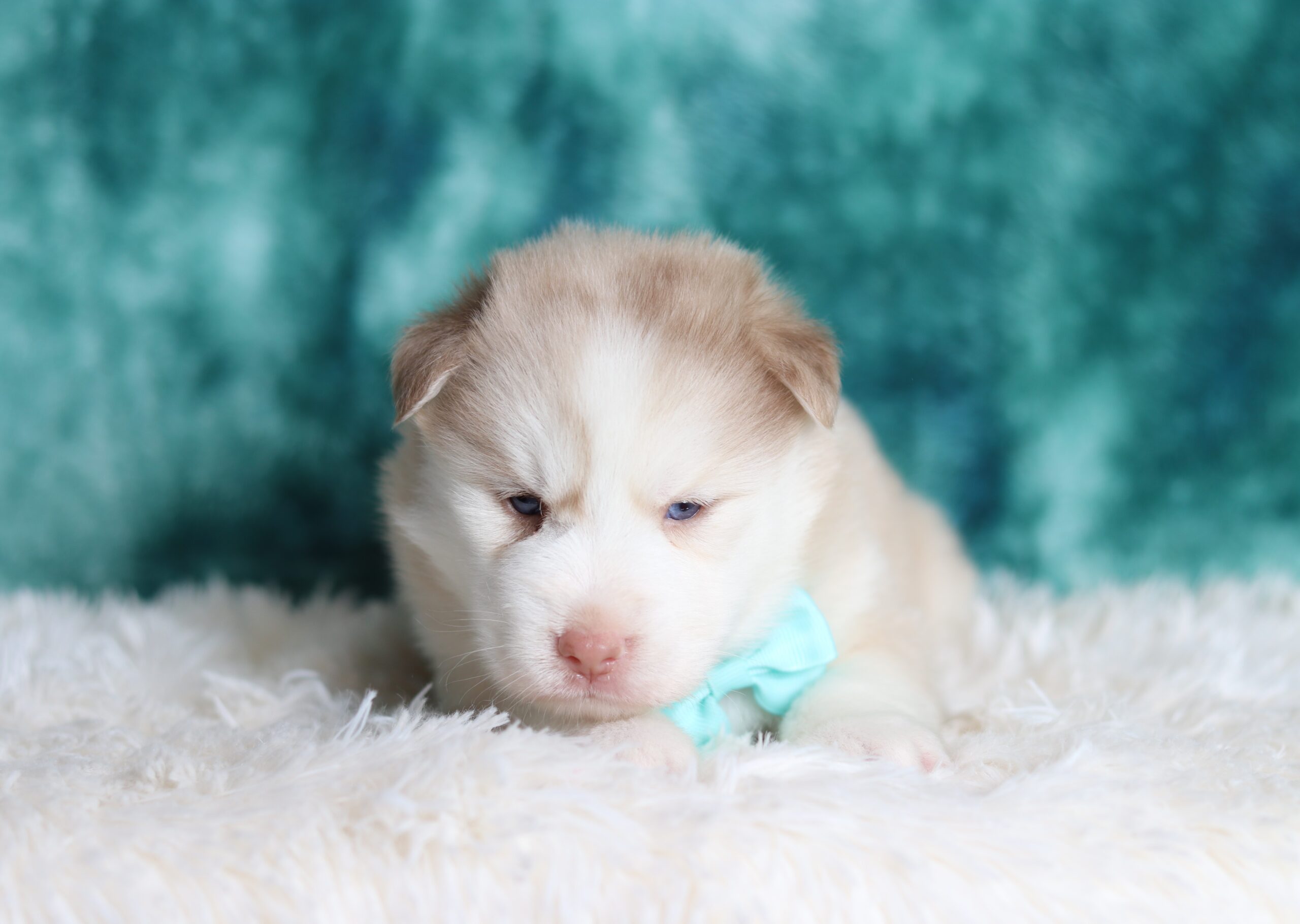 Hello, this is Greg! He’s a cute looking little pomsky boy with a light chocolate merle and soft, furry coat and 2 shining blue eyes. He loves to play with his siblings and also loves to be held and cuddled! He will be sure to shower you with lots of kisses!