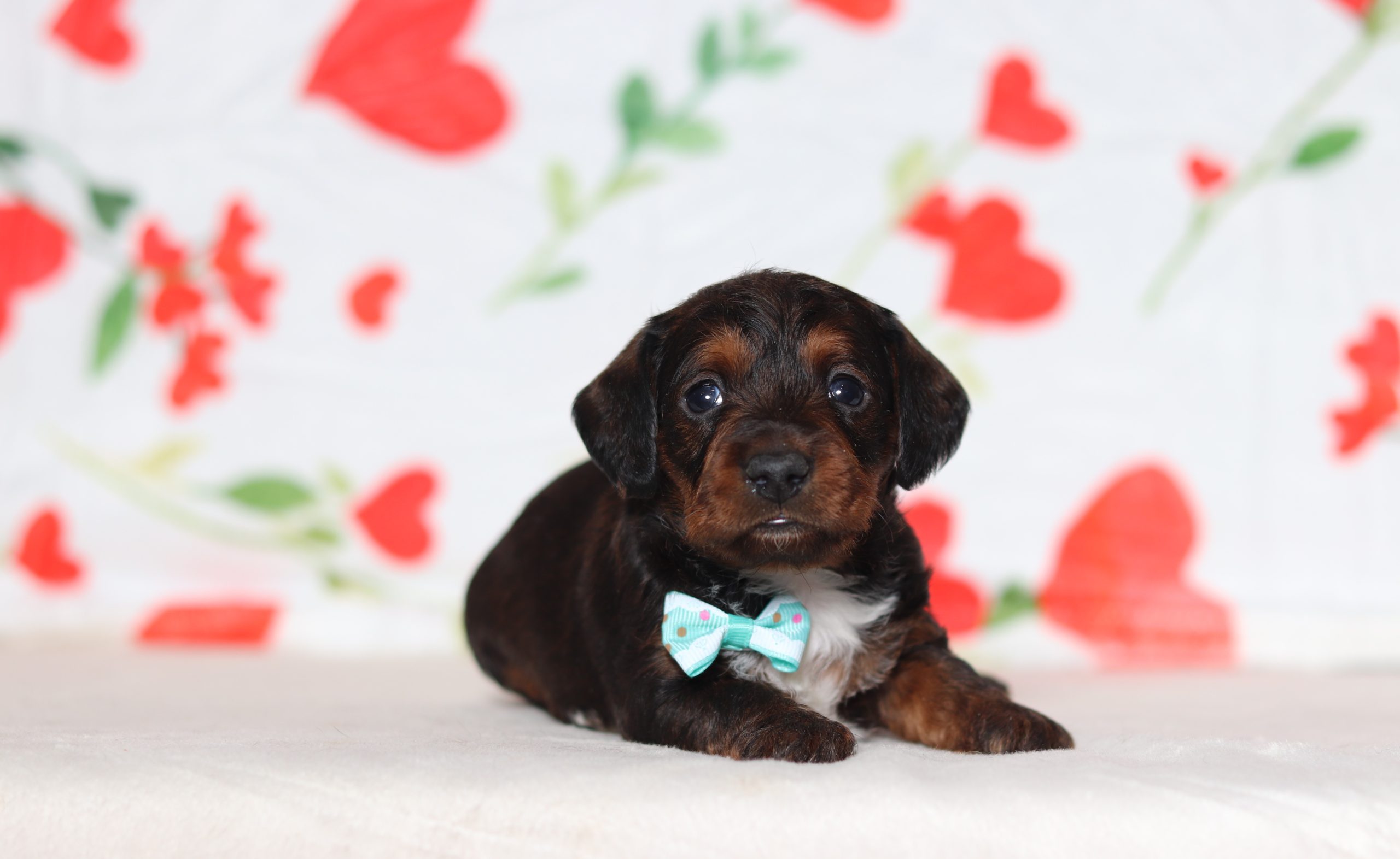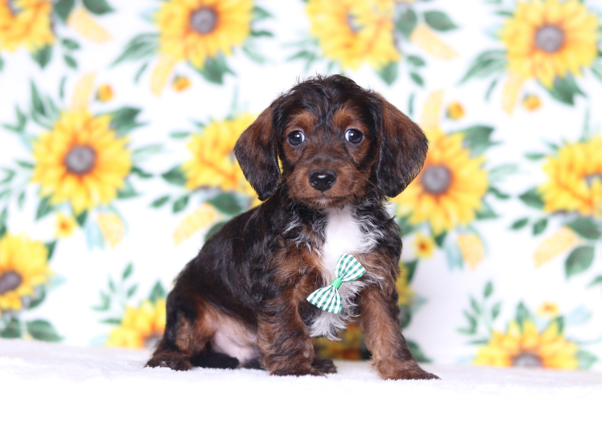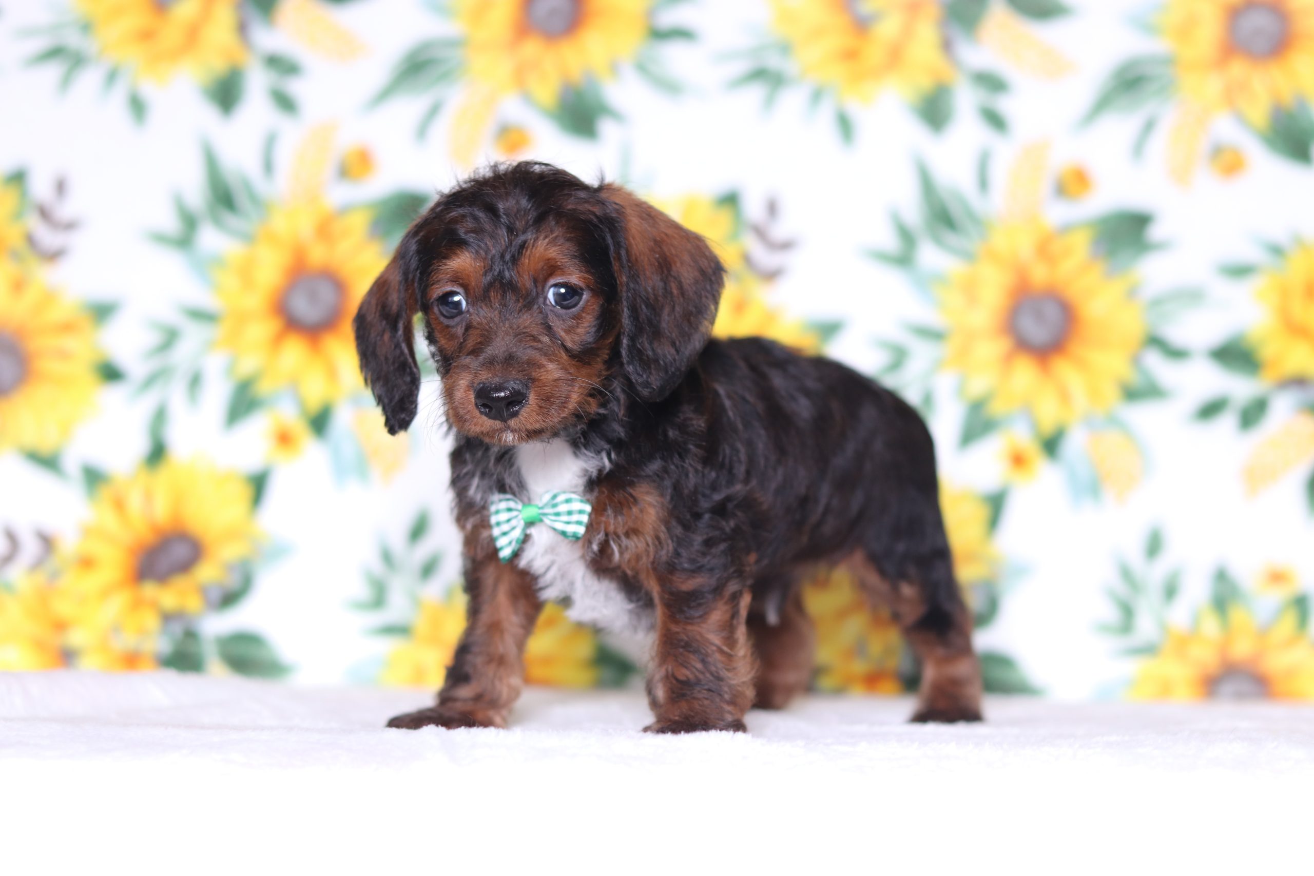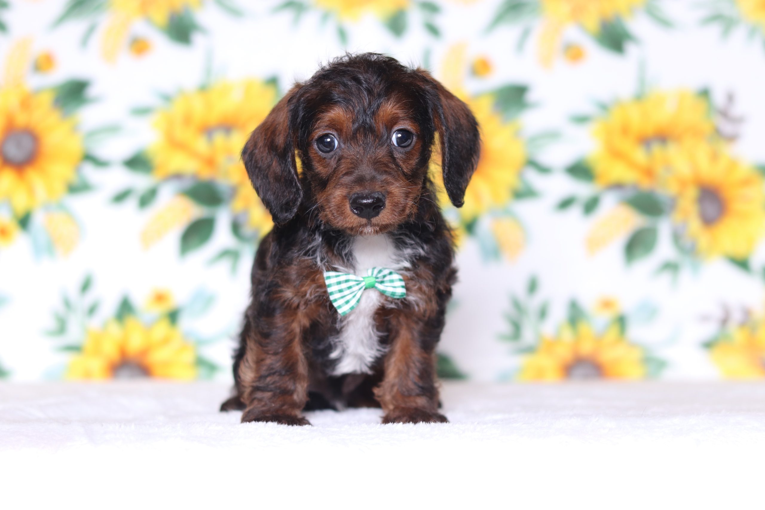 Gus, the Doxypoo, has a beautiful red and tan coat, he’s very caring and sweet! He is such a cheerful little guy, a great companion to his littermates! His temperament is wonderful! He is eager to please and a bundle of love!