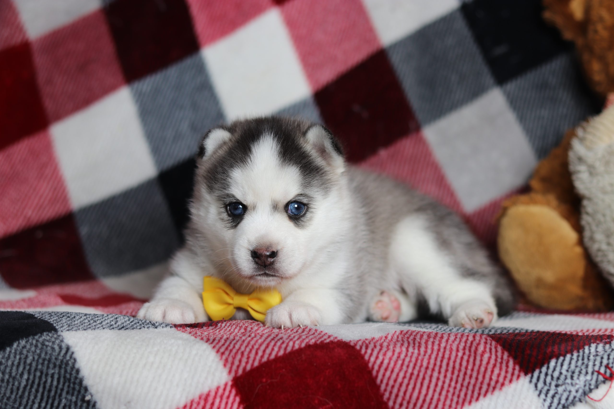 Hello, this is Guy! He’s a cute little pomsky boy, with a sable/white, soft, furry coat and 2 shining eyes. He loves to play with his siblings and also loves to be held and cuddled! He will be sure to shower you with lots of kisses!