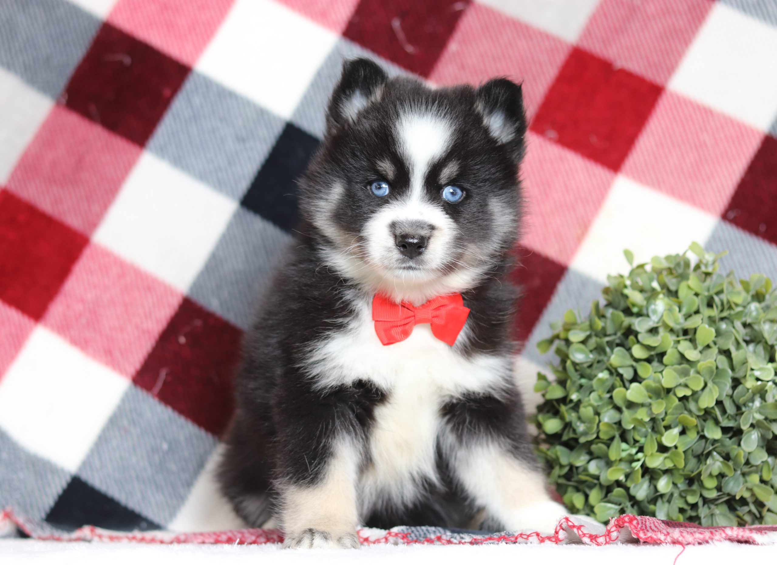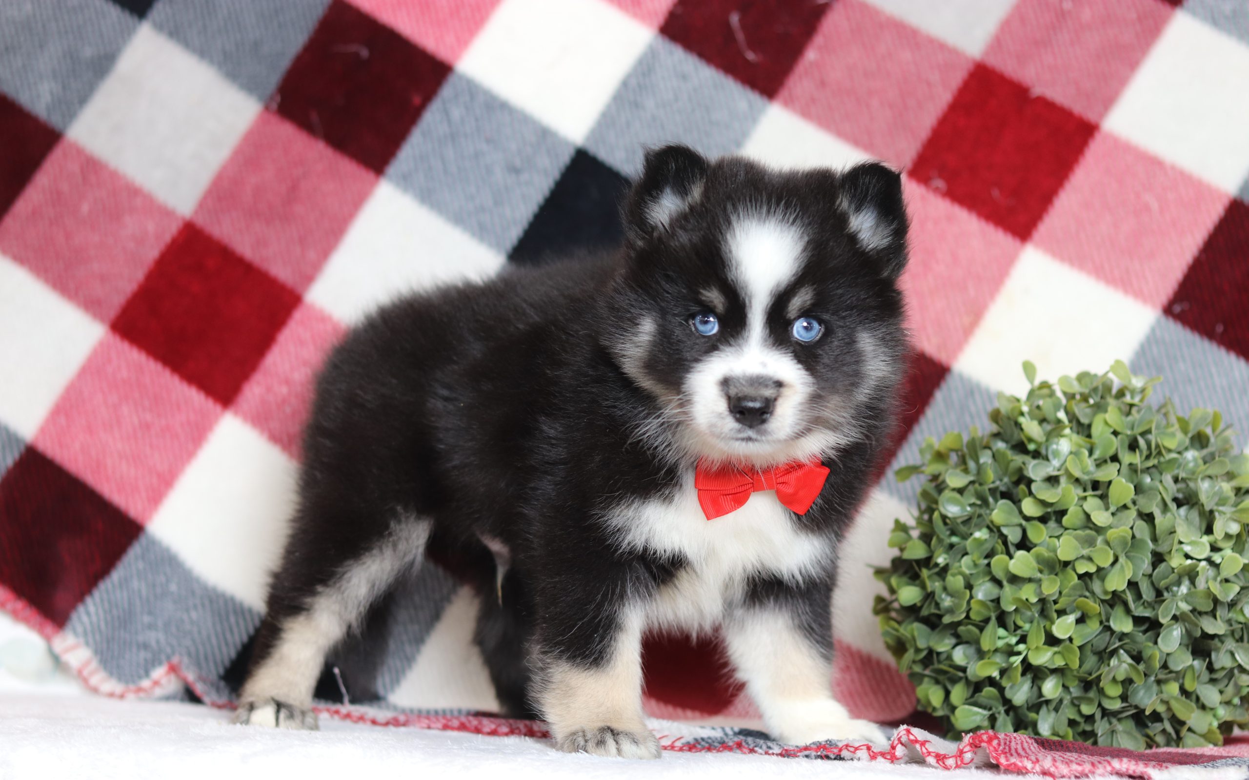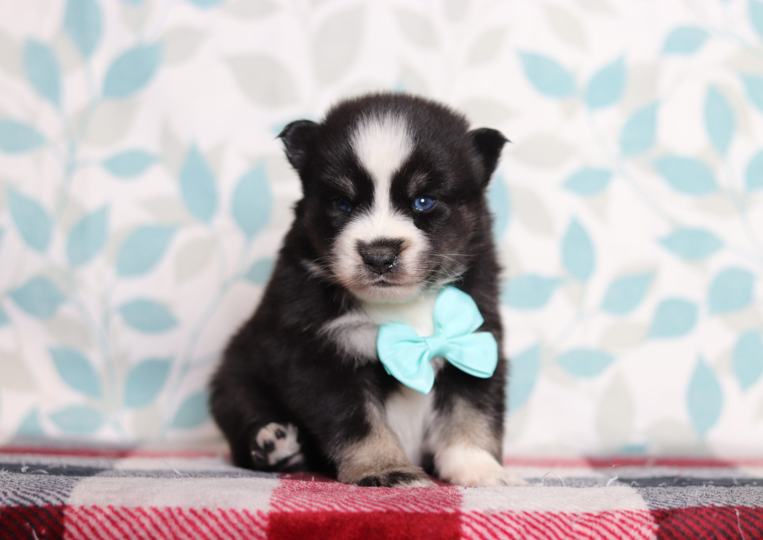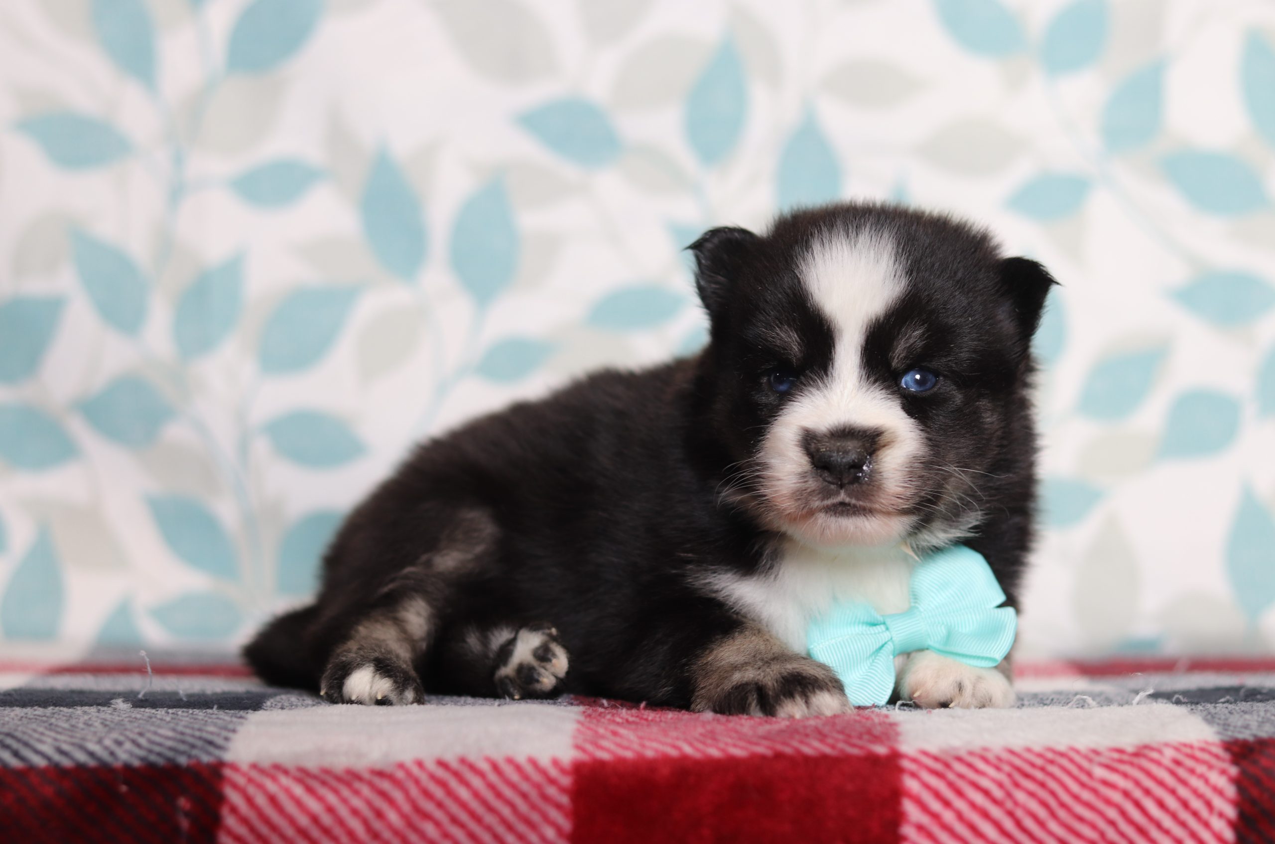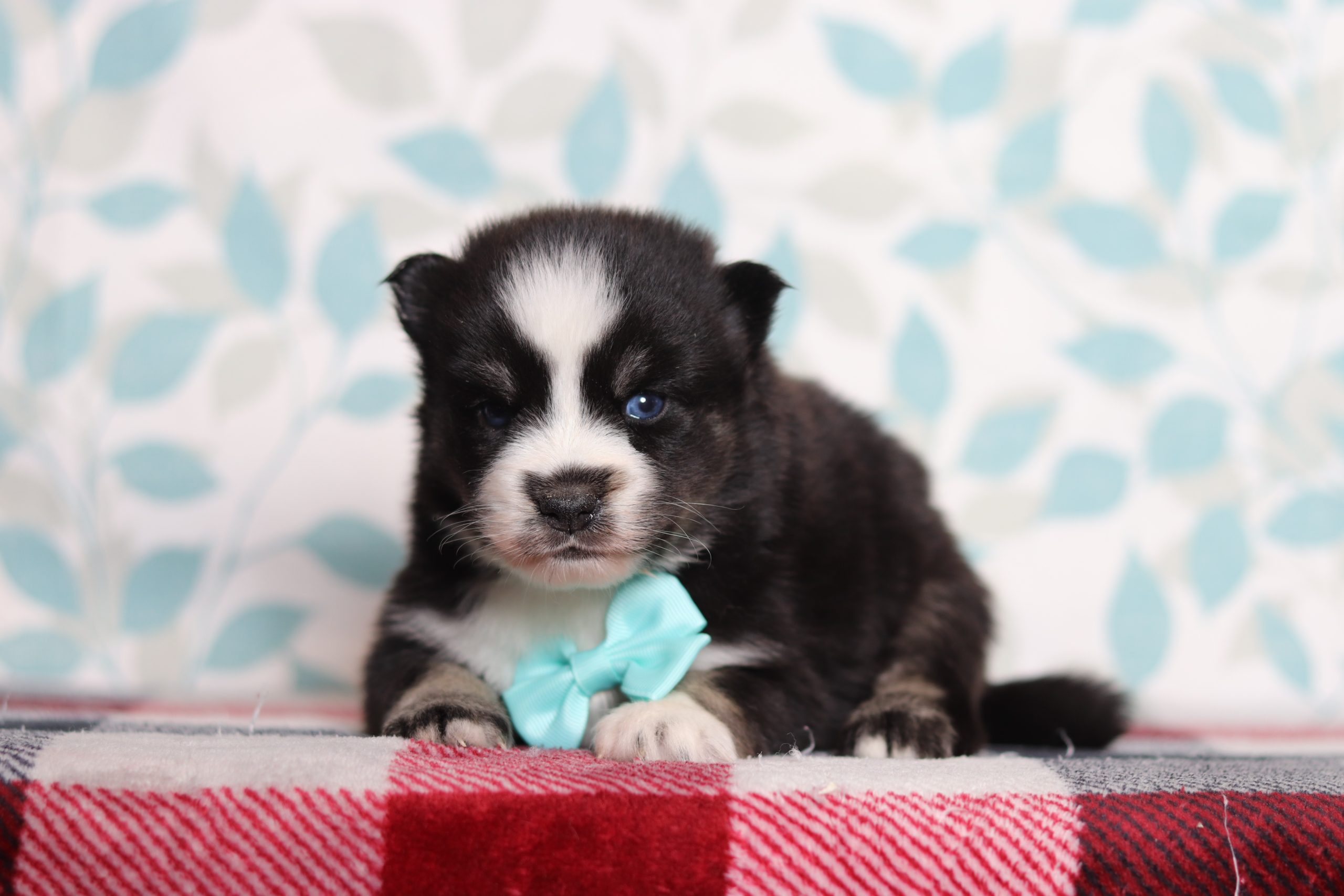 Hallard, a precious little pomsky boy! He enjoys every minute of snuggling together! He loves being pampered and getting belly rubs! He did great with (ENS) Early Neurological Stimulation and enjoys playing with toys and running around! He is a friendly and adorable boy!