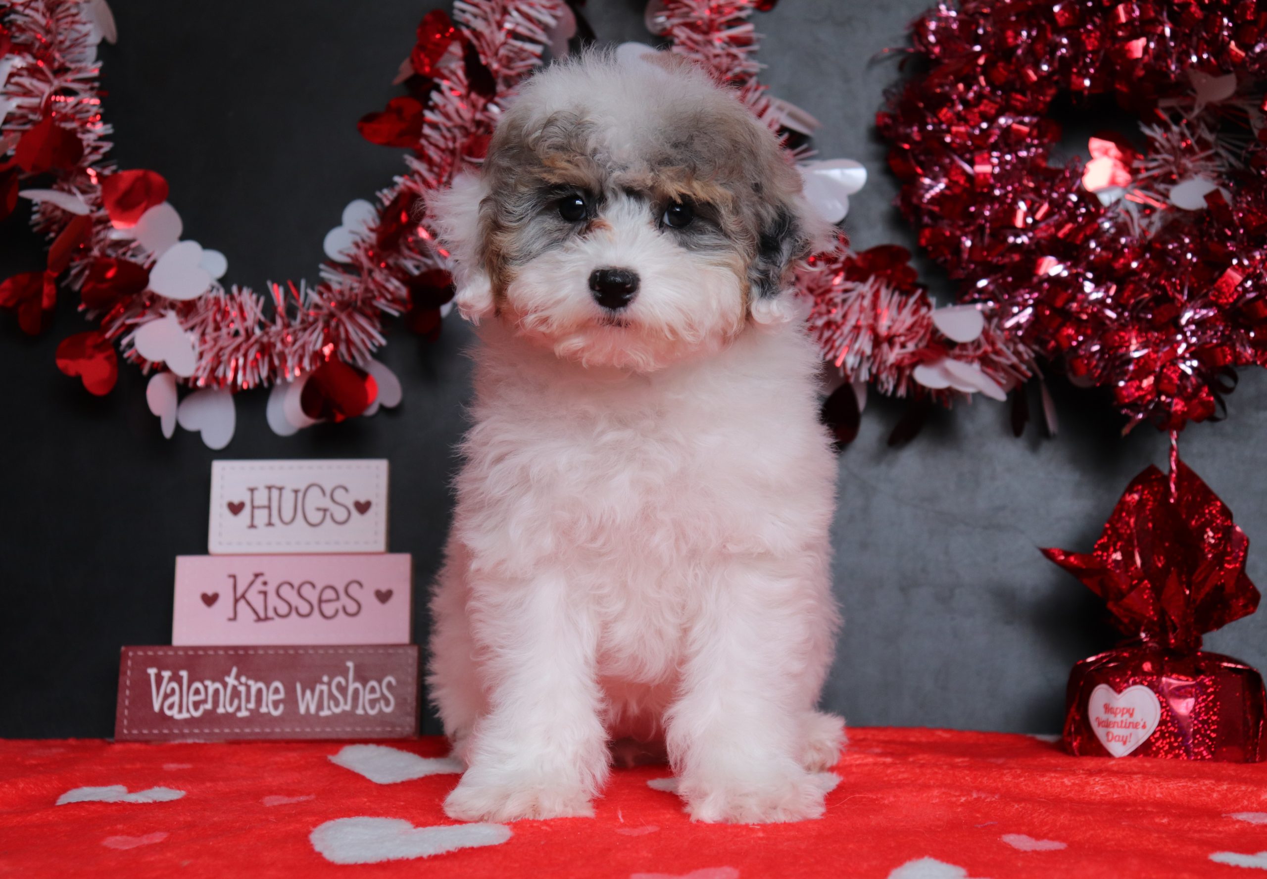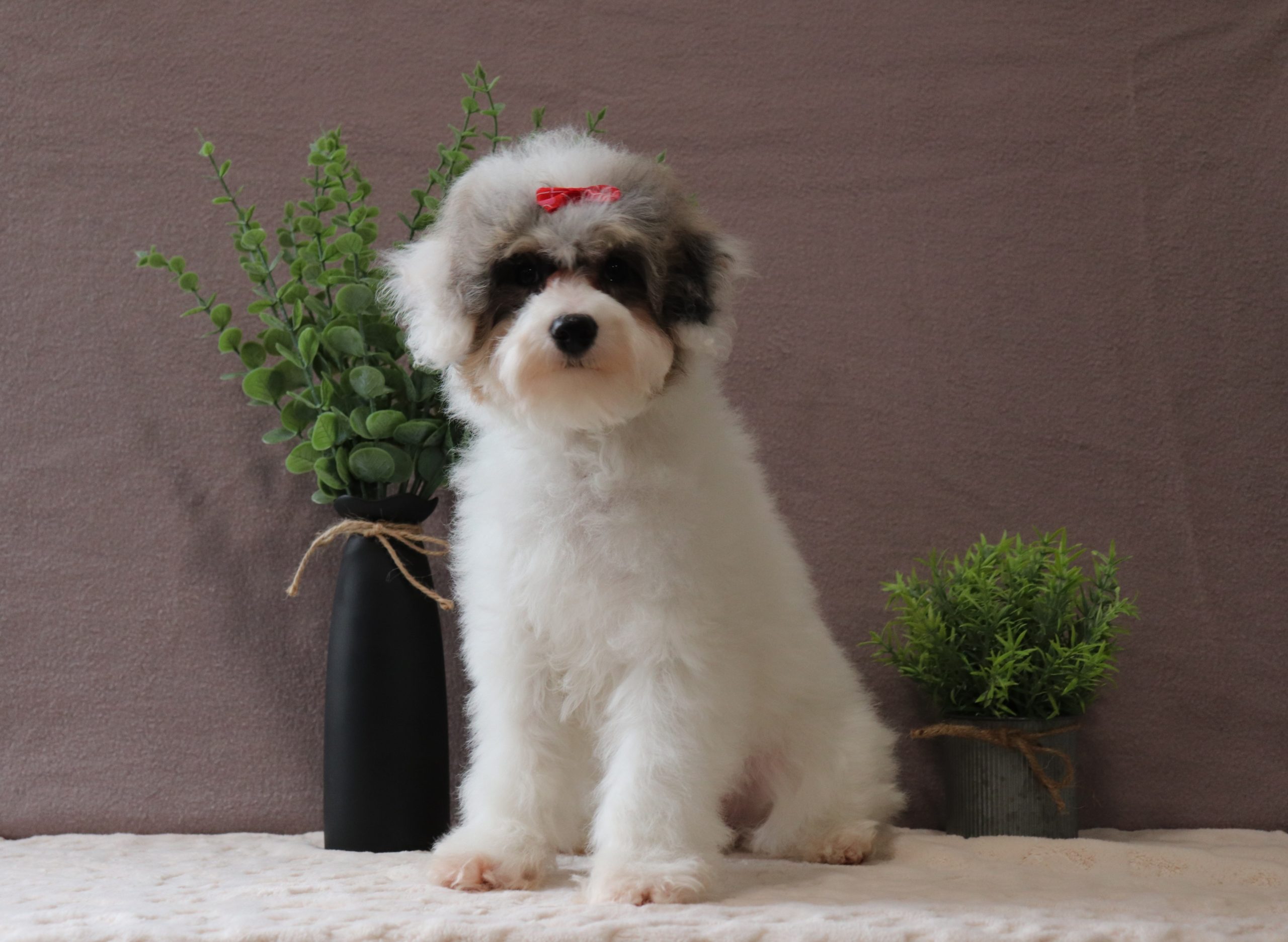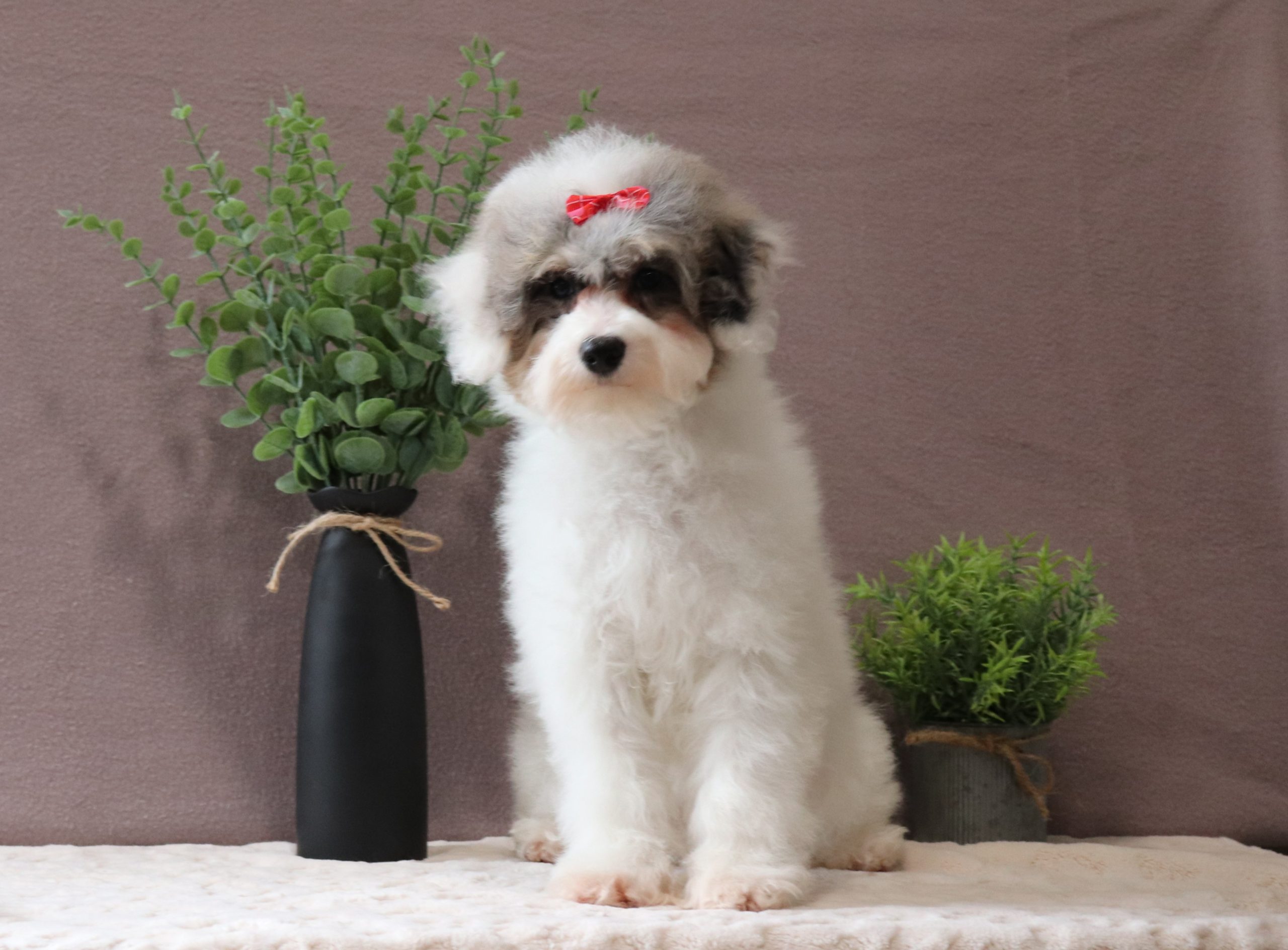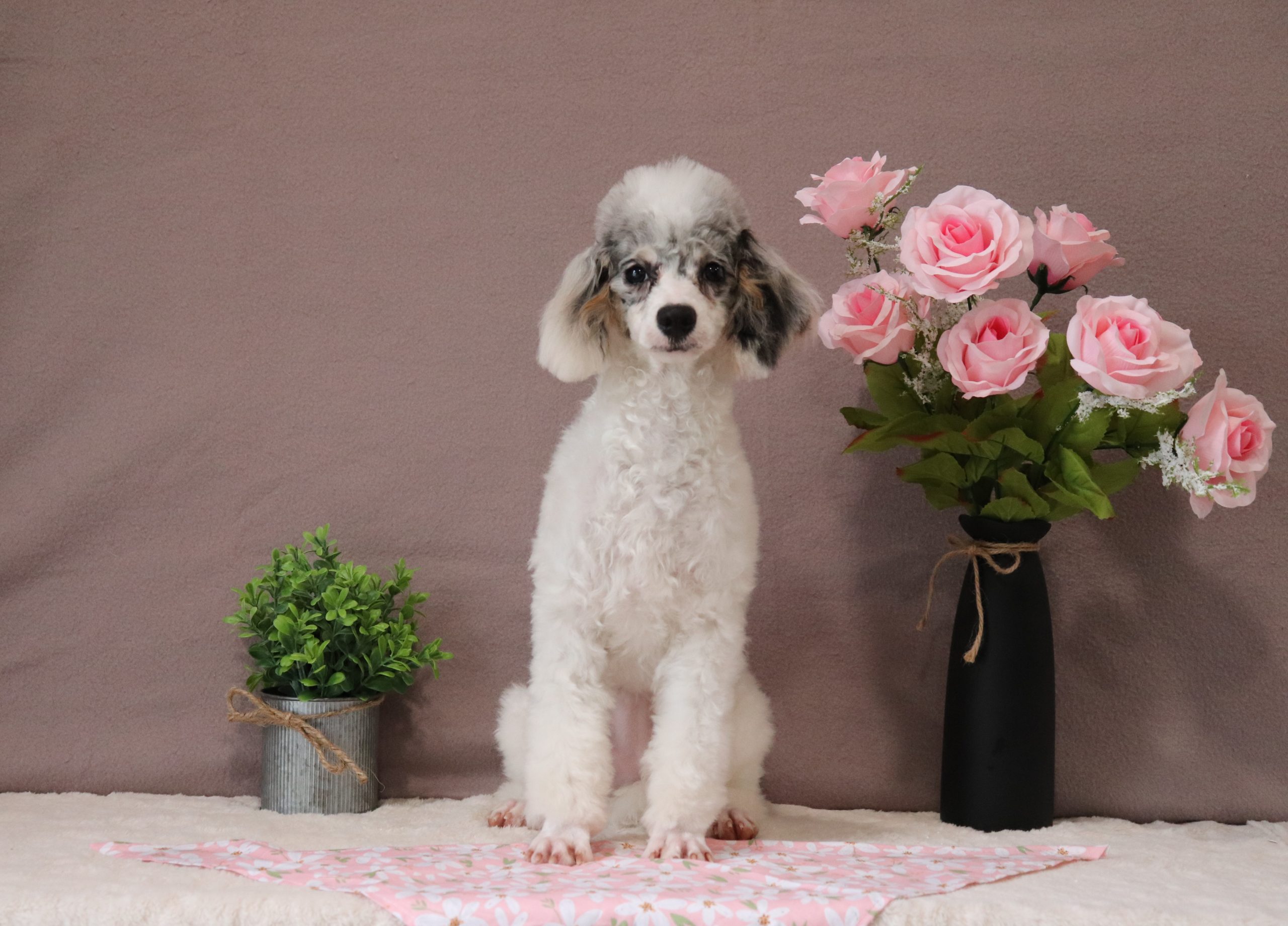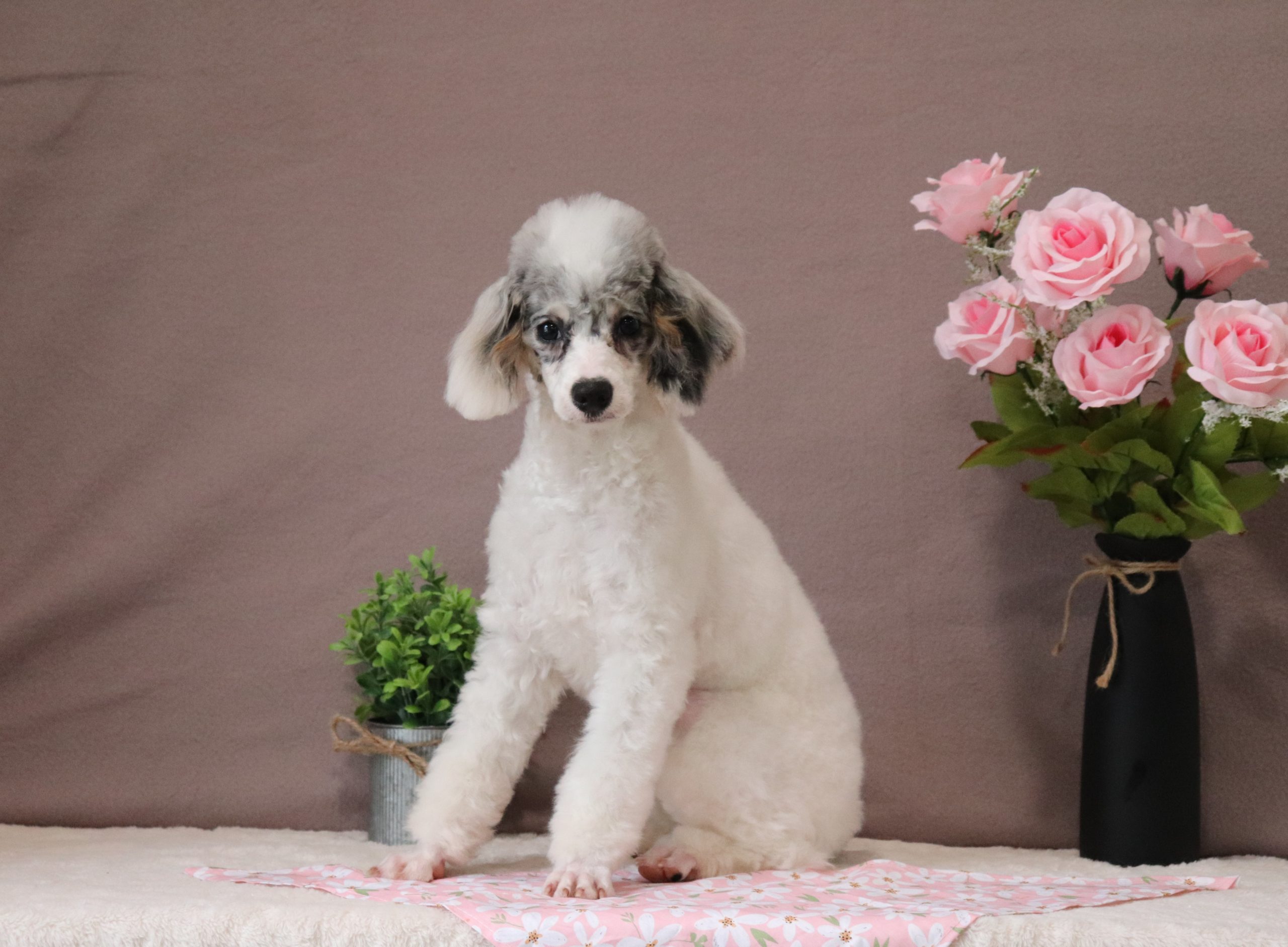 This is Hannah, the Mini poodle girl,with a pretty white merle coat! She is very alert and won’t miss a beat! She is a happy go lucky little girl and loves excitement! She has a beautiful fluffy hair coat! Her caring eyes and cute little nose will be sure to steal your heart! Enjoys playtime and also loves to be held! She’s an all around cutie!