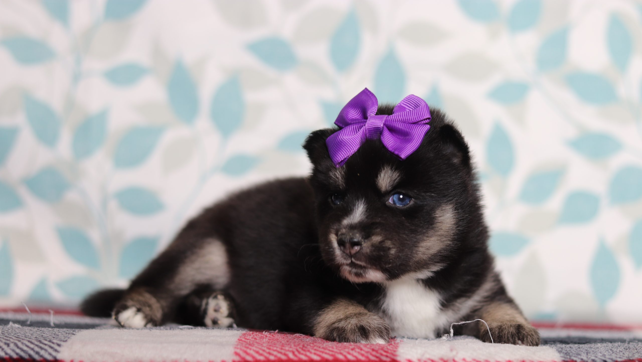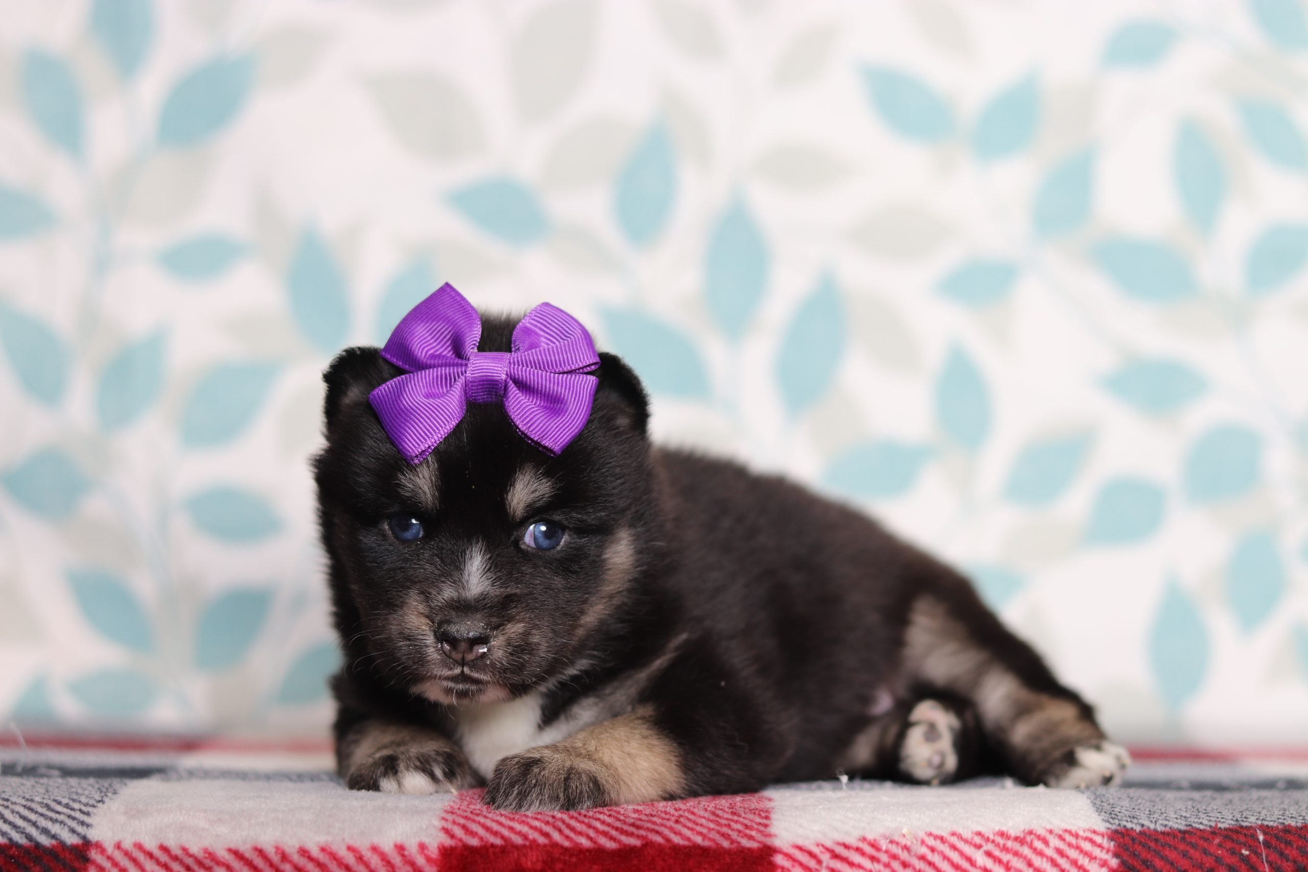 Hettie, a precious little Pomsky girl! She enjoys every minute of snuggling together! She loves being pampered and getting belly rubs! She did great with (ENS) Early Neurological Stimulation and enjoys playing with toys and running around! She is a friendly and adorable girl!