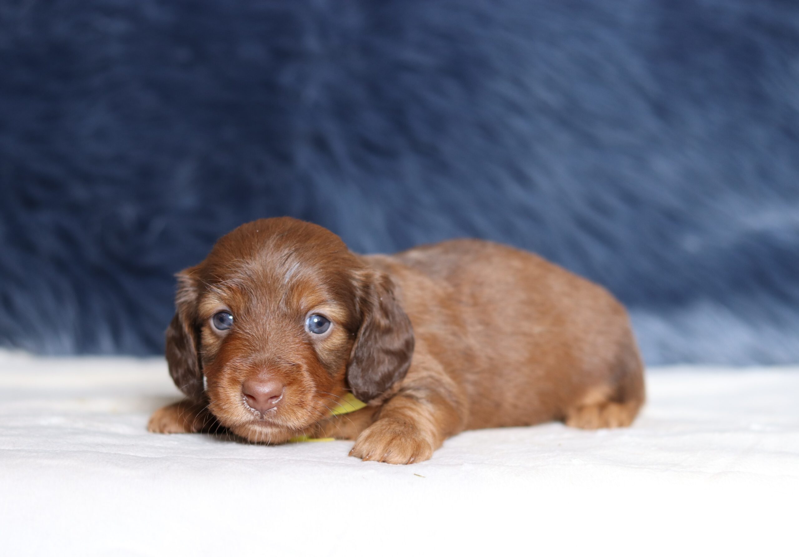 Hunter is a long haired Dachshund, he enjoys getting all the attention he can and loves to play with his toys. He did great with his (ENS) Early Neurological Stimulation, he is definitly a joy to have around. He is happy to please just a super friendly little guy!