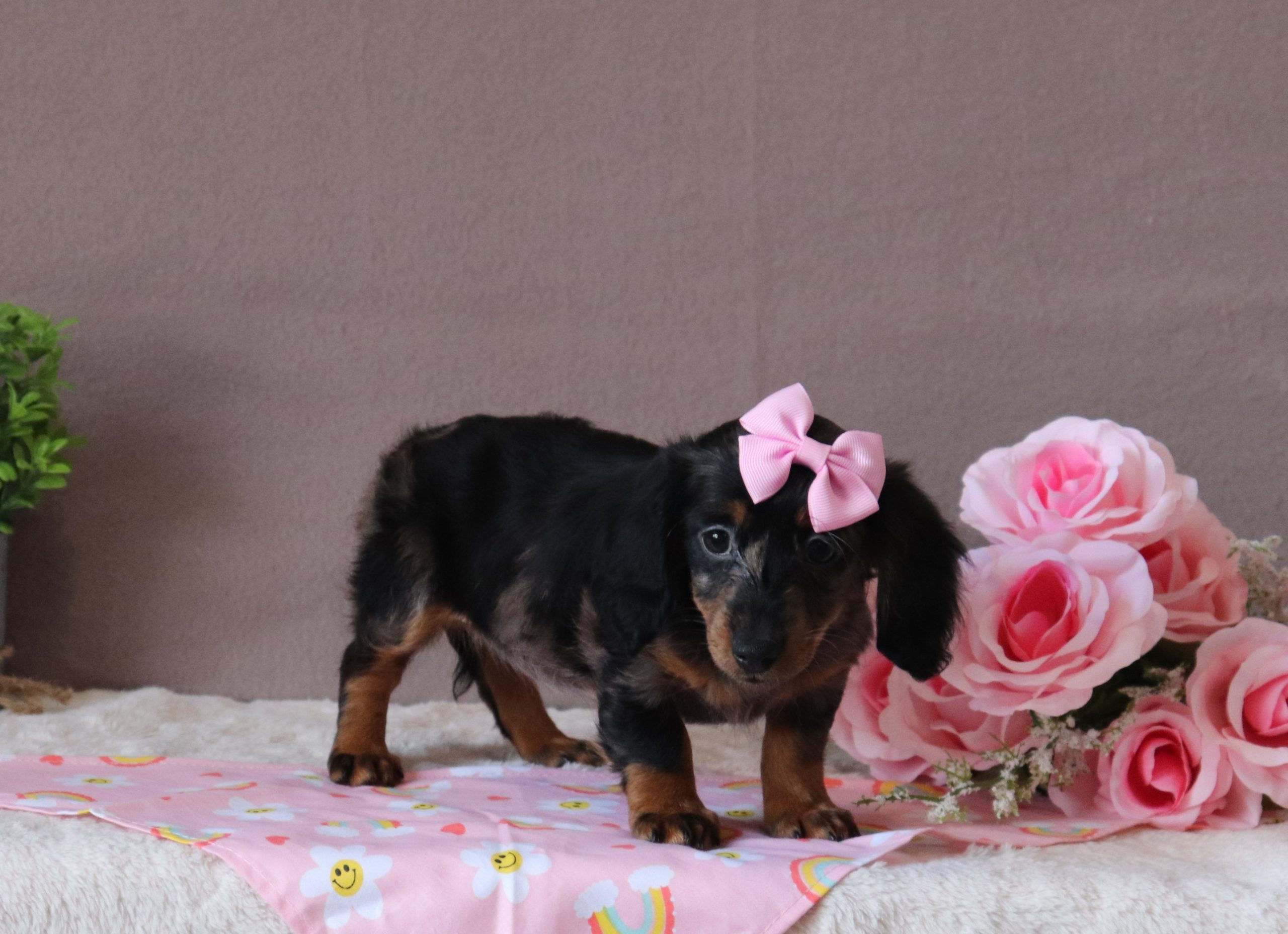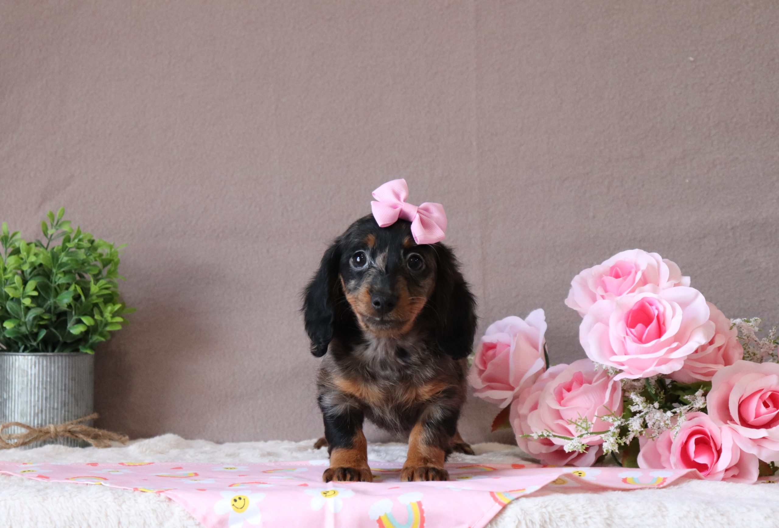 Jackie, the longhaired mini dachshund, is very caring and sweet! She is such a cheerful little girl a great companion to her littermates! She is eager to please and a bundle of love! Her haircoat is a beautiful blue dapple!!