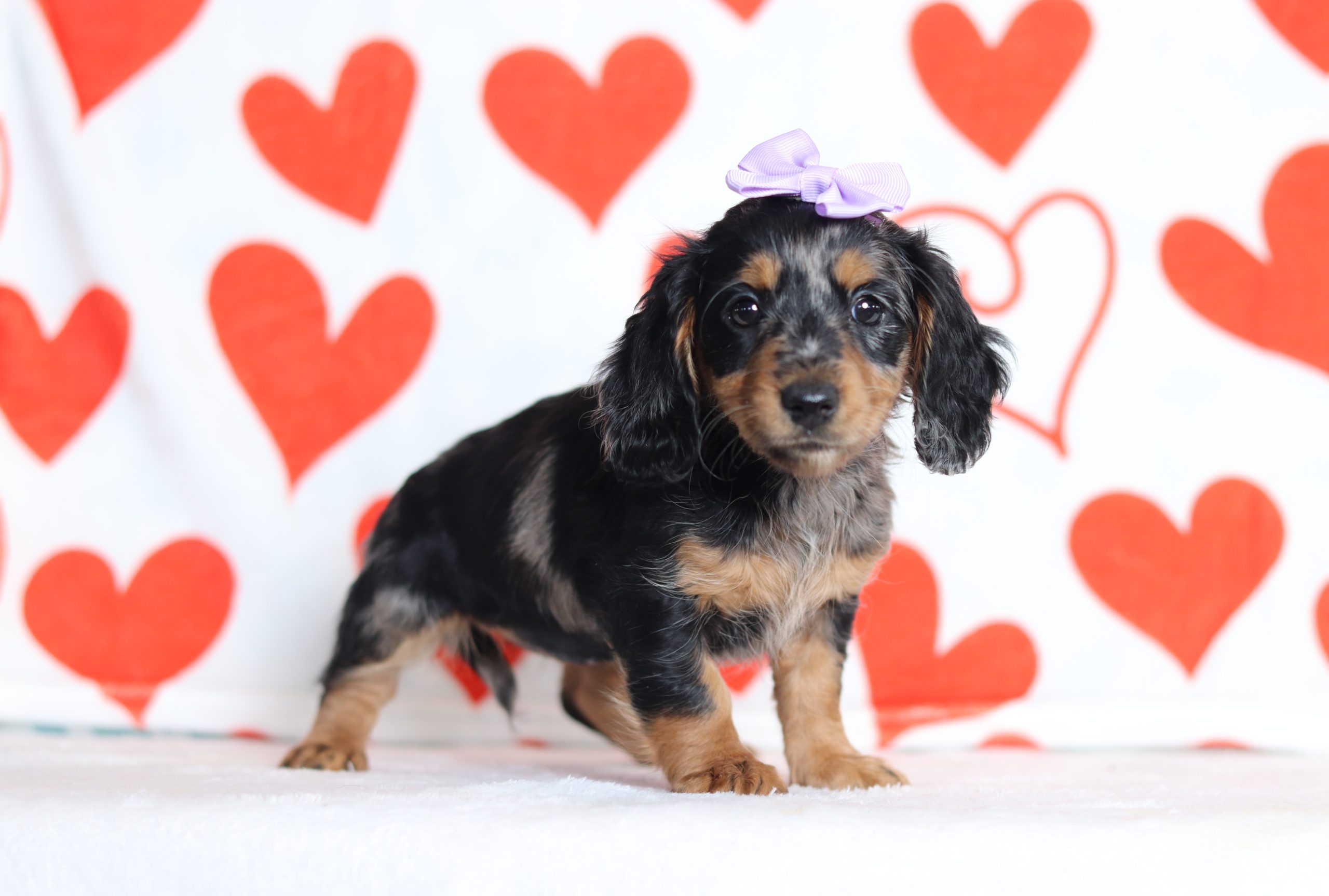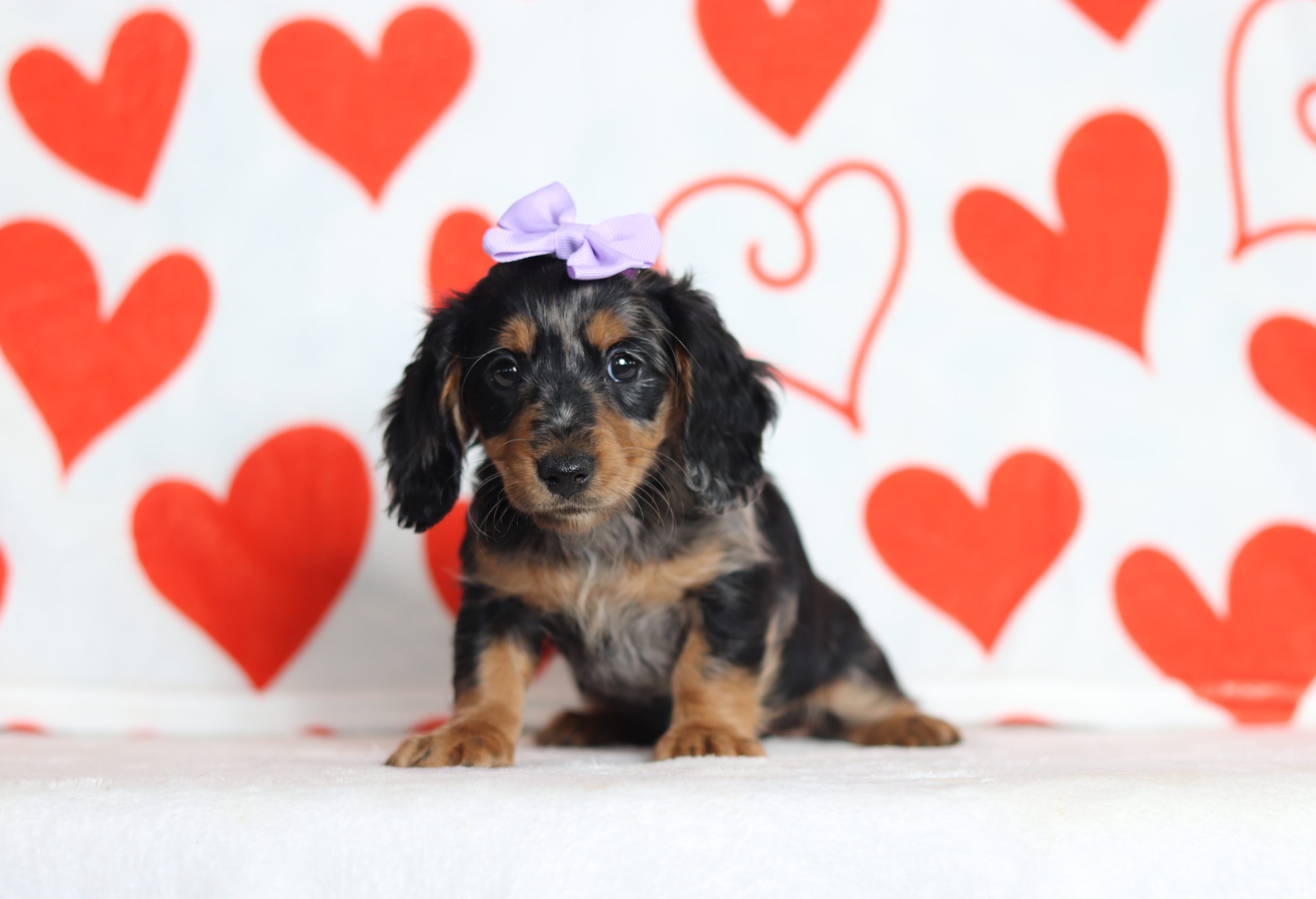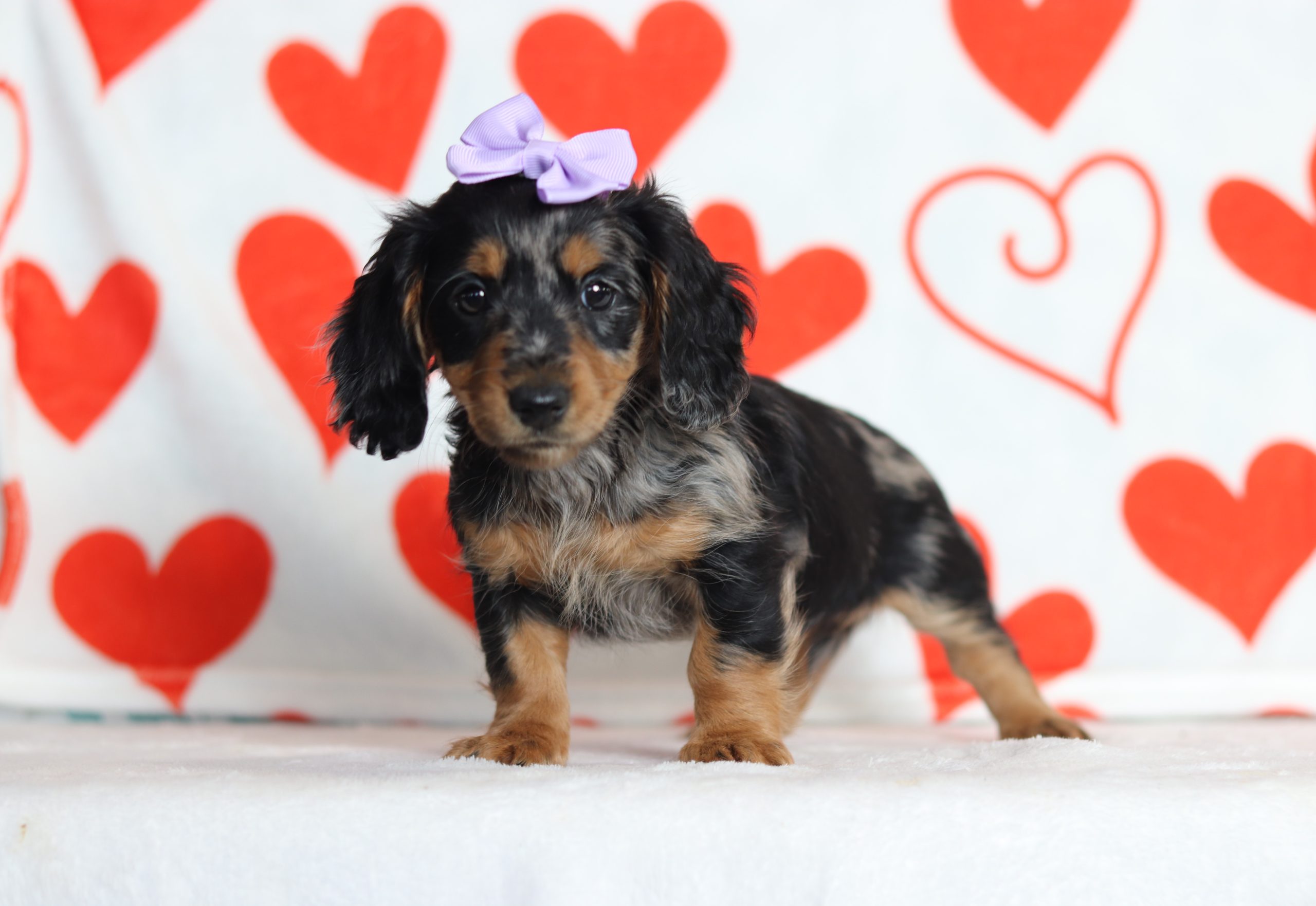 Jada, the longhaired,mini dachshund, is very caring and sweet! She has a gorgeous blue merle coat!! She is such a cheerful little girl ,a great companion to her littermates! Her temperament is wonderful! She is eager to please and a bundle of love!