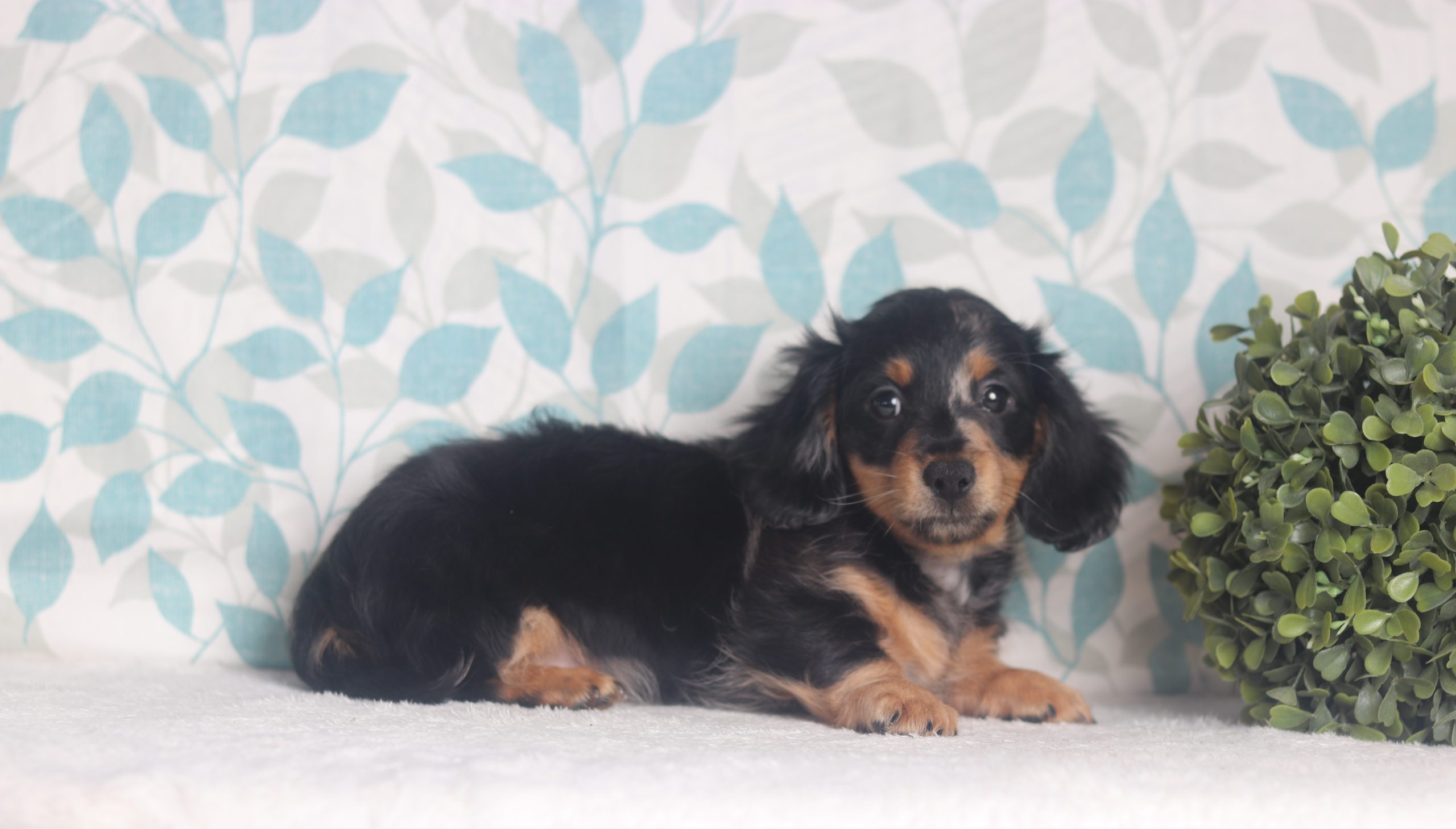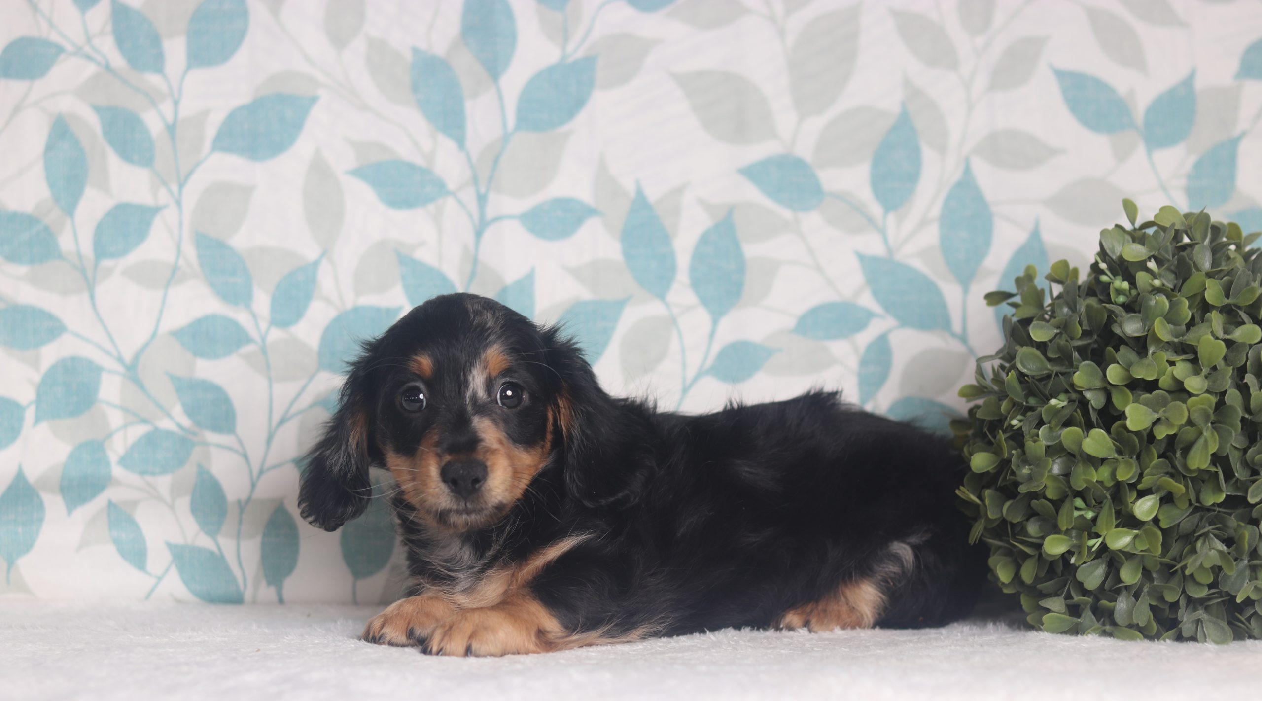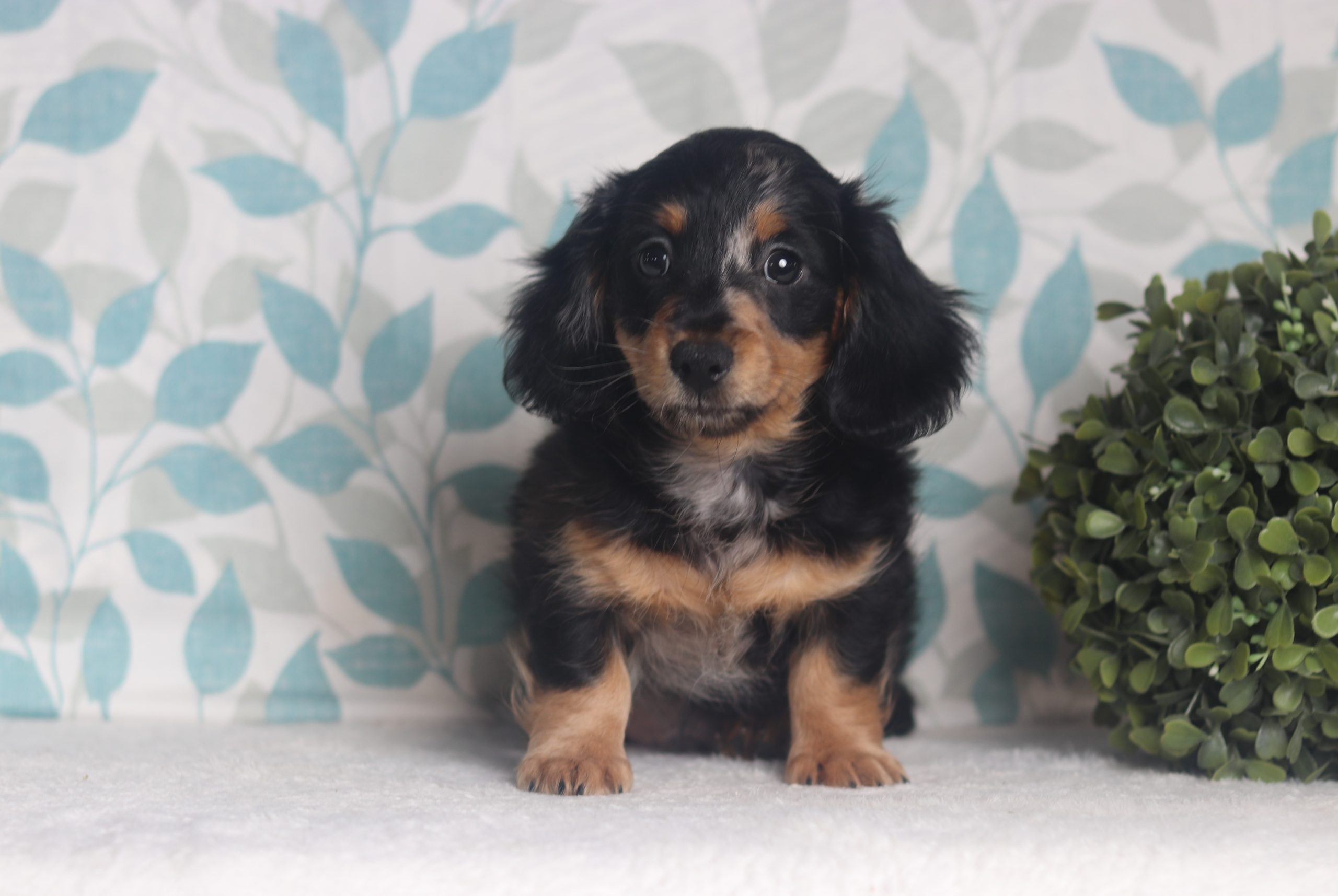 Jamie, the longhaired mini dachshund boy is soft and cuddly! He’s got a gorgeous blue dapple coat! He is calm and easy going loves to be held and cuddled. He did great with his (ENS) Early Neurological Stimulation, and is enjoyable all around. A very friendly and lovable guy!