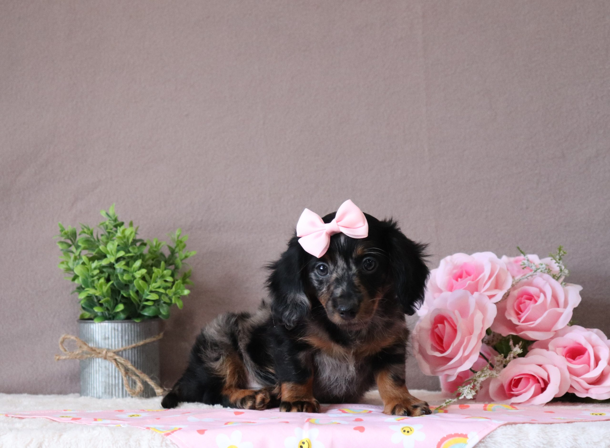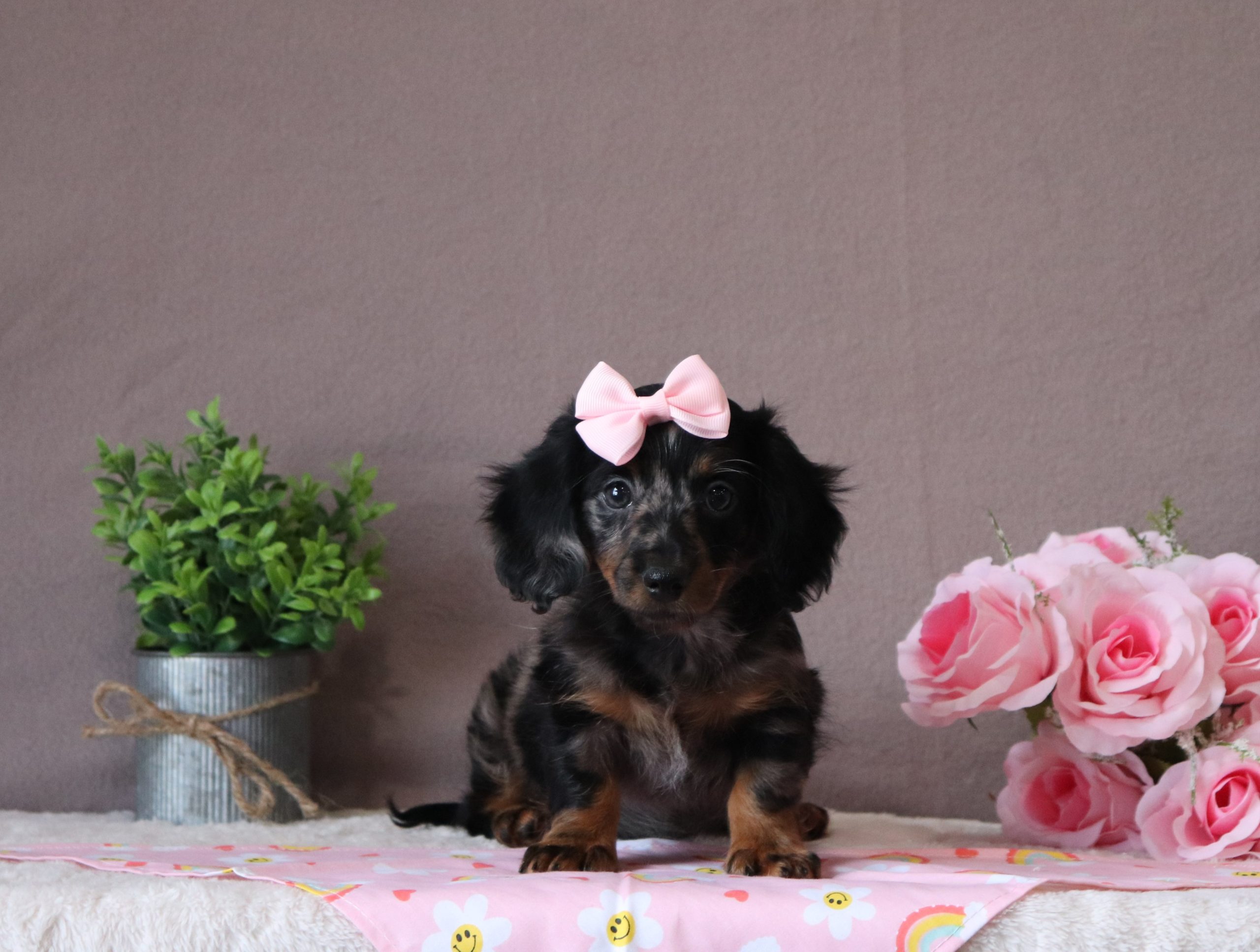 Jezebel, a precious little longhaired mini dachshund girl! She enjoys every minute of snuggling together! She loves being pampered and getting belly rubs! She did great with (ENS) Early Neurological Stimulation and enjoys playing with toys and running around! She is a friendly and adorable girl!