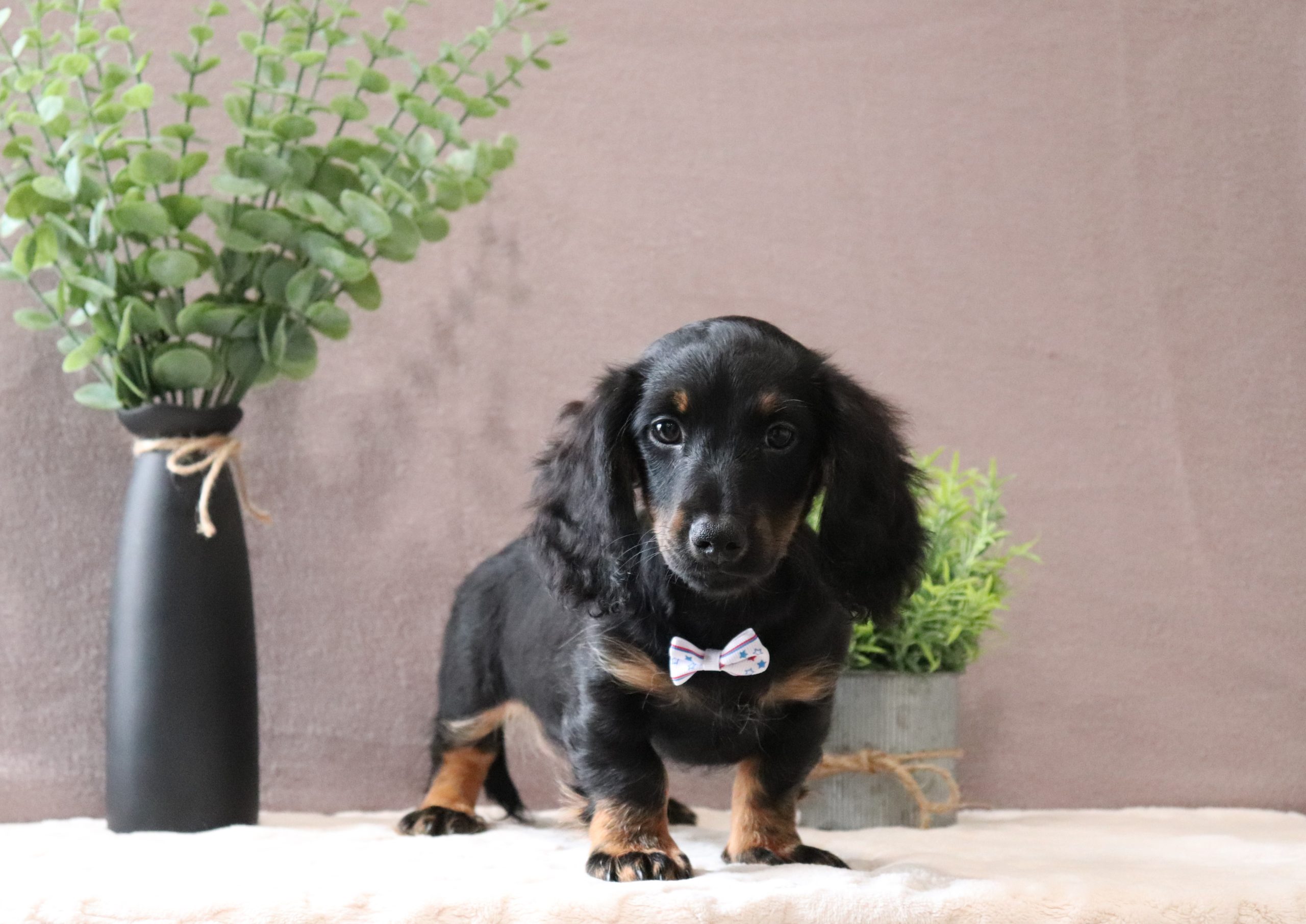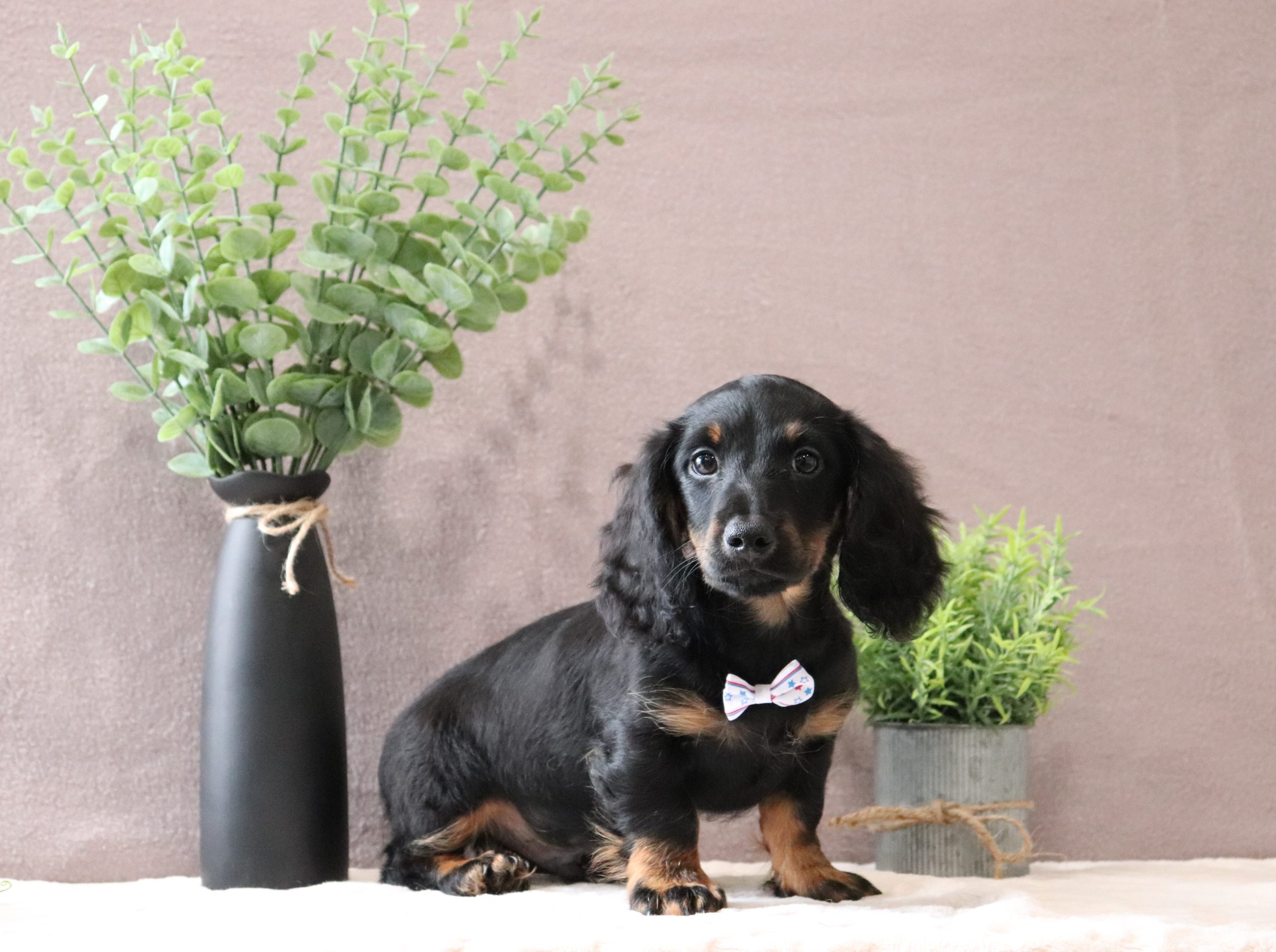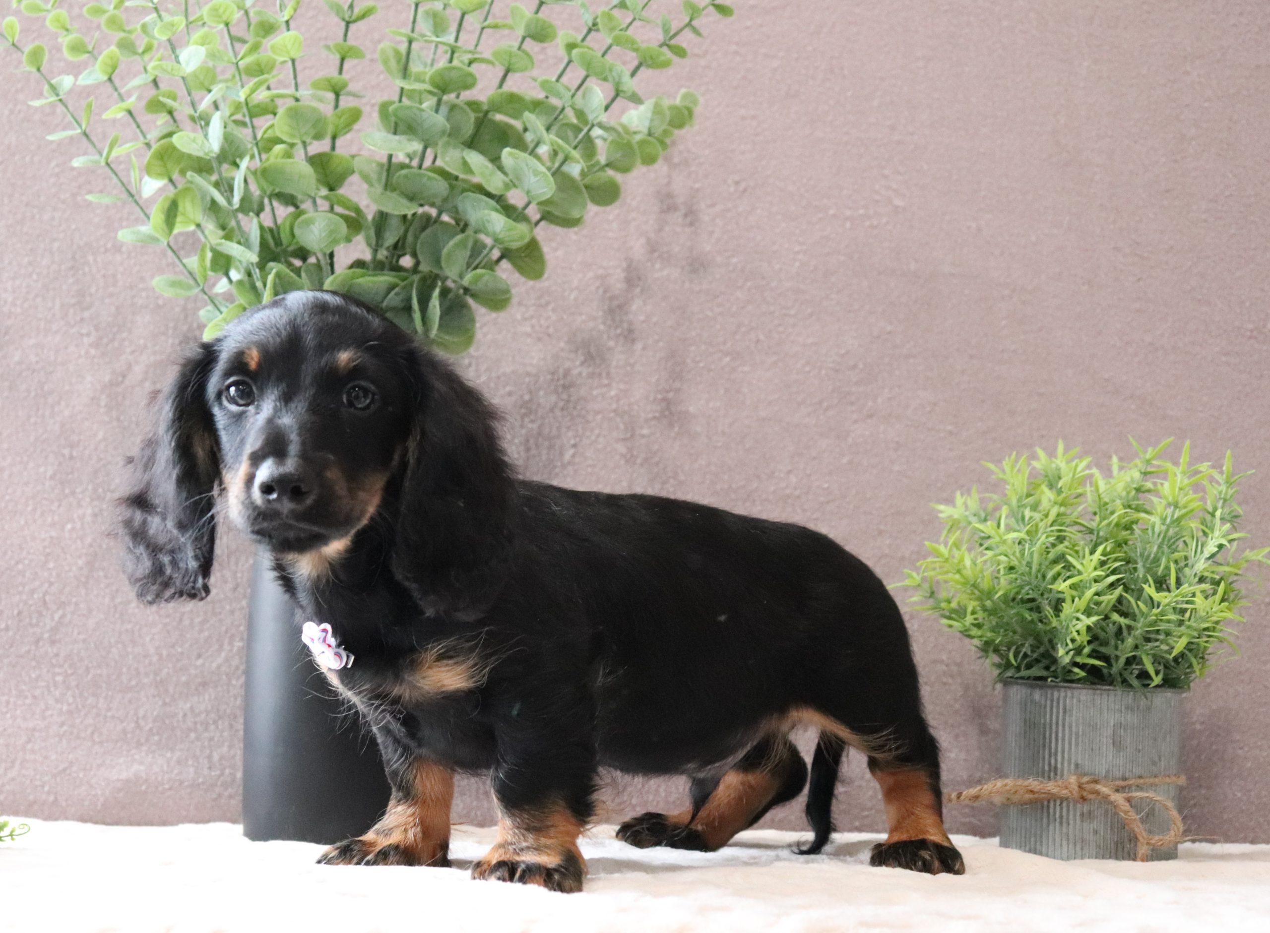 Hello, this is Johnny! He’s a cute little, longhaired, mini dachshund boy! He’s got a pretty black/tan soft, furry coat and 2 shining eyes. He loves to play with his siblings and also loves to be held and cuddled! He will be sure to shower you with lots of kisses!