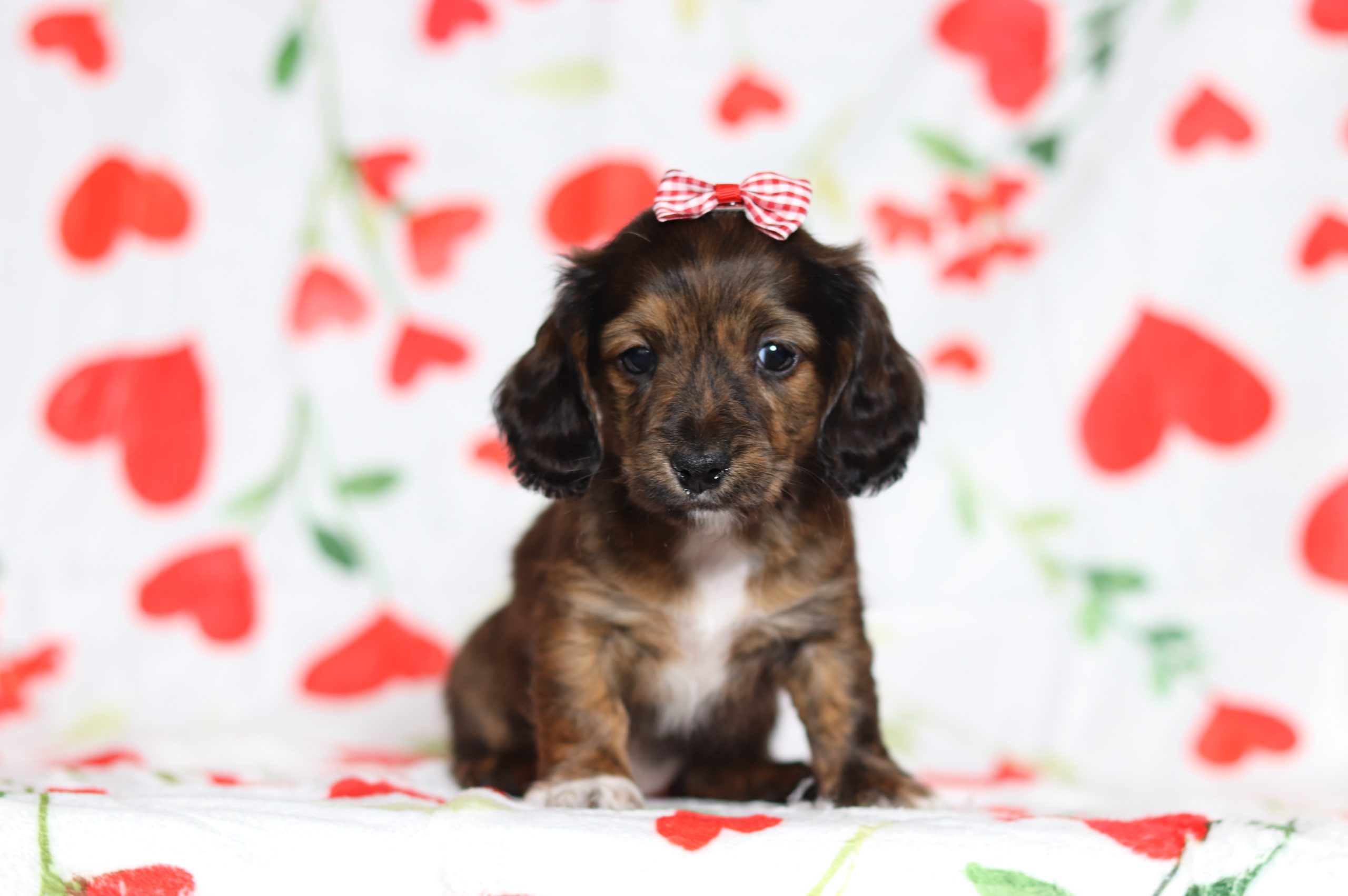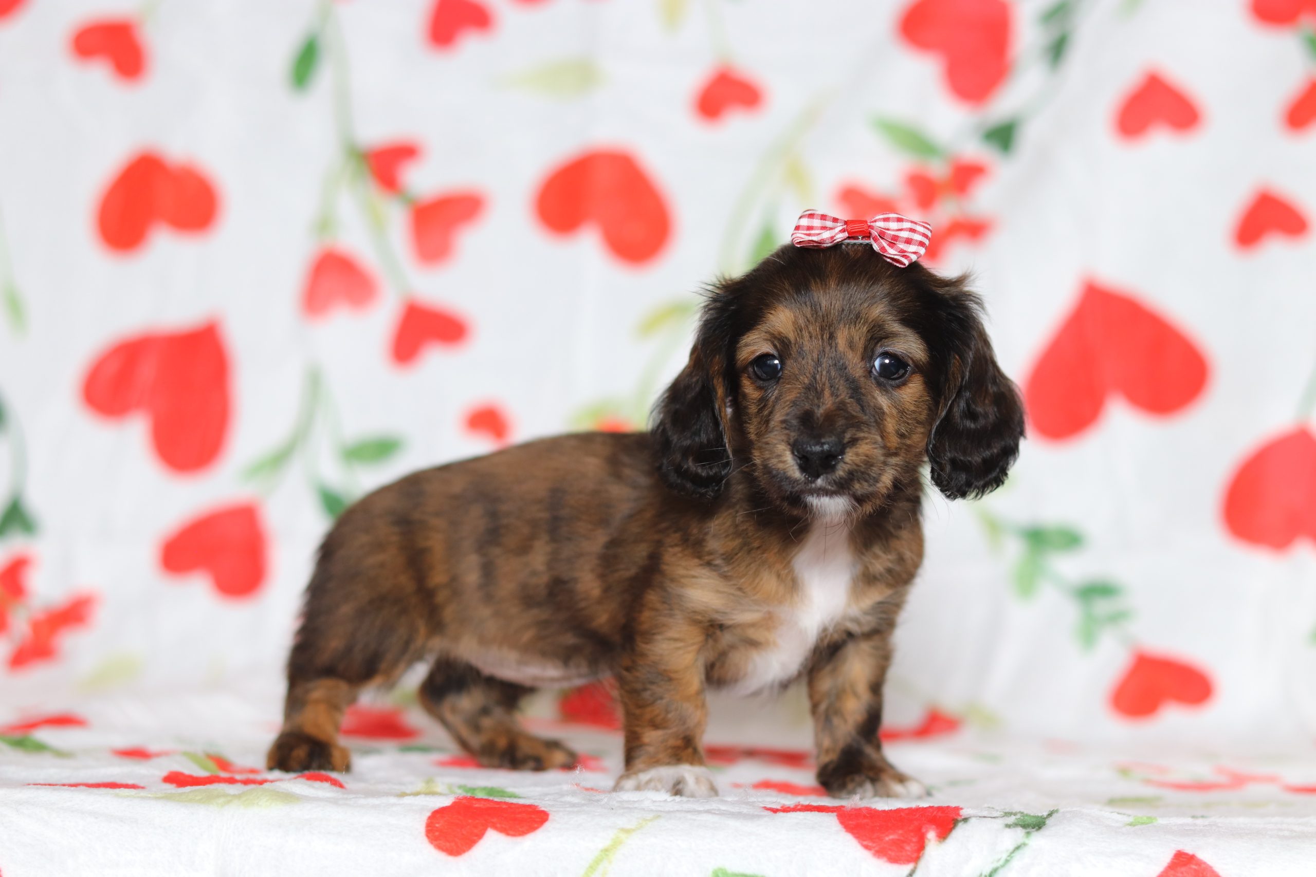 Hello, this is Lala! She’s a little cutie, with her beautiful,longhaired, brindle coat, and 2 shining eyes!She was born with a shorter tail than usual.Making her special and unique!! She loves to play with her siblings and also loves to be held and cuddled! She will be sure to shower you with lots of kisses!