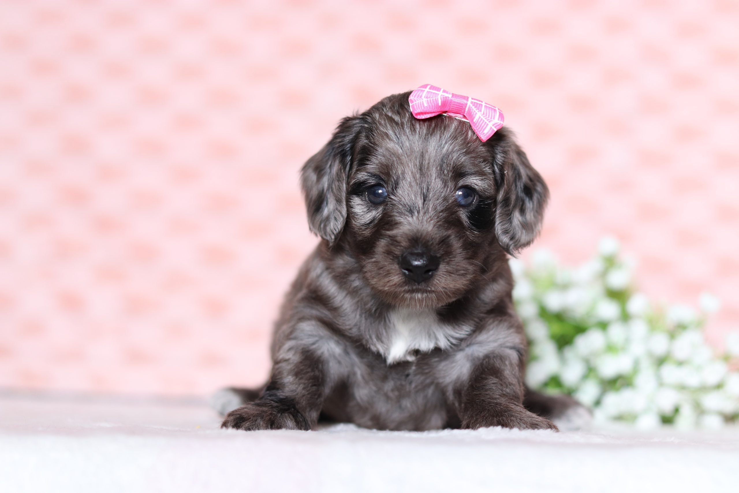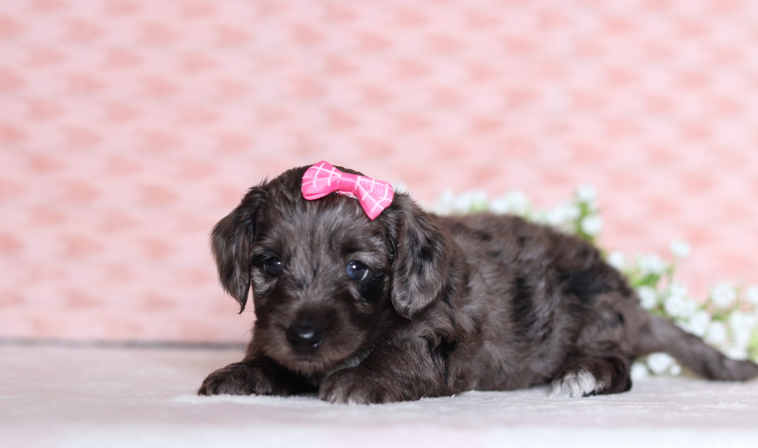 Hello, this is Lena! She’s a cute little Doxypoo girl, with a beautiful, merle coat and 2 shining eyes. She loves to play with her siblings and also loves to be held and cuddled! She will be sure to shower you with lots of kisses!