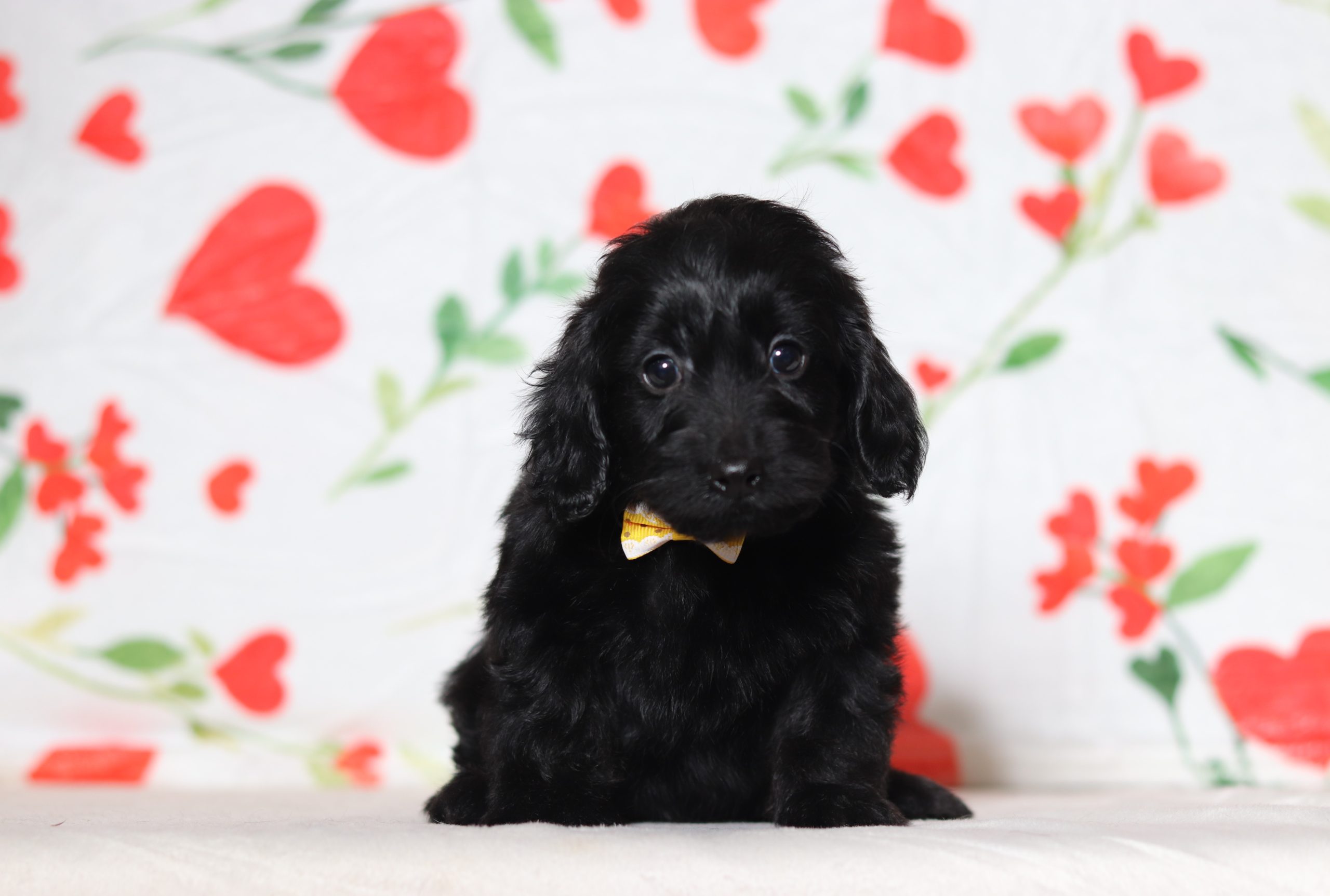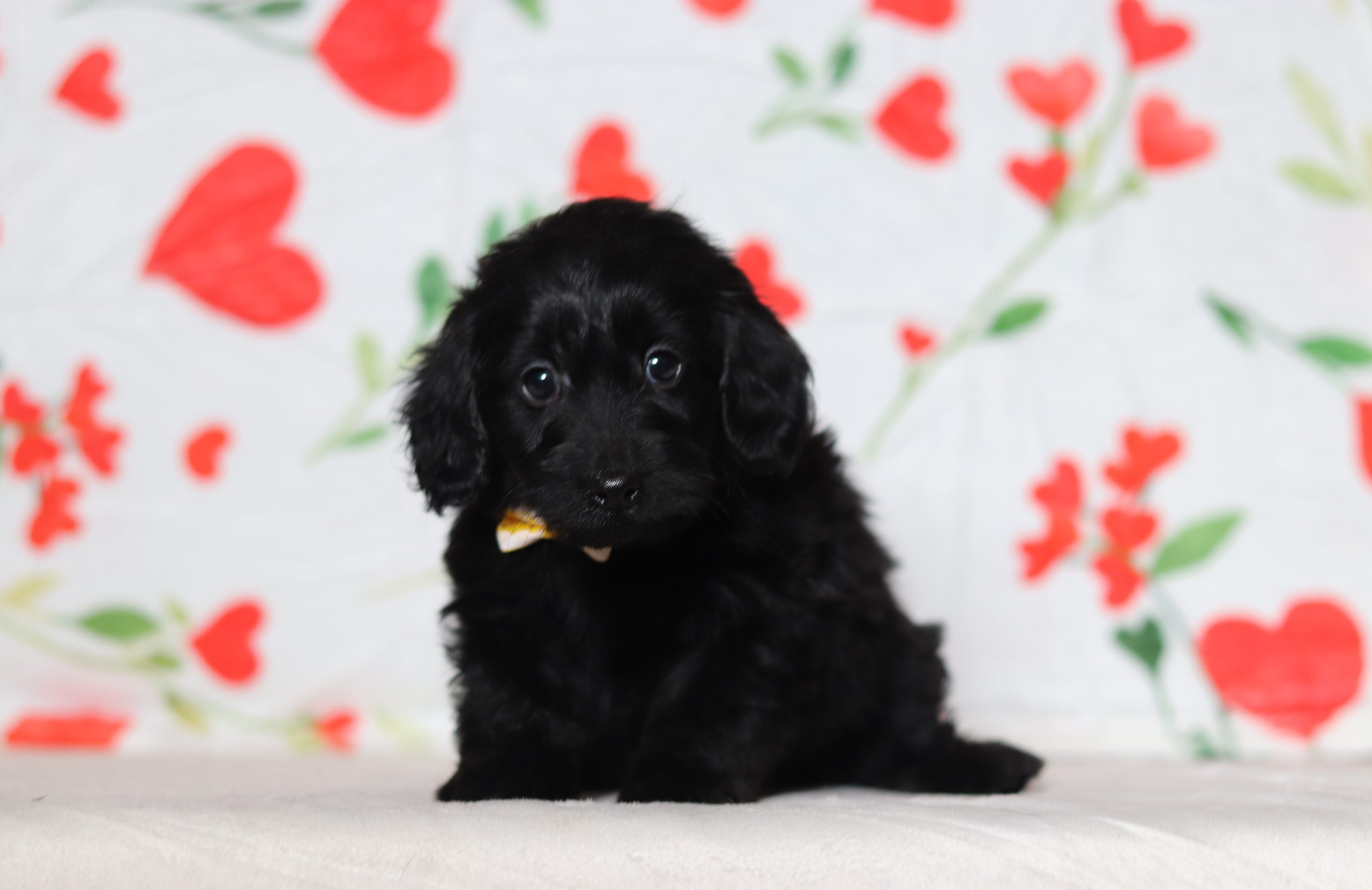 Hello, this is Louie! He’s a cute little pomsky boy with a silky,black , furry coat and 2 shining eyes. He loves to play with his siblings and also loves to be held and cuddled! He will be sure to shower you with lots of kisses!