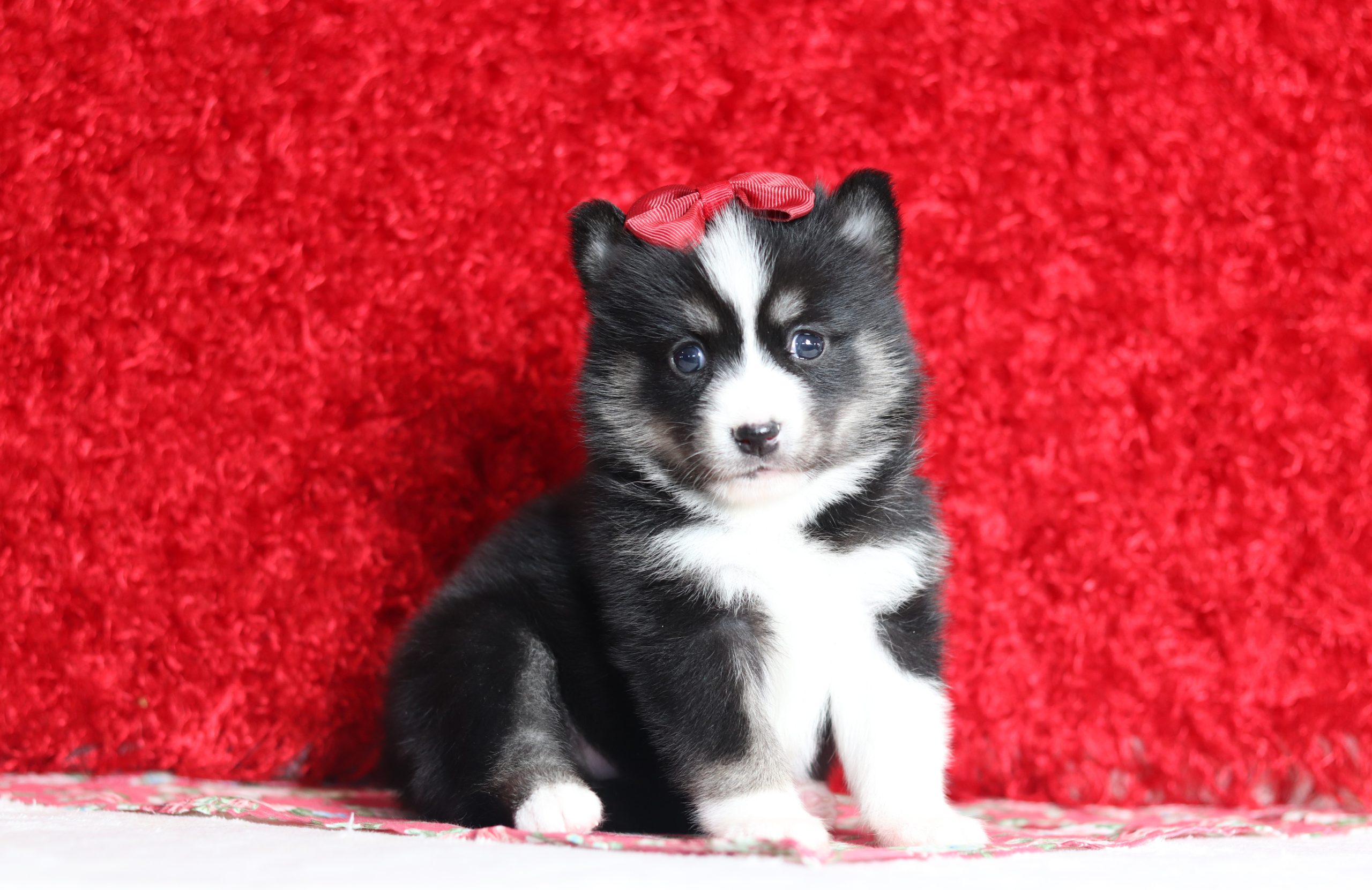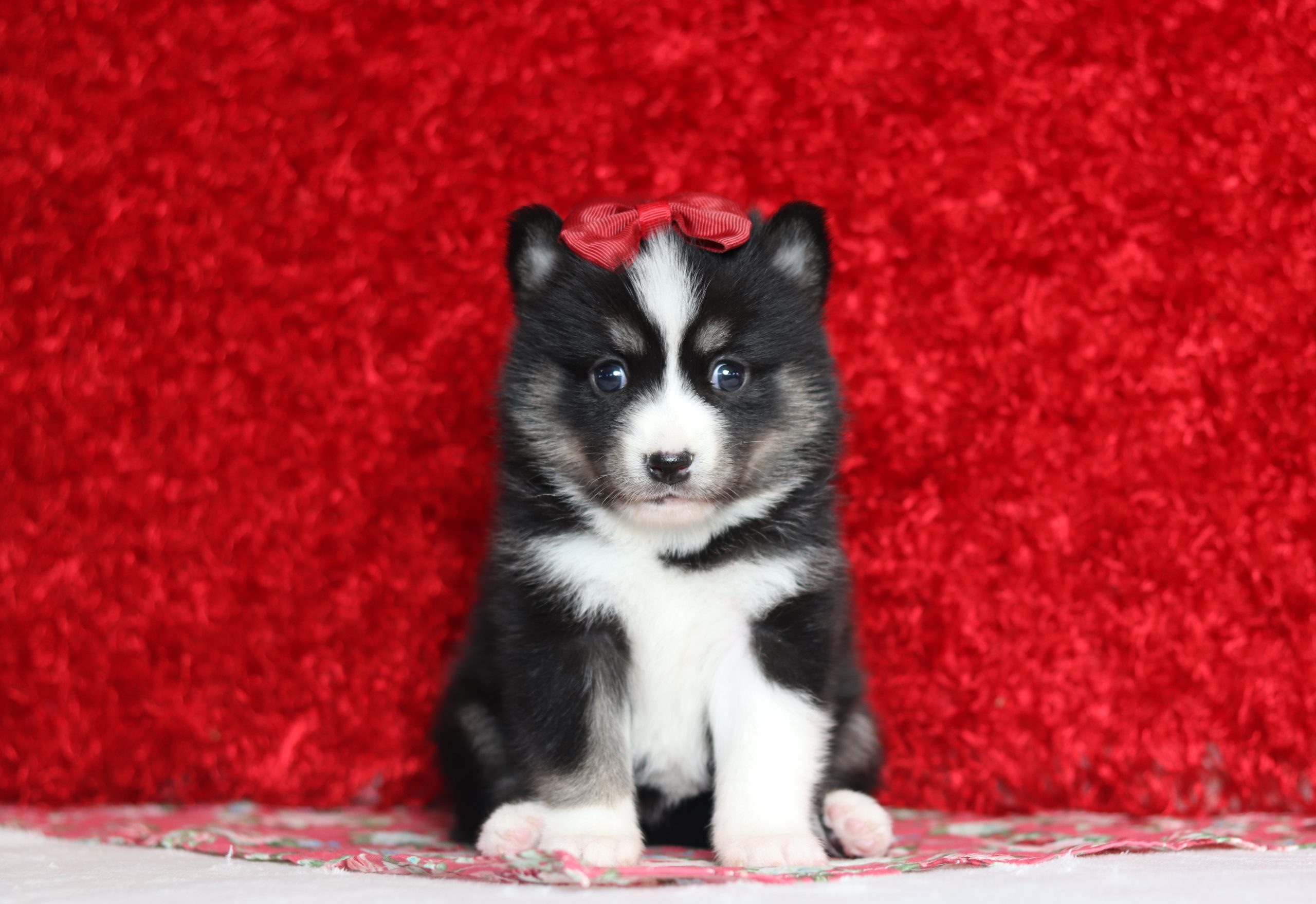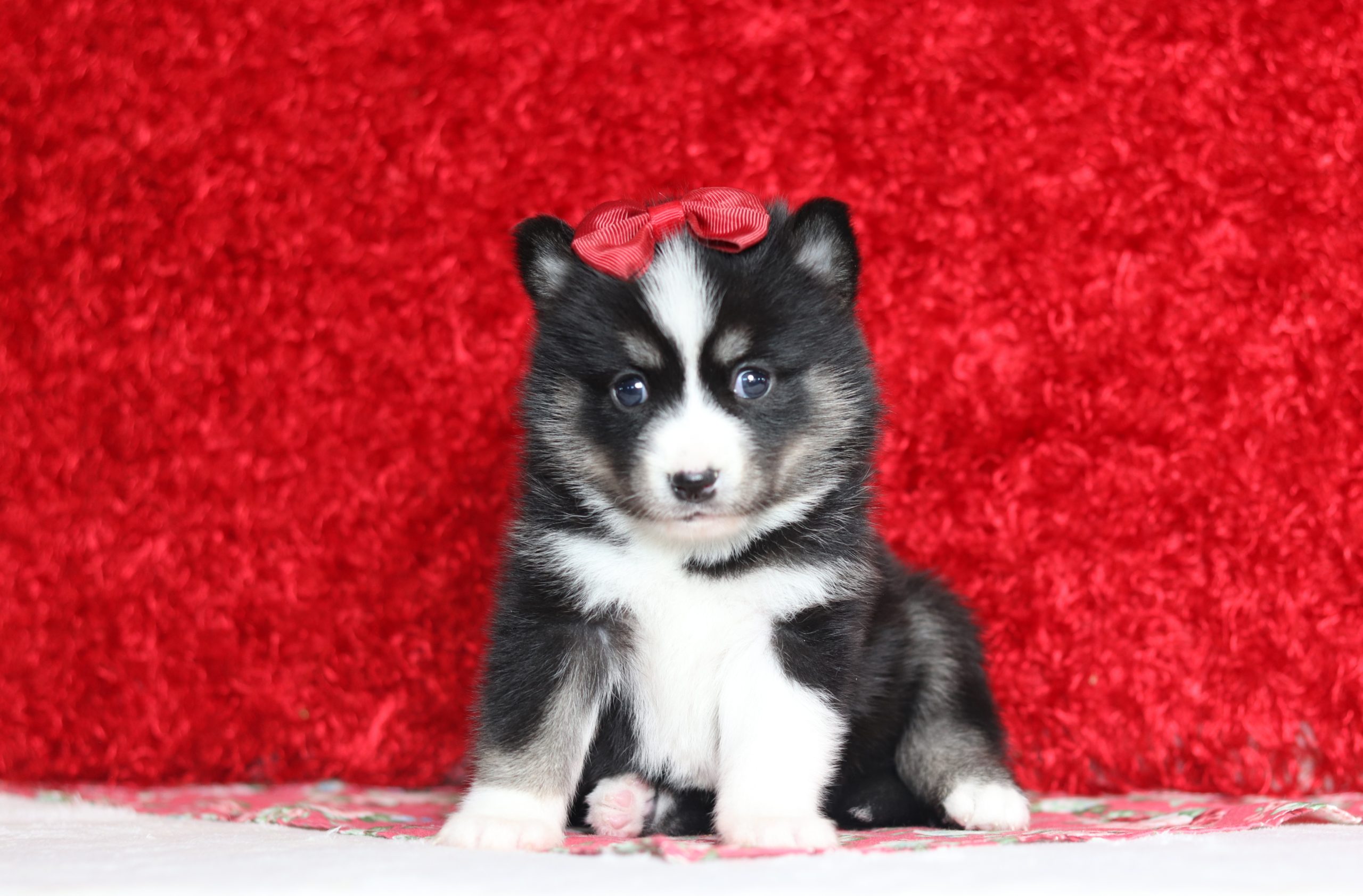 Lulu, a precious little Pomsky girl! She enjoys every minute of snuggling together! She loves being pampered and getting belly rubs! She did great with (ENS) Early Neurological Stimulation and enjoys playing with toys and running around! She is a friendly and adorable girl!