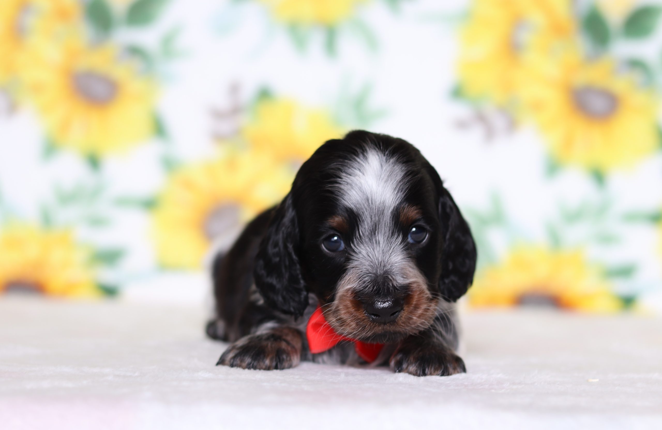 Hello, this is Manny! He’s a cute little longhaired mini dachshund boy,with a black and white, soft, furry coat and 2 shining blue eyes. He loves to play with his siblings and also loves to be held and cuddled! He will be sure to shower you with lots of kisses!