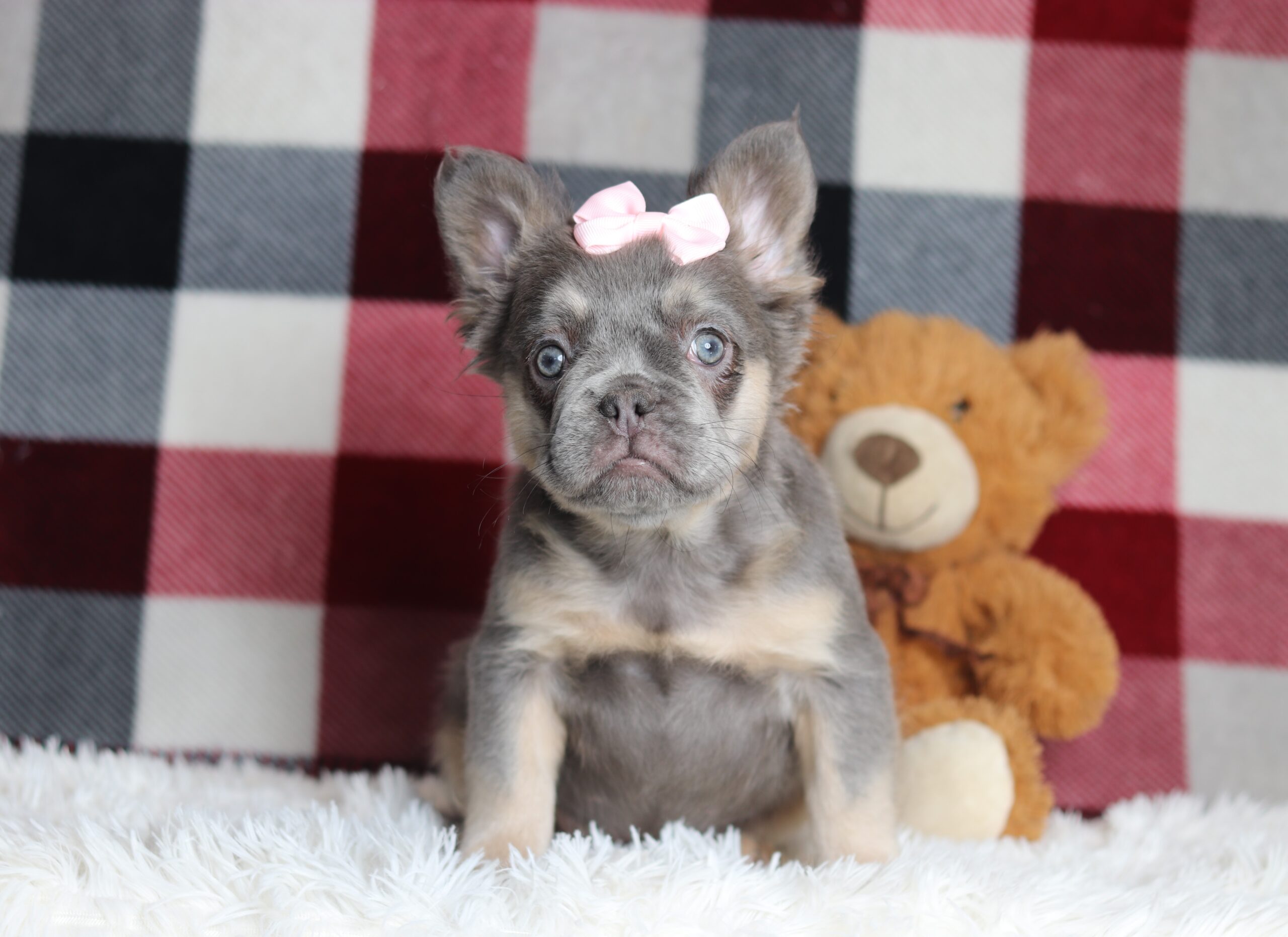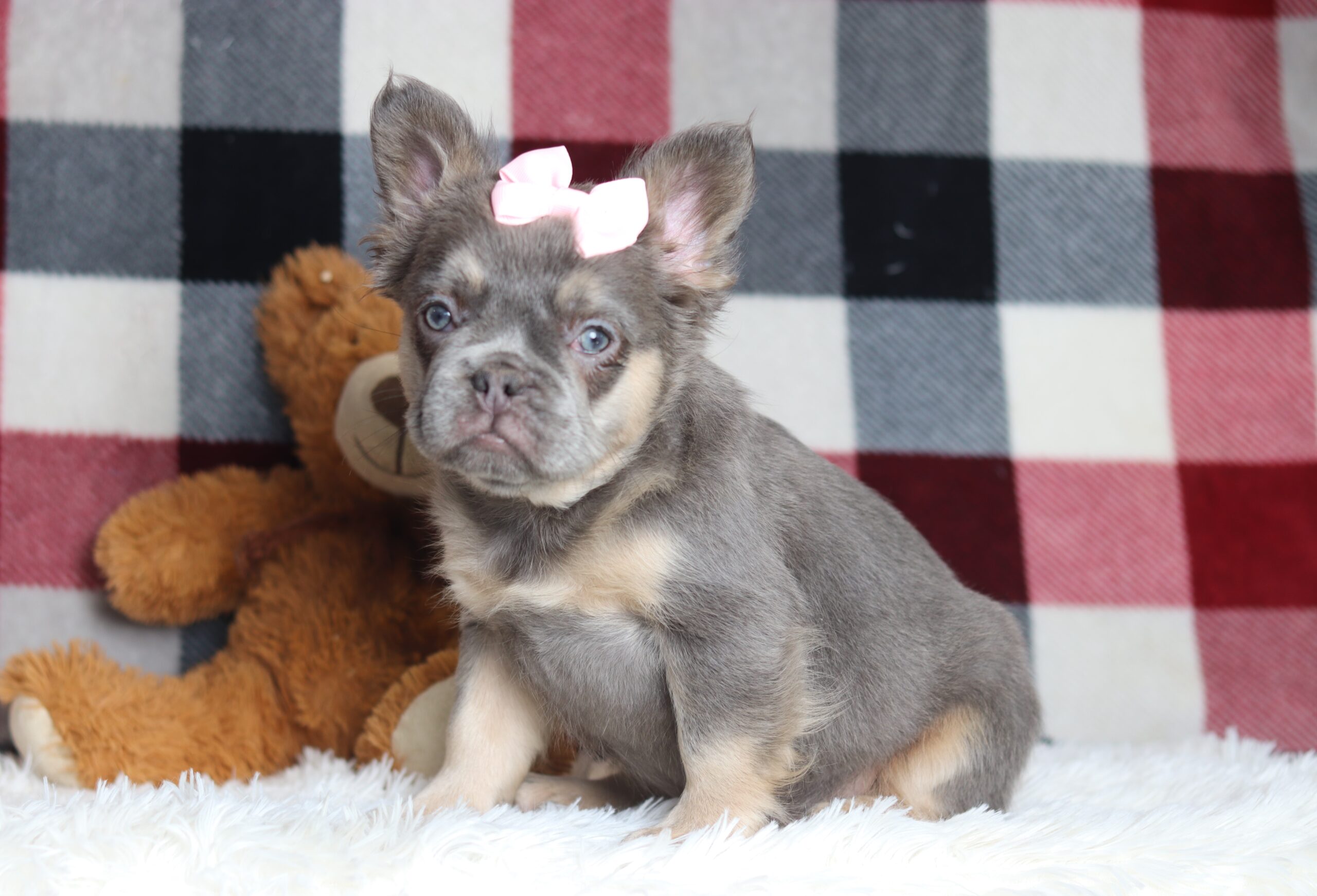 Marena the Frenchie is very caring and sweet, she has a beautiful lilac and tan coat! She is such a cheerful little girl a great companion to her littermates! Her temperament is wonderful, some of her favorites is playing outdoors and going on a walk to explore and sniff new things! She is eager to please and a bundle of love!
