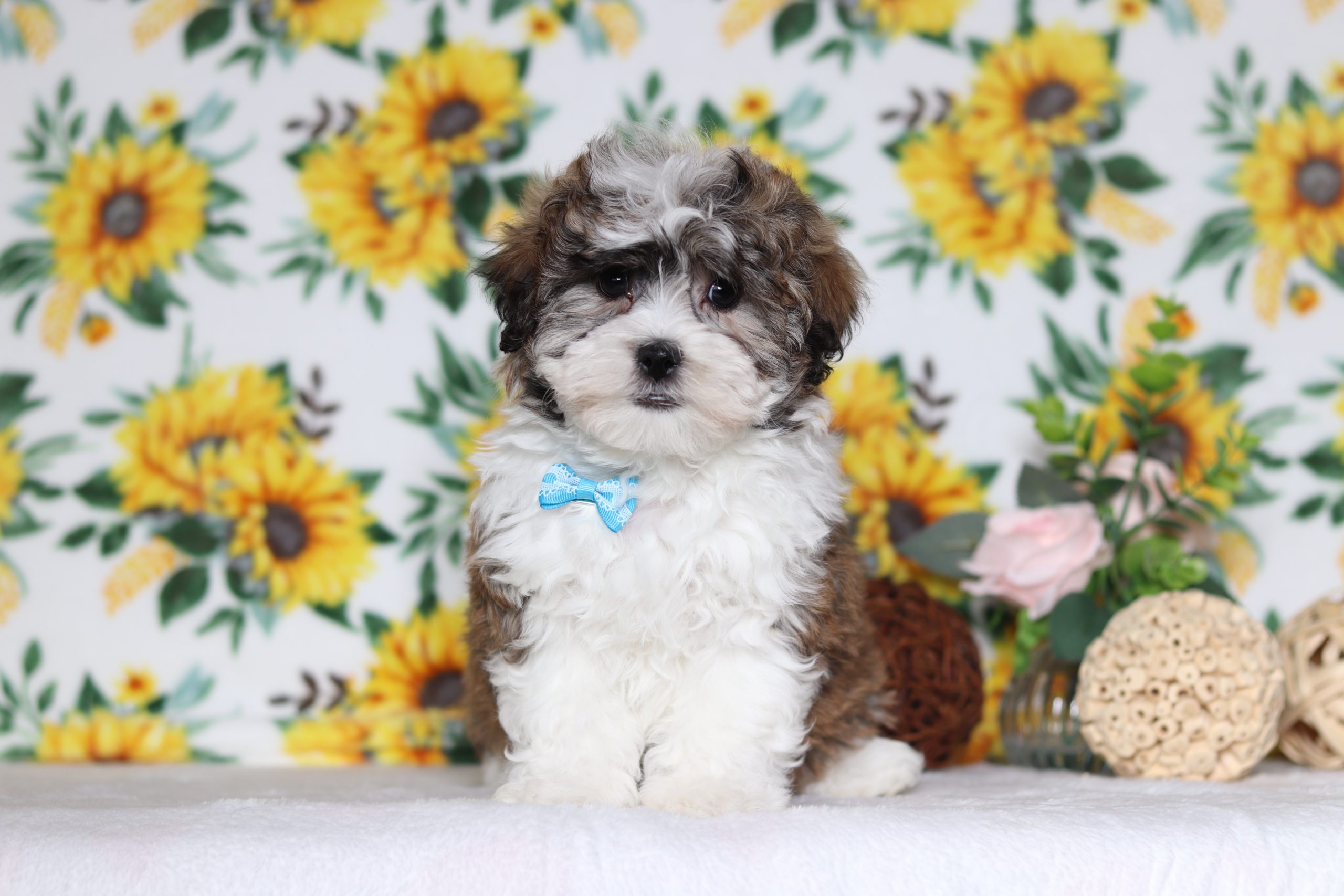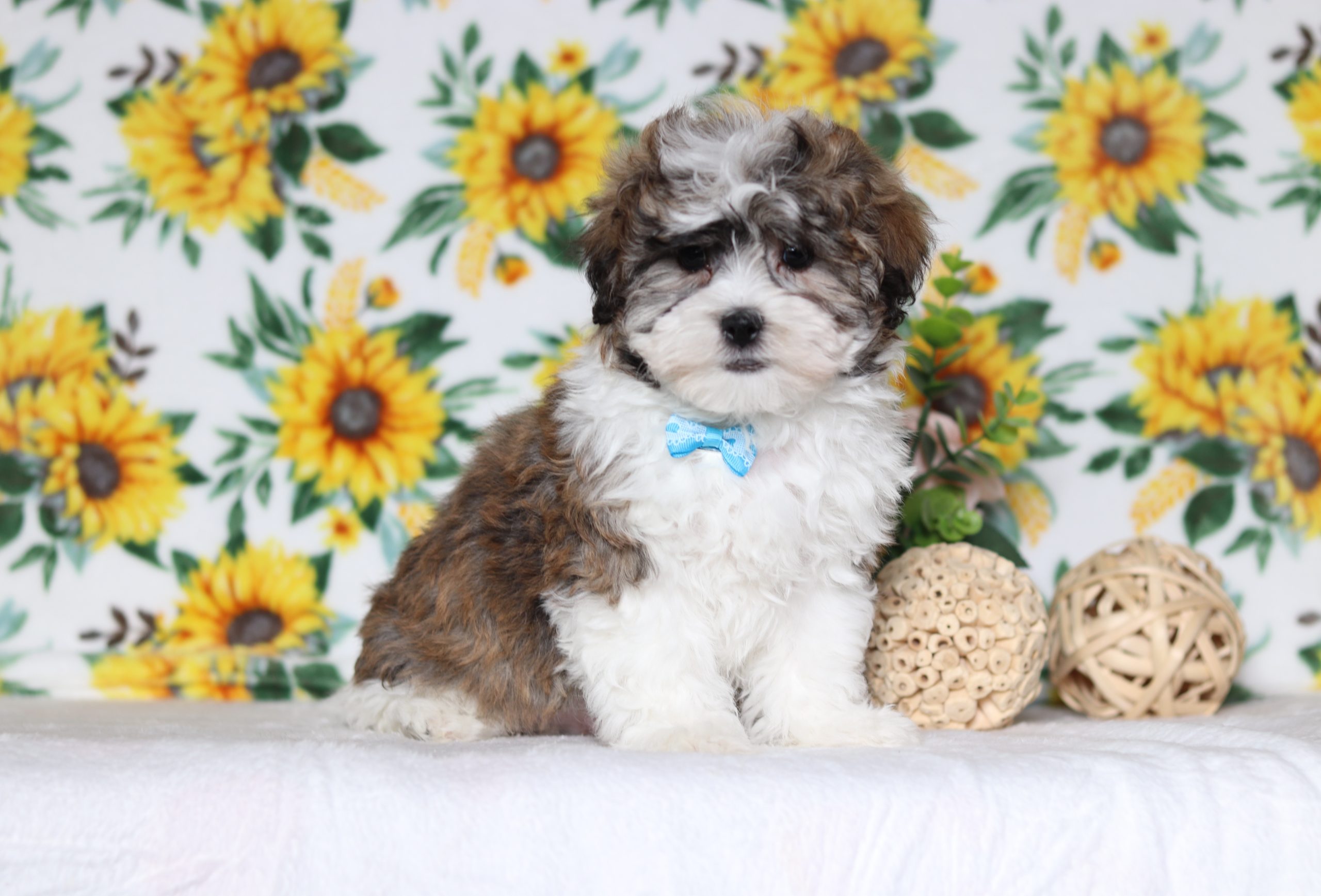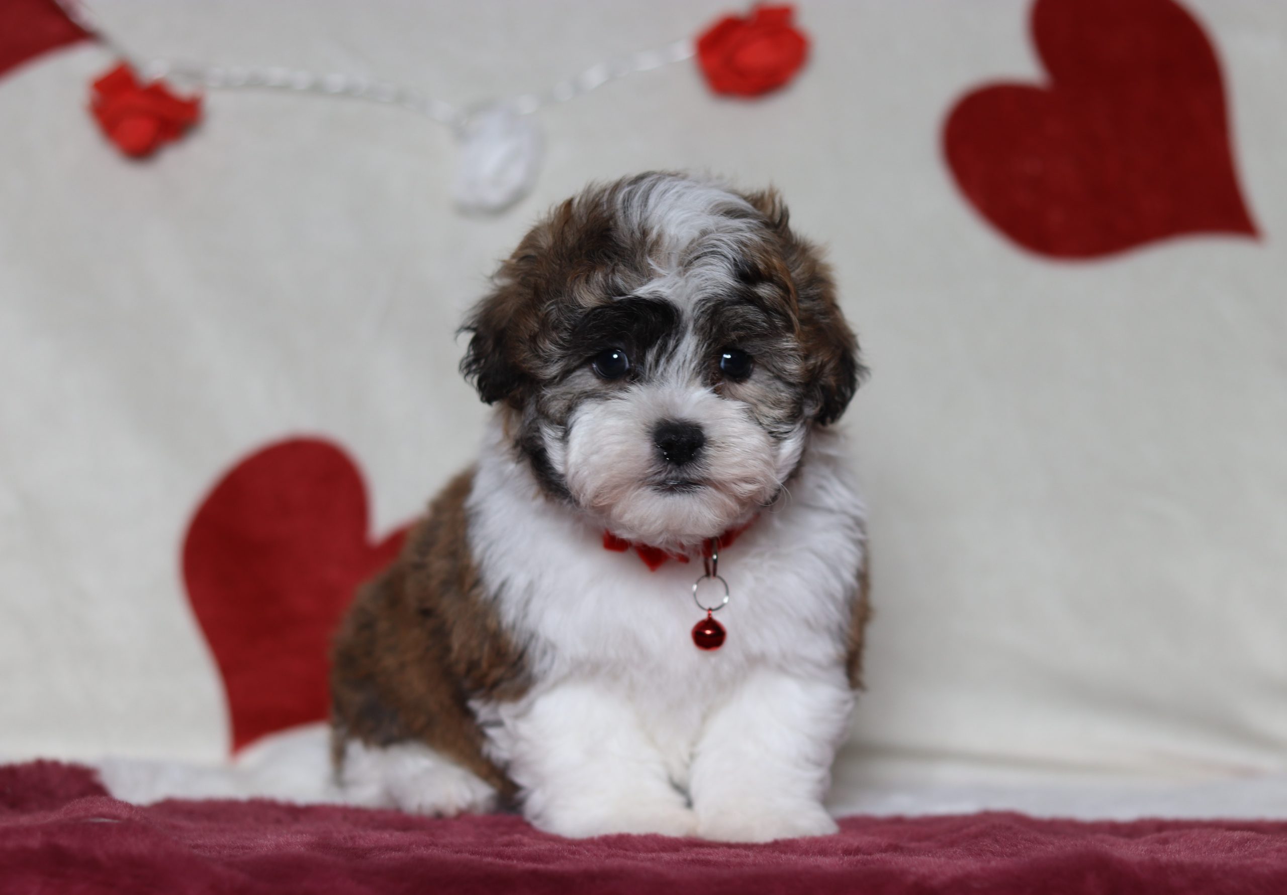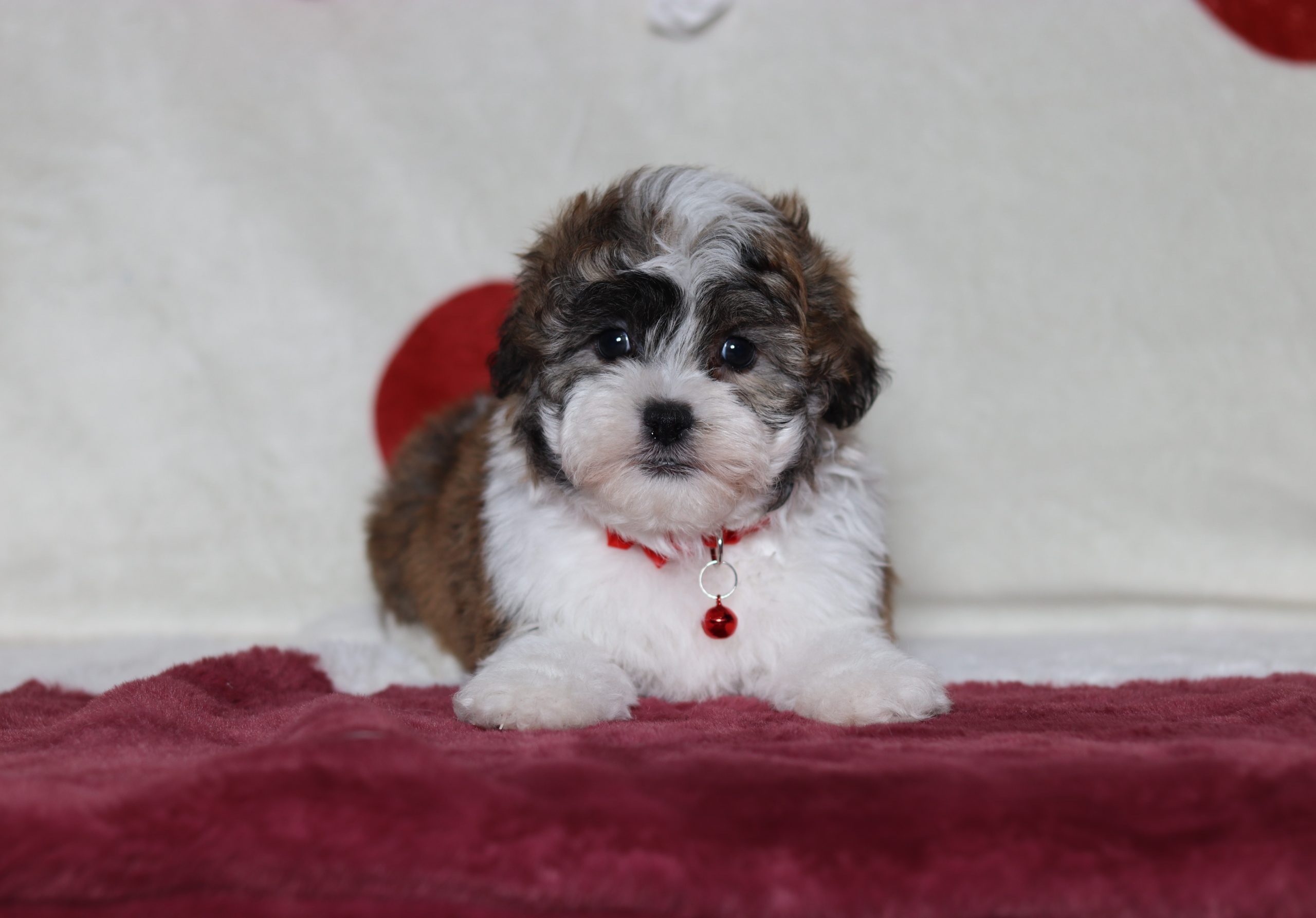 Hello, this is Nutcracker! He’s a cute little Teddy Bear boy with a brown and white soft, furry coat and 2 shining eyes. He loves to play with his siblings and also loves to be held and cuddled! He will be sure to shower you with lots of kisses! He did great with his (ENS) Early Neurological Stimulation training.