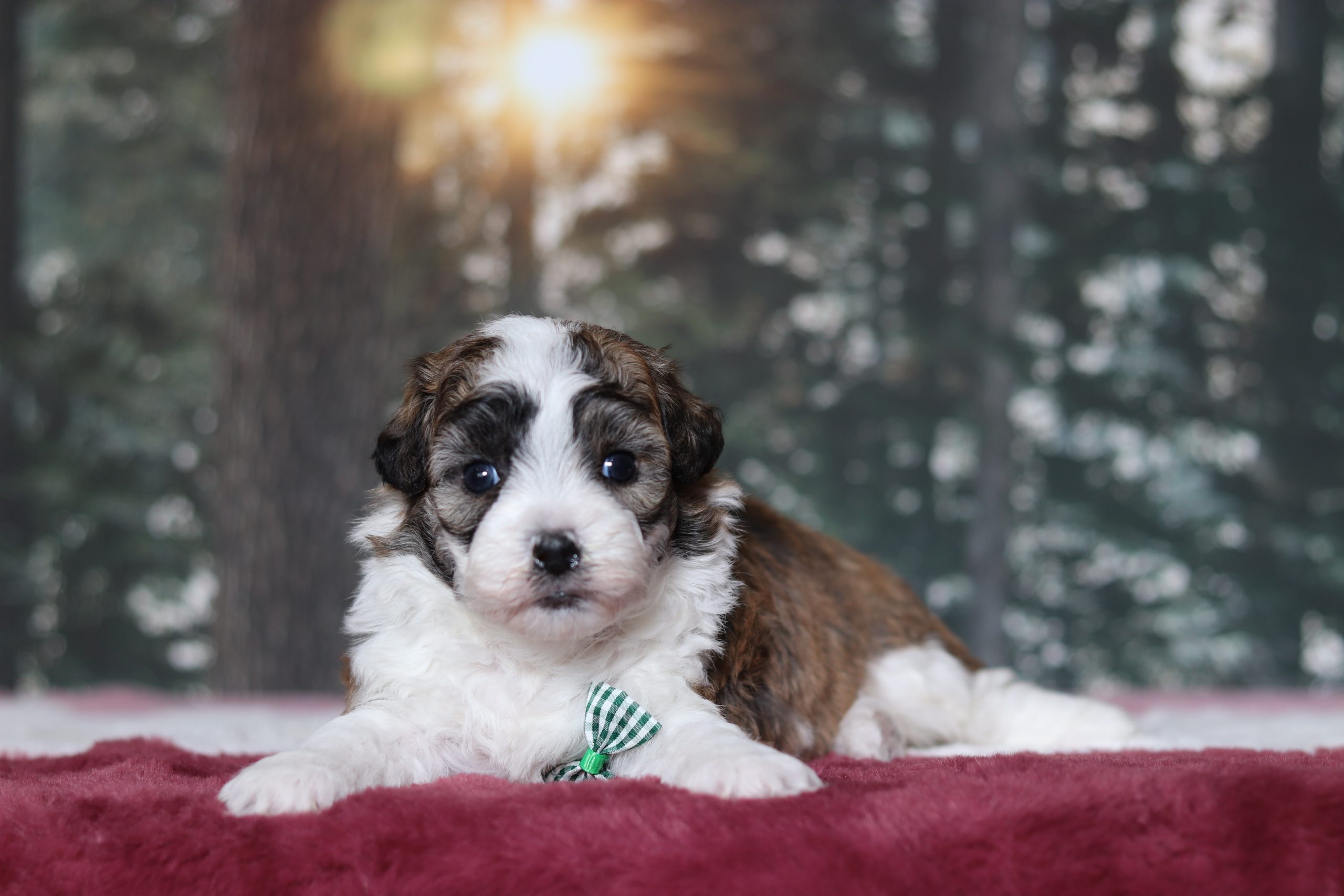 Hello, this is Nutcracker! He’s a cute little Teddy Bear boy with a  brown and white soft, furry coat and 2 shining eyes. He loves to play with his siblings and also loves to be held and cuddled! He will be sure to shower you with lots of kisses! He did great with his (ENS) Early Neurological Stimulation training.
