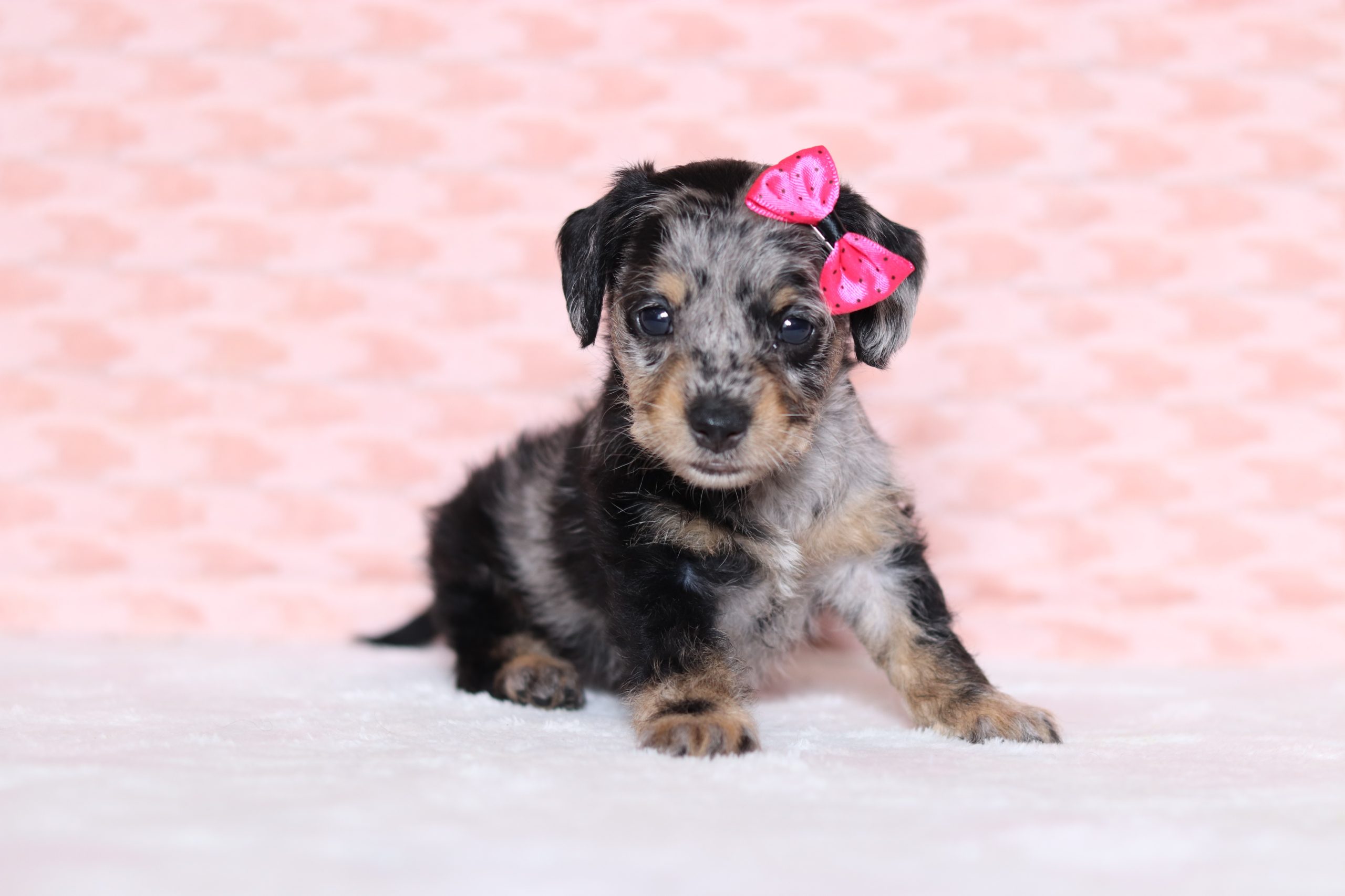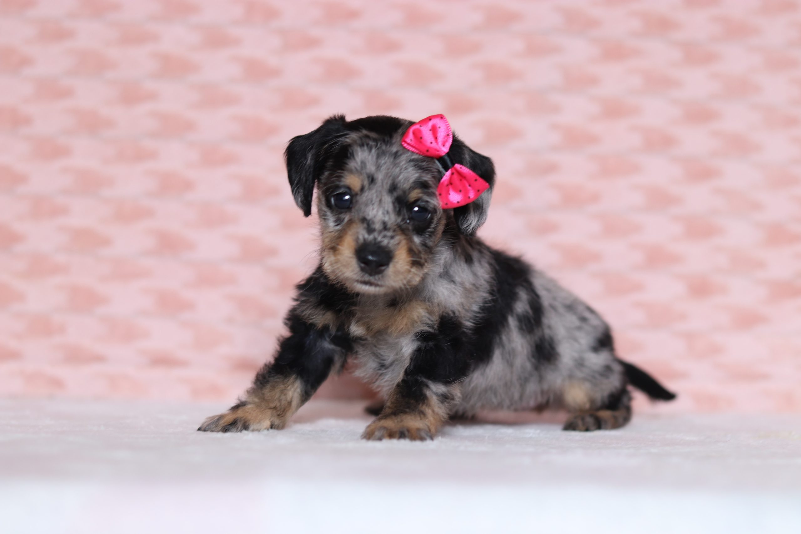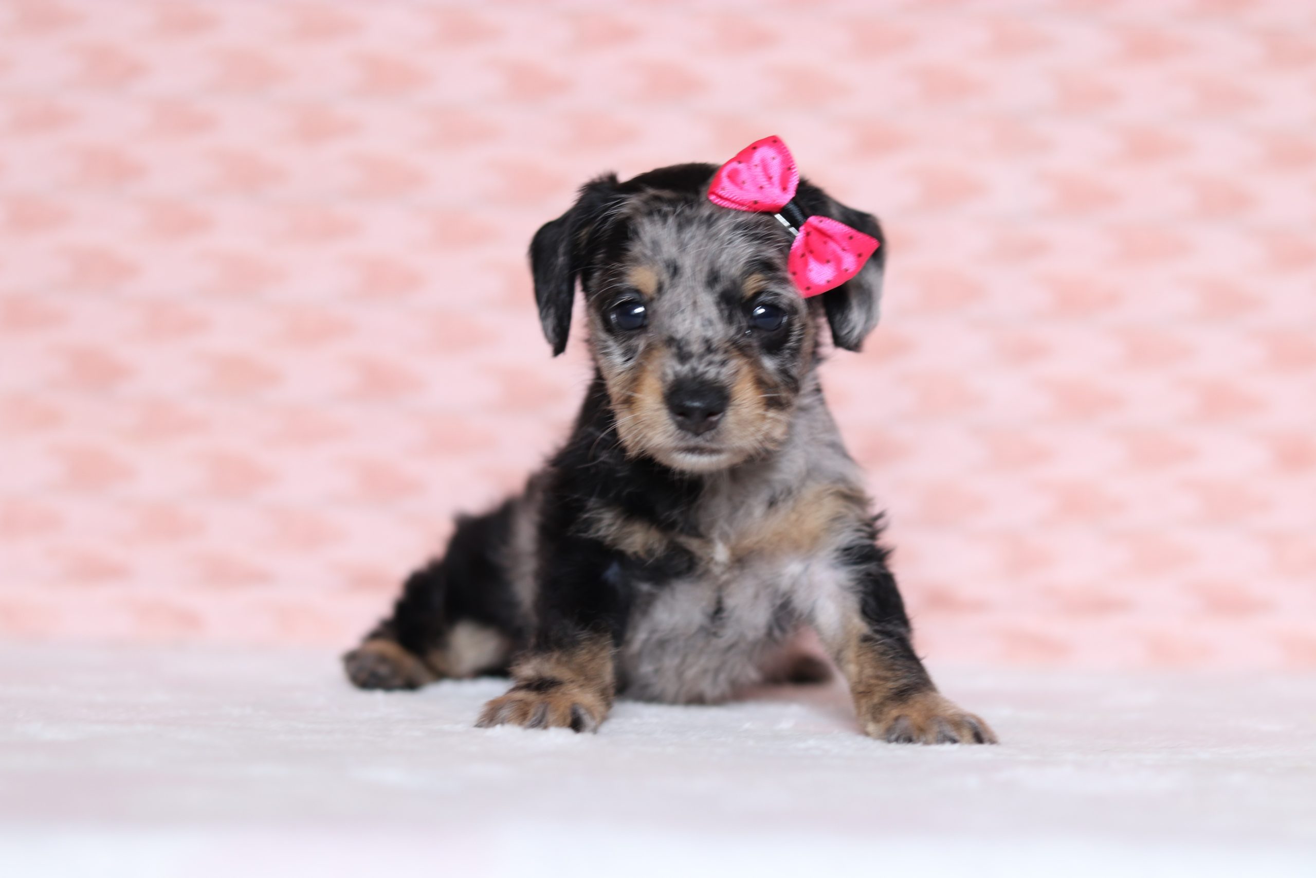 Paisley,the Doxypoo enjoys getting all the attention she can and loves to play with her toys.She’s got a beautiful blue merle haircoat! She did great with her (ENS) Early Neurological Stimulation, she is definitly a joy to have around. She is eager to please, just a super friendly little girl!