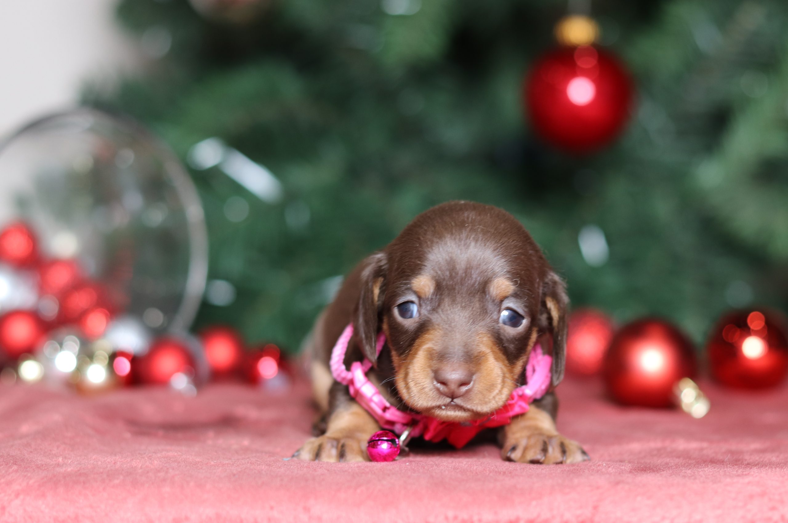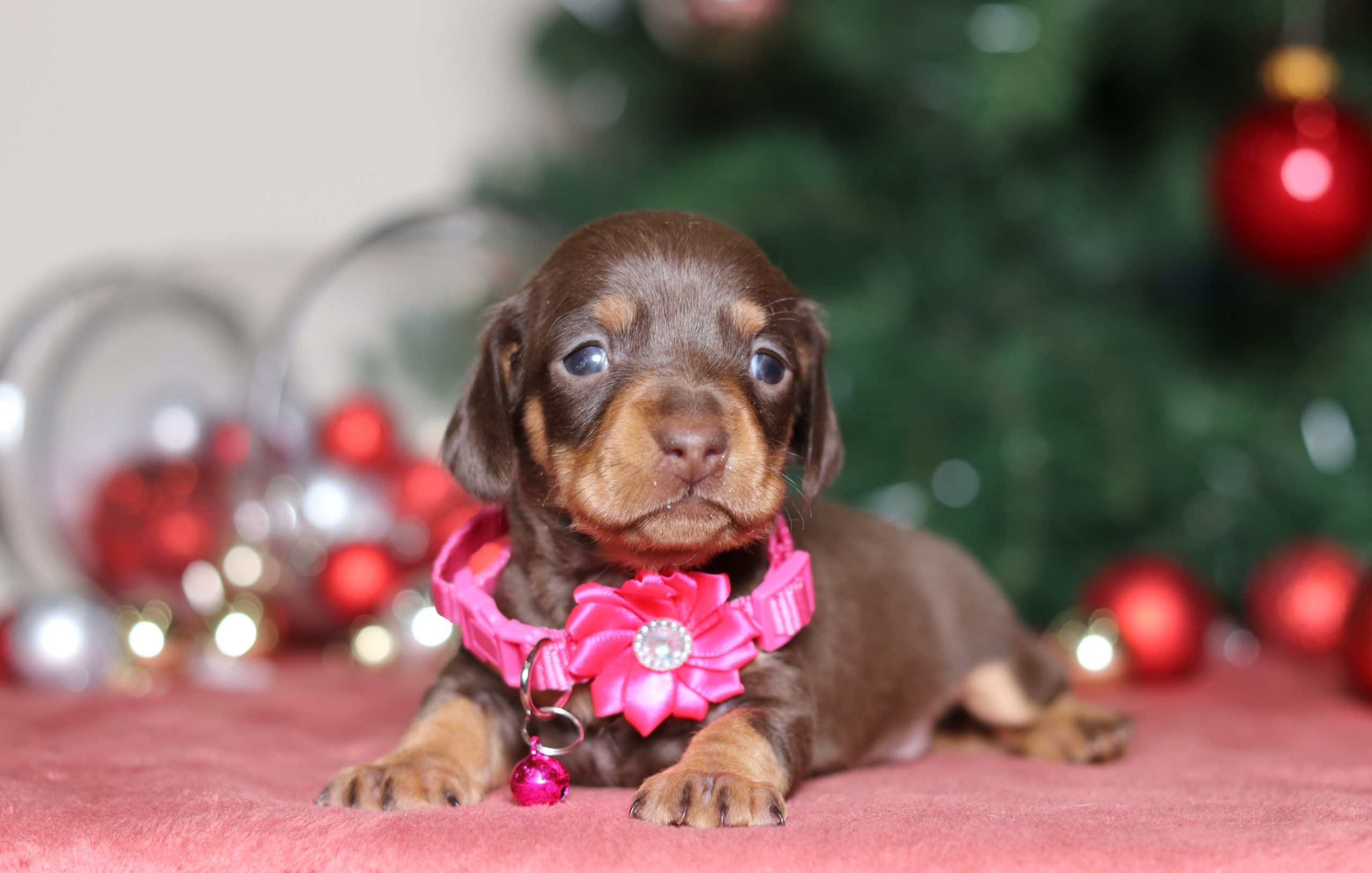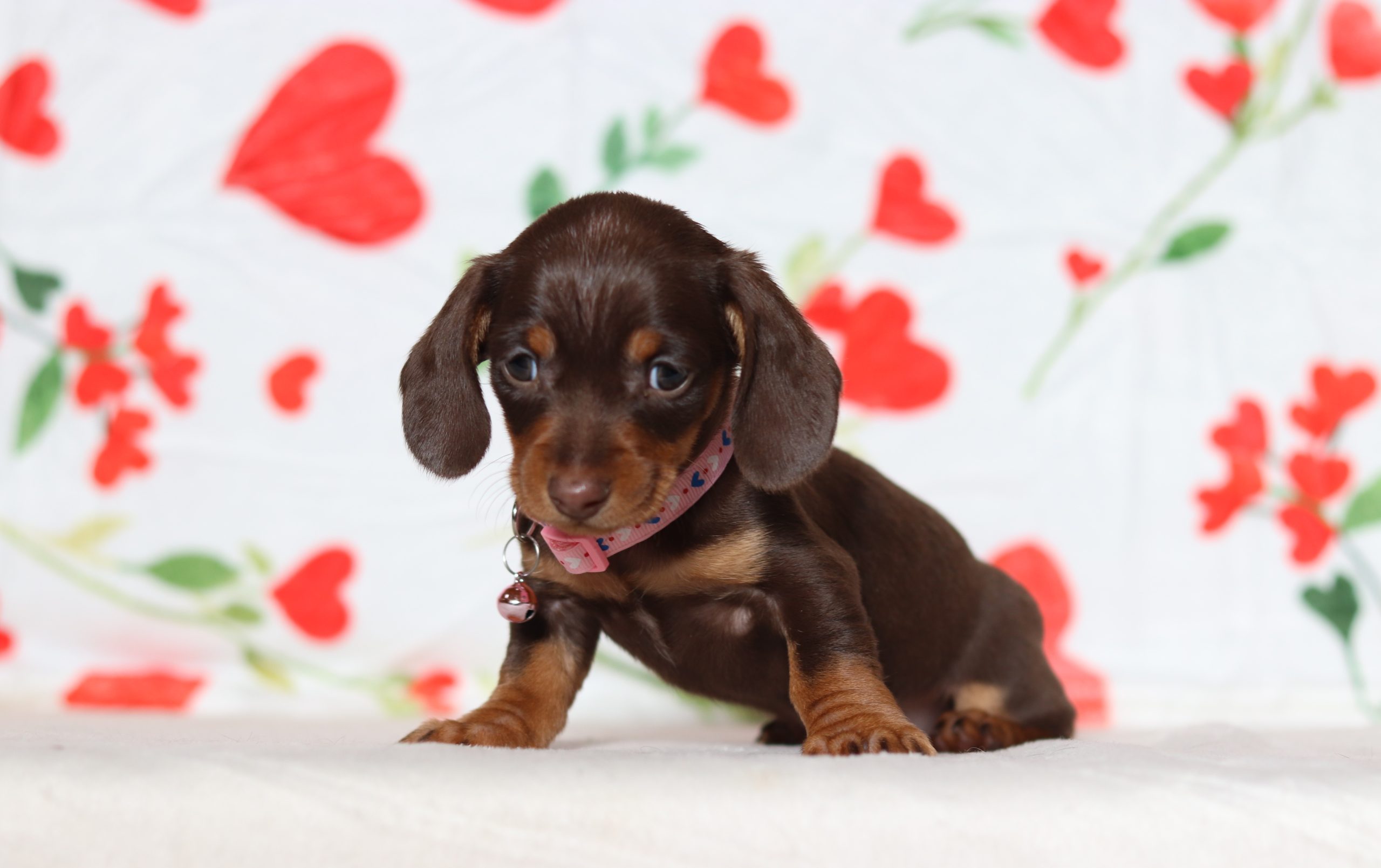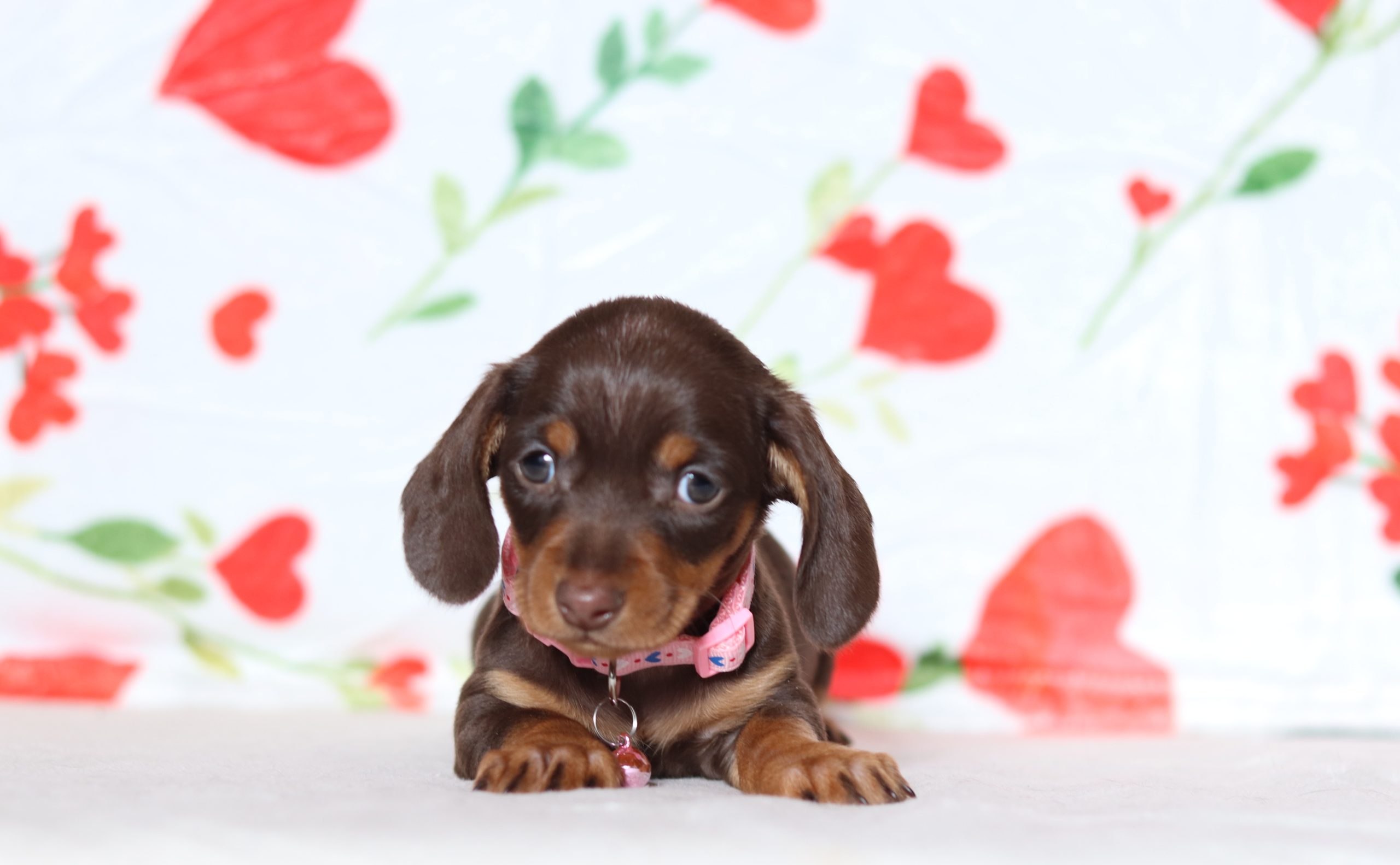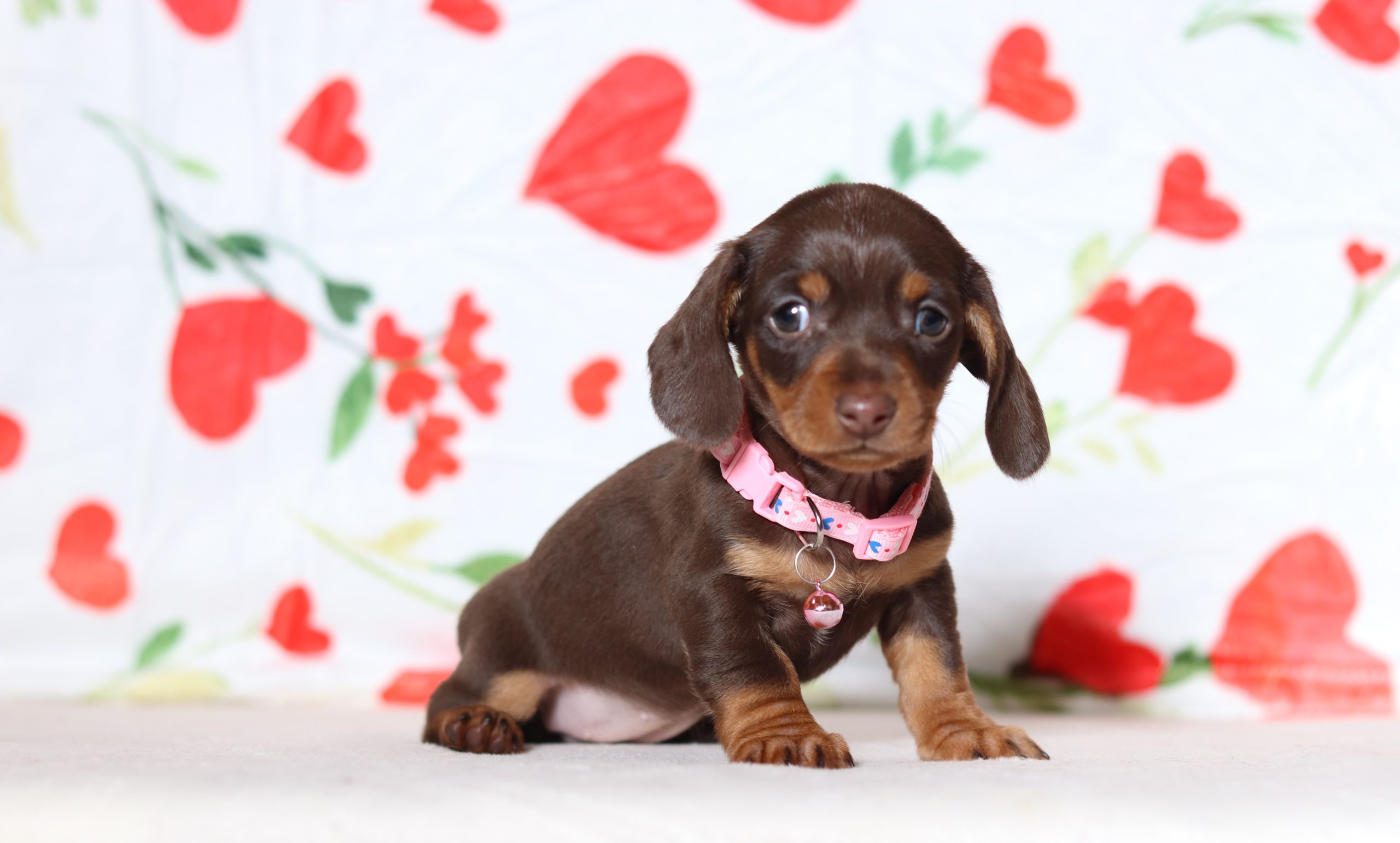 Pansy, the chocolate/tan shorthaired mini dachshund is very caring and sweet! She is such a cheerful little girl a great companion to her littermates! Her temperament is wonderful! She is eager to please and a bundle of love!