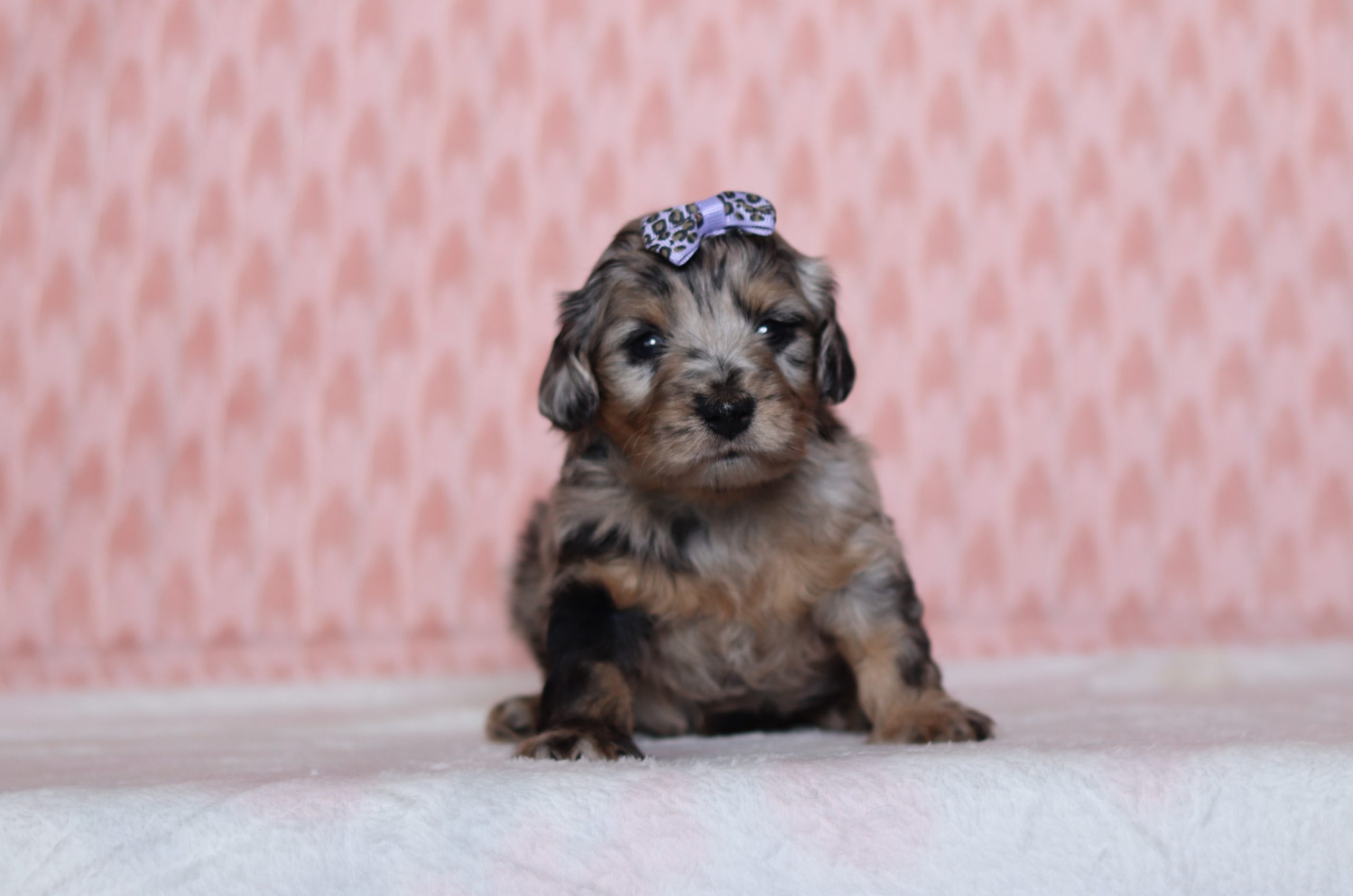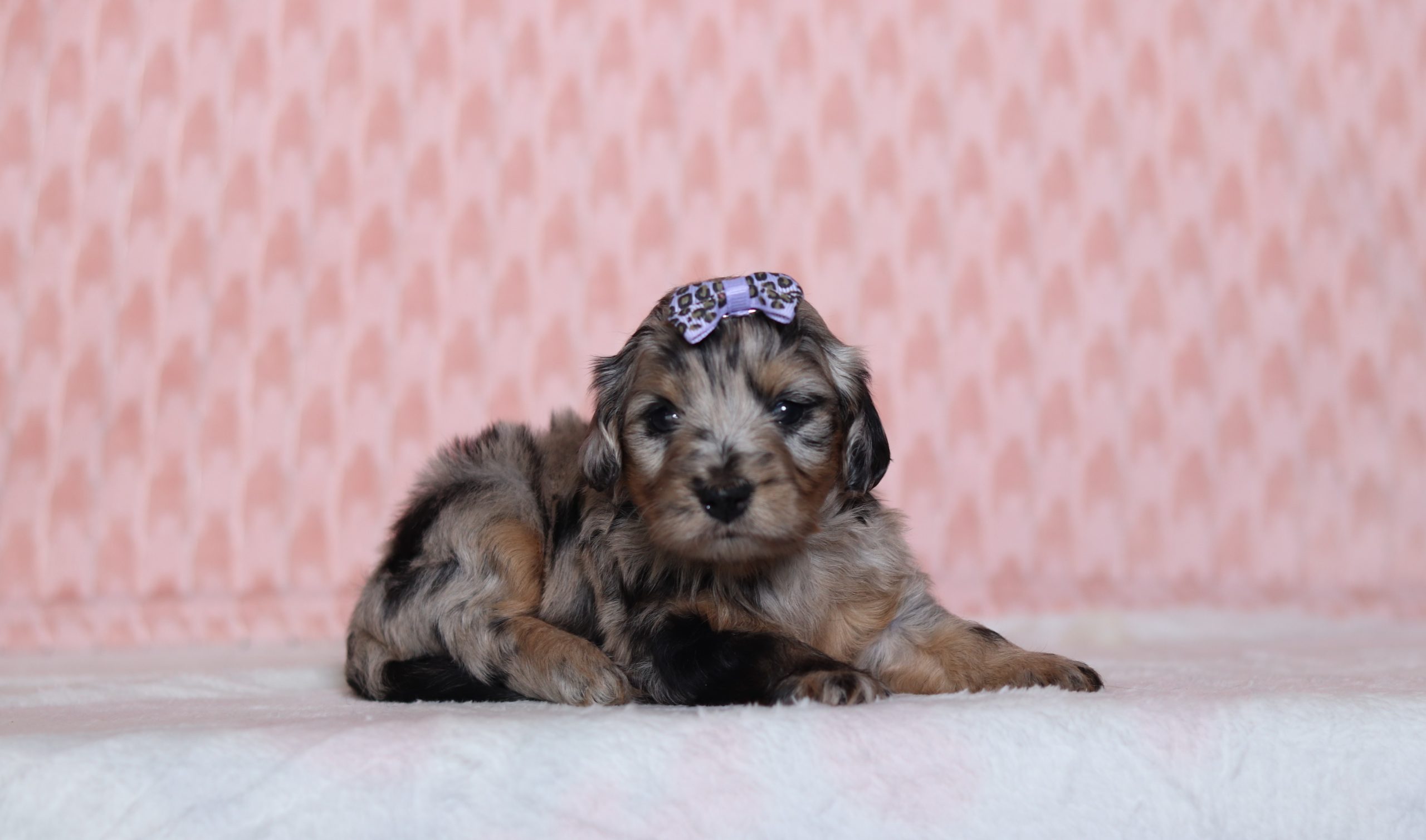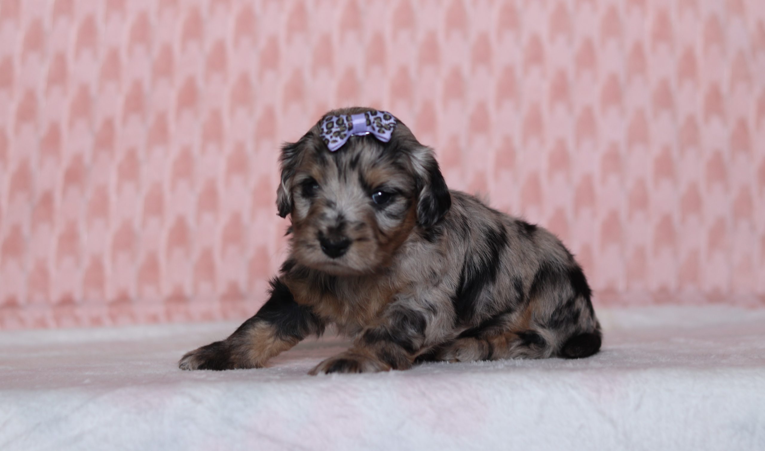 Pebbles, the Doxy Poo girl, is very alert and won’t miss a beat! She is a happy go lucky little girl, and loves excitement! She has a beautiful,blue merle, fluffy hair coat! Her caring eyes and cute little nose will be sure to steal your heart! Enjoys playtime and also loves to be held! She’s an all around cutie!