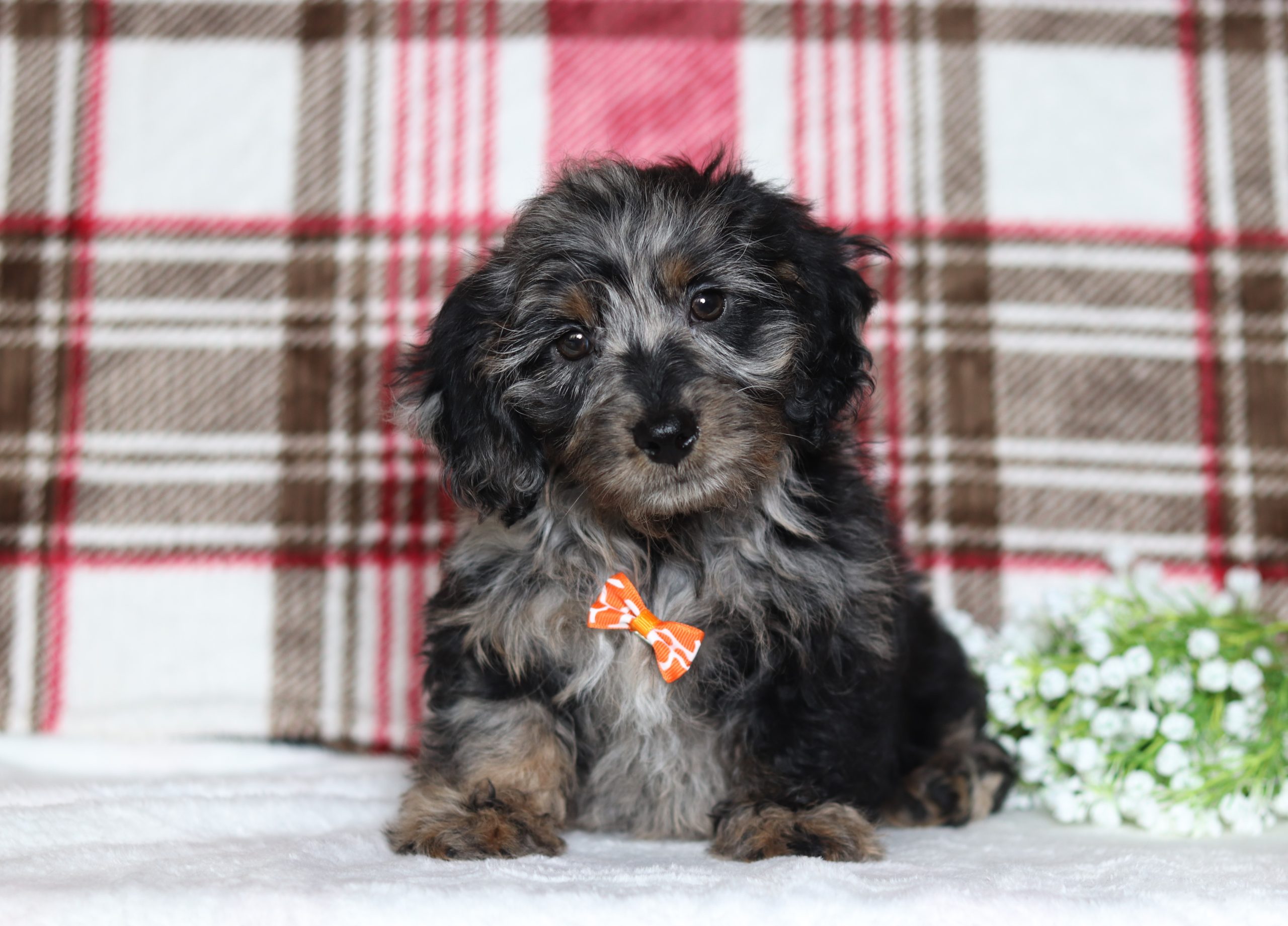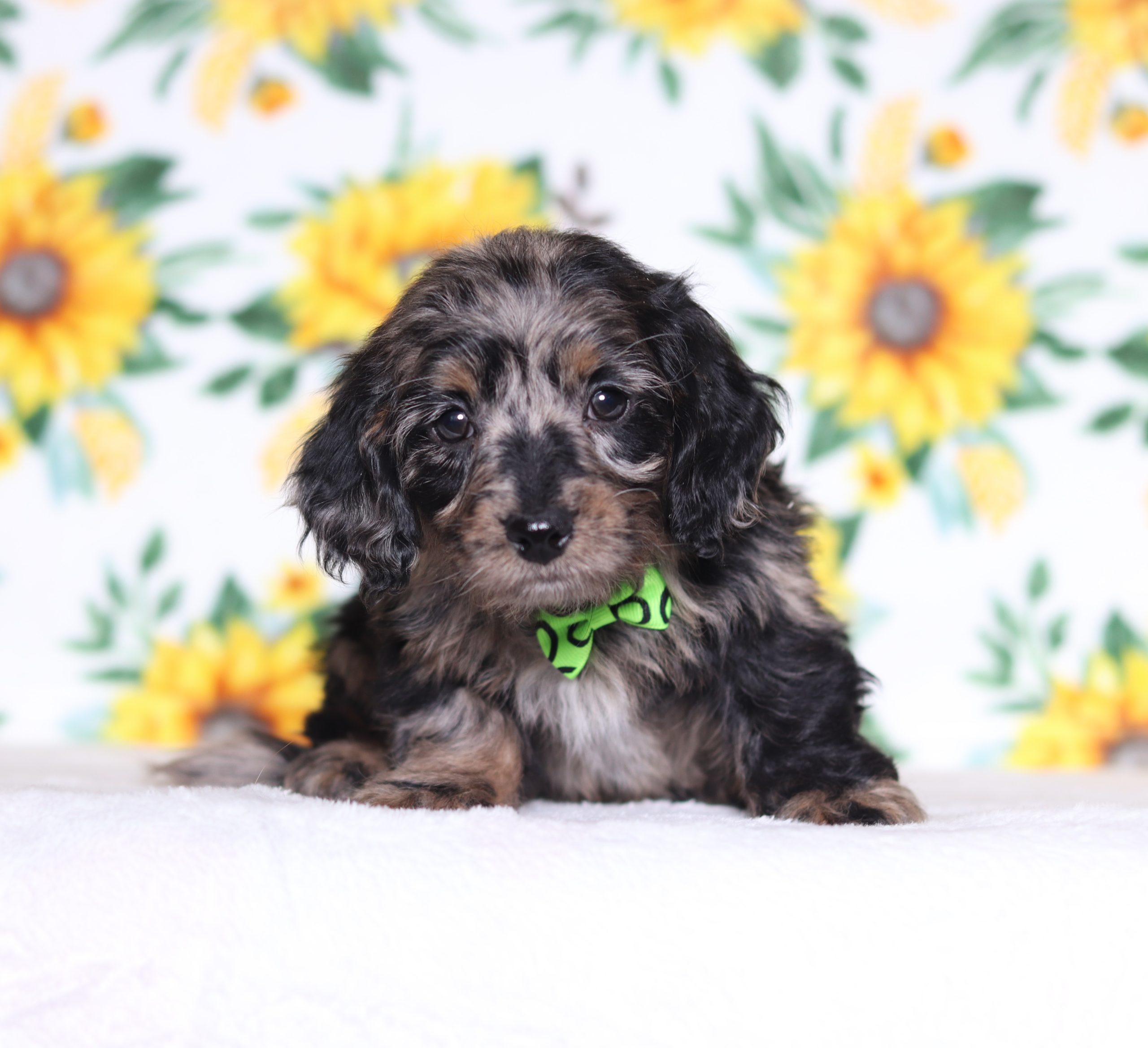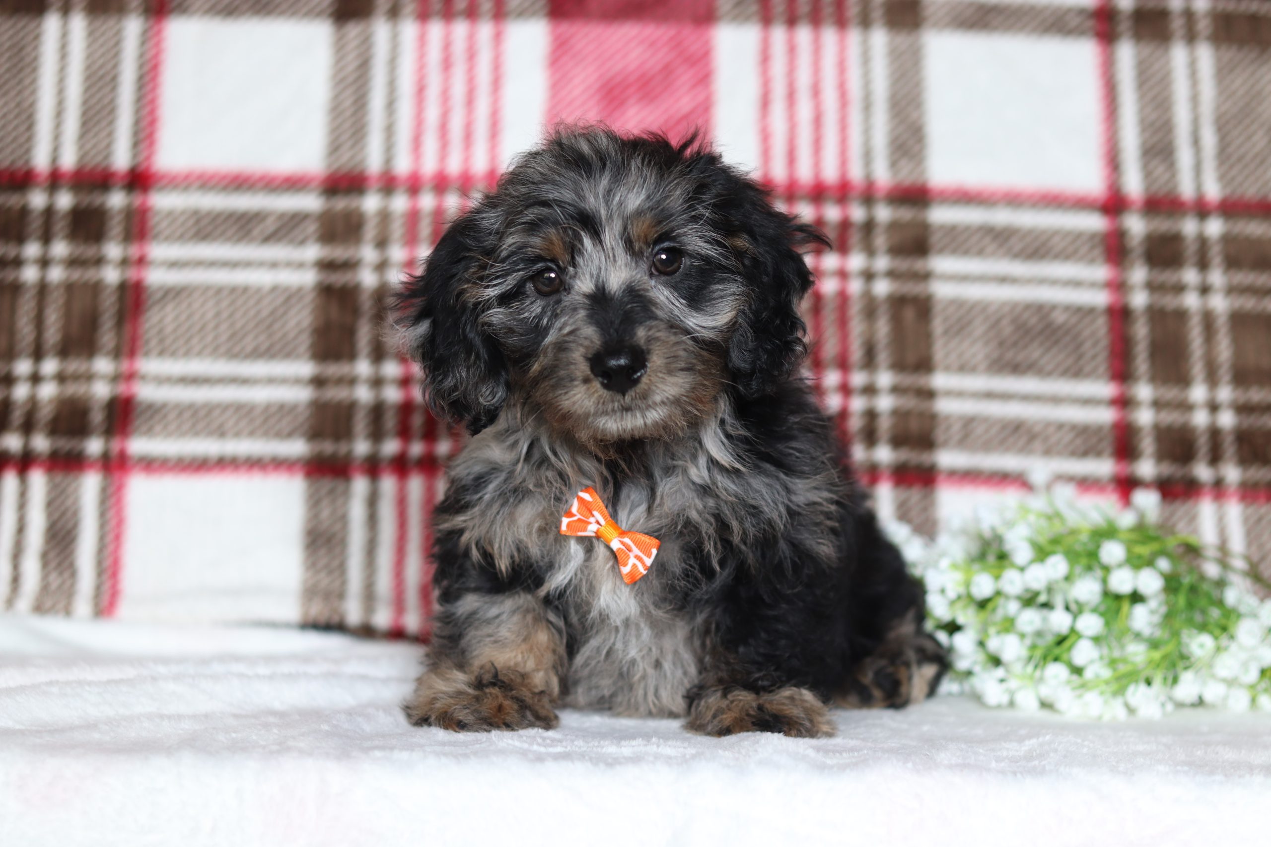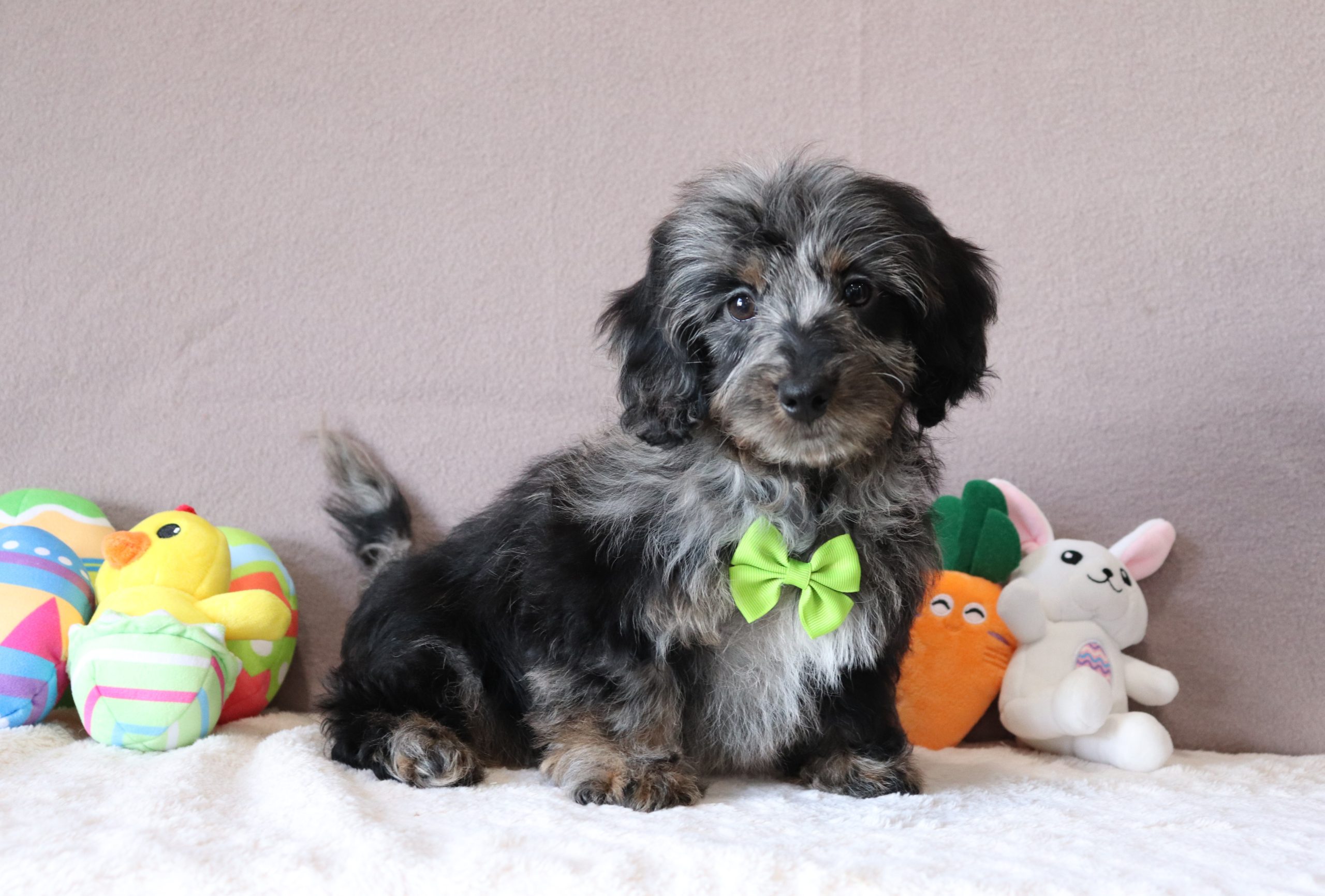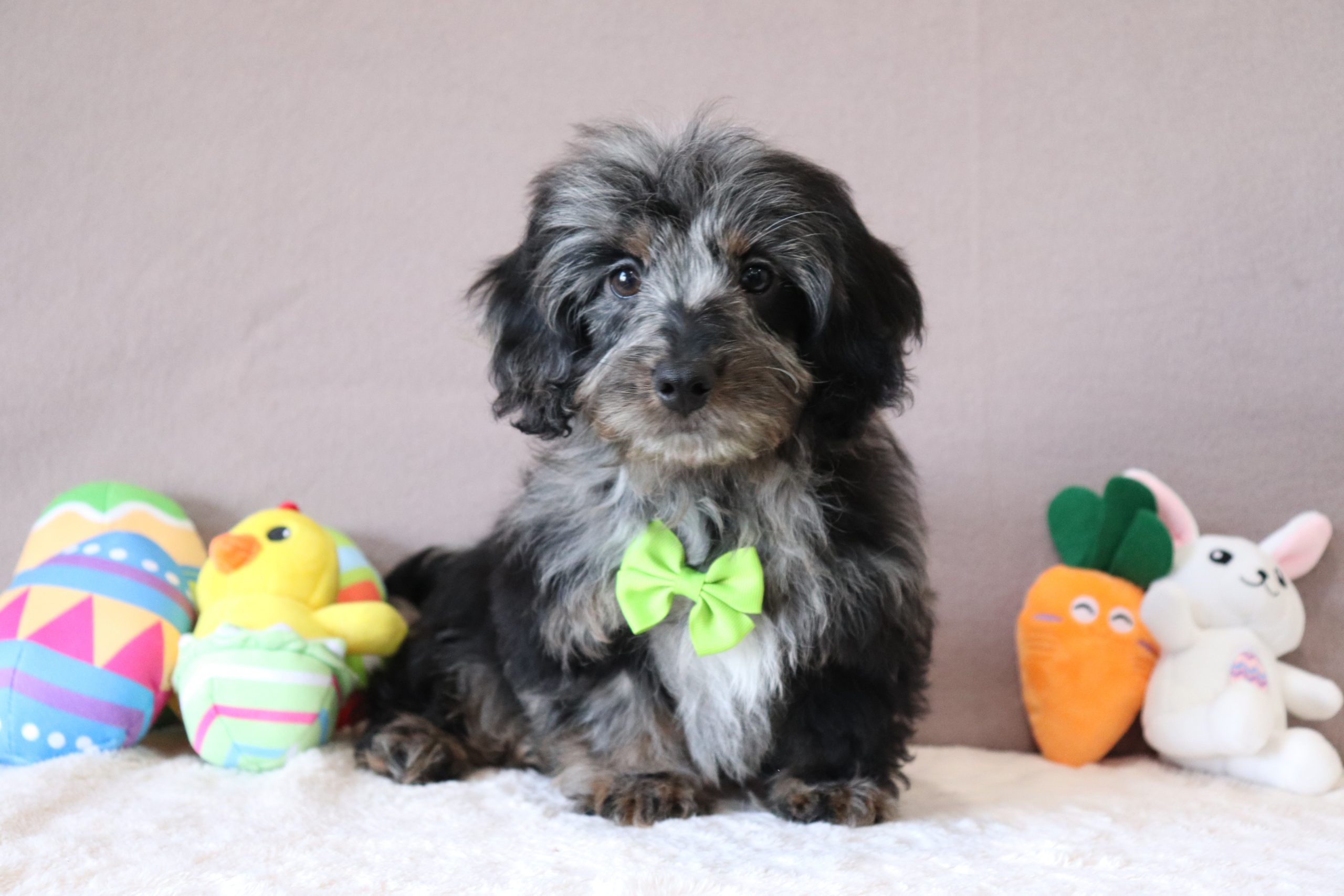 Perry, the Doxypoo boy is very alert and won’t miss a beat! He is a happy go lucky little guy and loves excitement! He has a beautiful fluffy blue merle hair coat! His caring eyes and cute little nose will be sure to steal your heart! Enjoys playtime and also loves to be held! He’s an all around cutie!