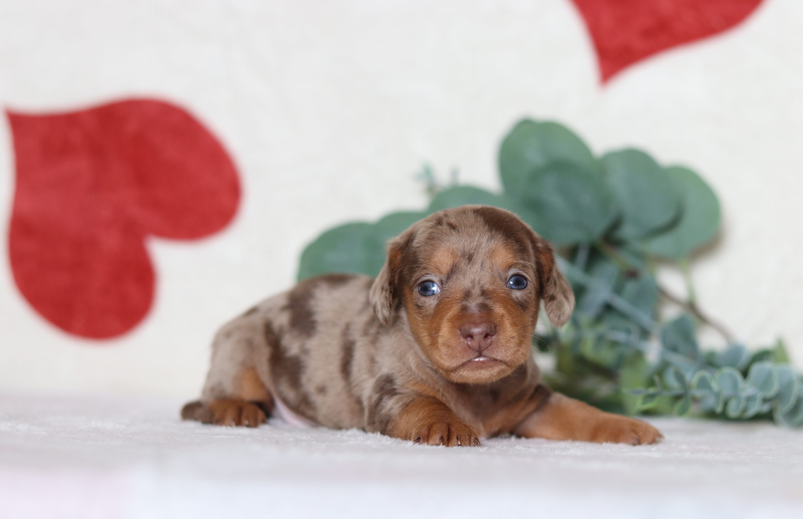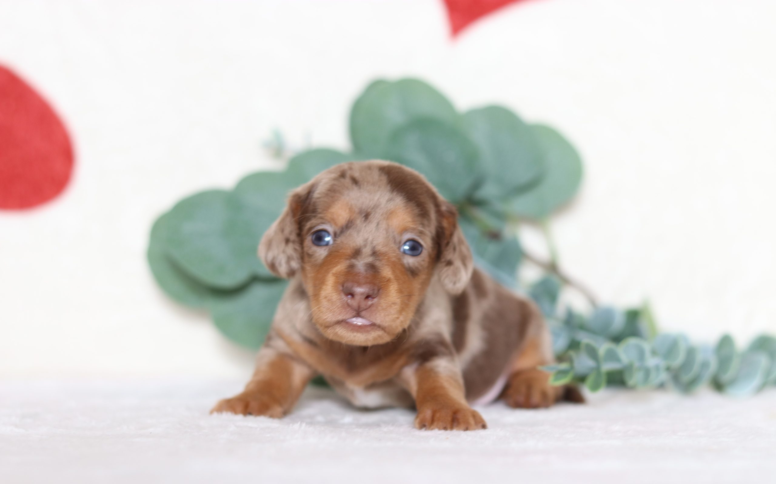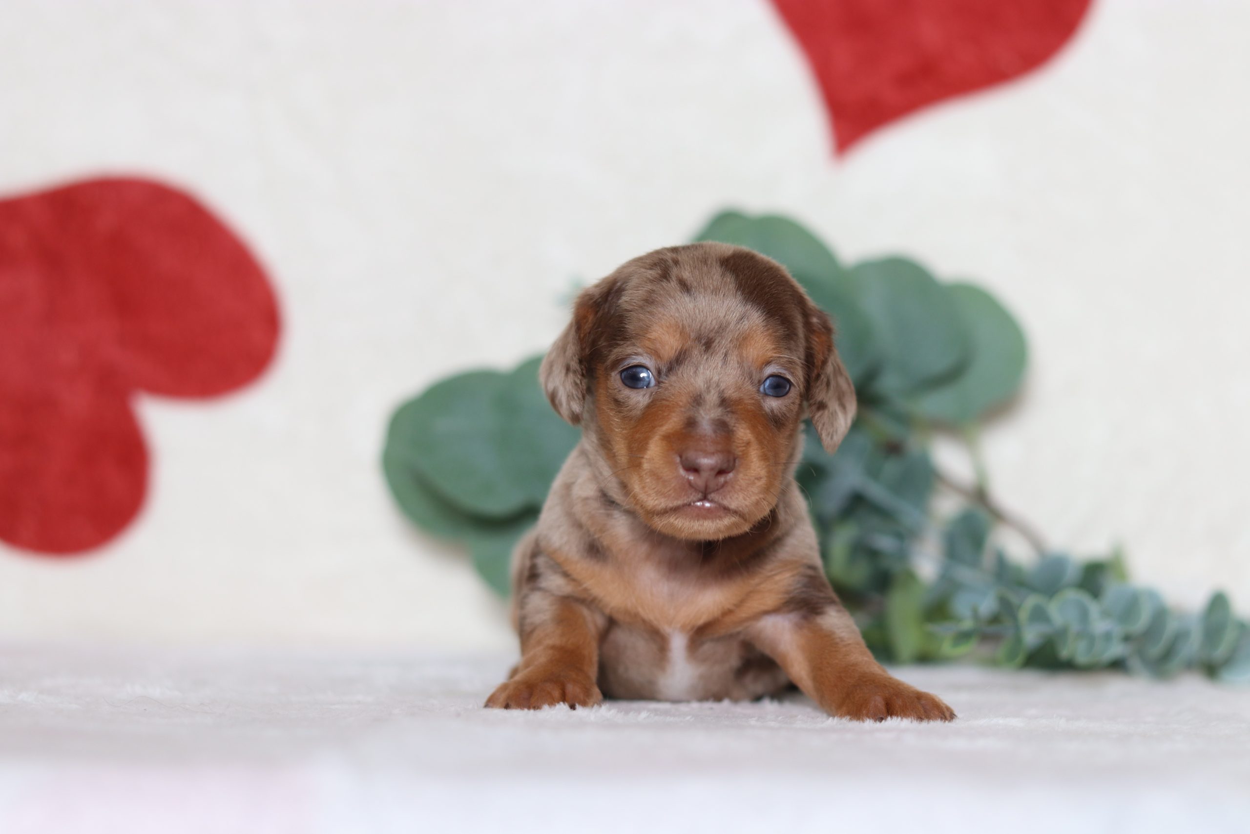 Peter, the shorthaired mini dachshund boy is soft and cuddly! He’s got a gorgeous chocolate dapple coat! He is calm and easy going, loves to be held and cuddled. He did great with his (ENS) Early Neurological Stimulation, and is enjoyable all around. A very friendly and lovable guy!