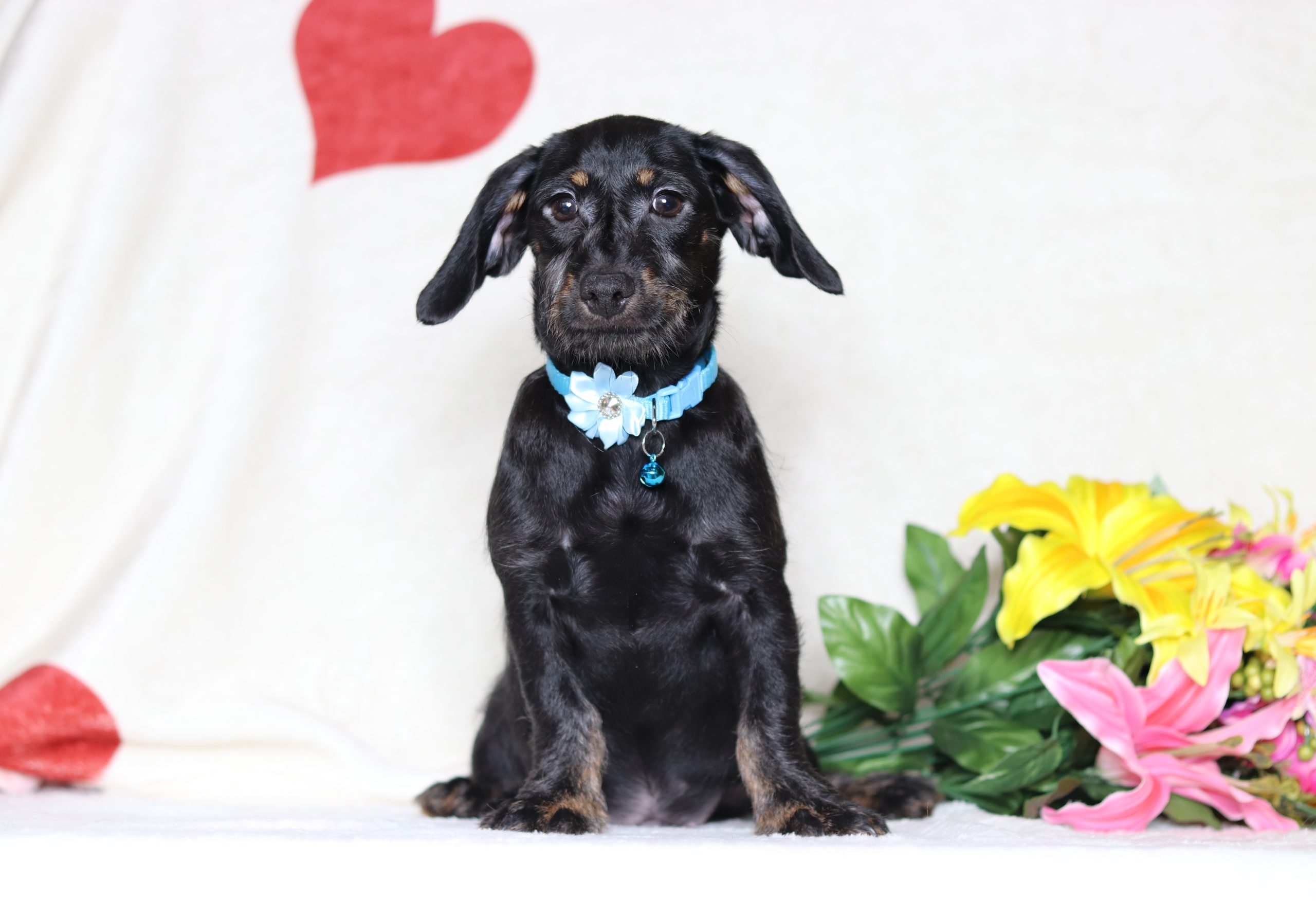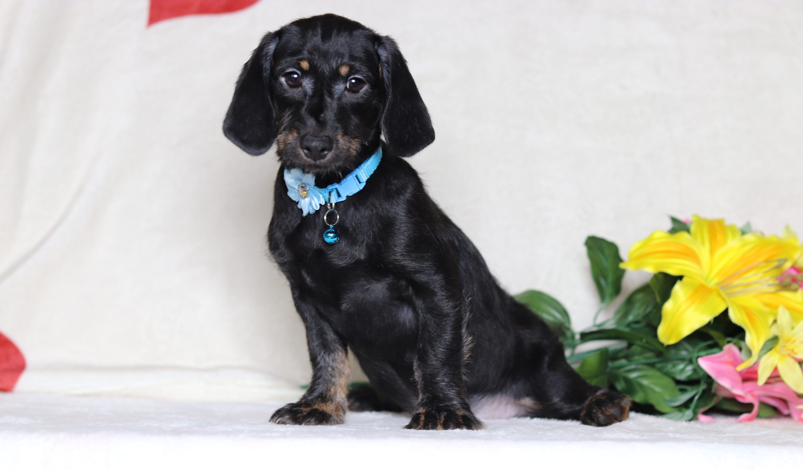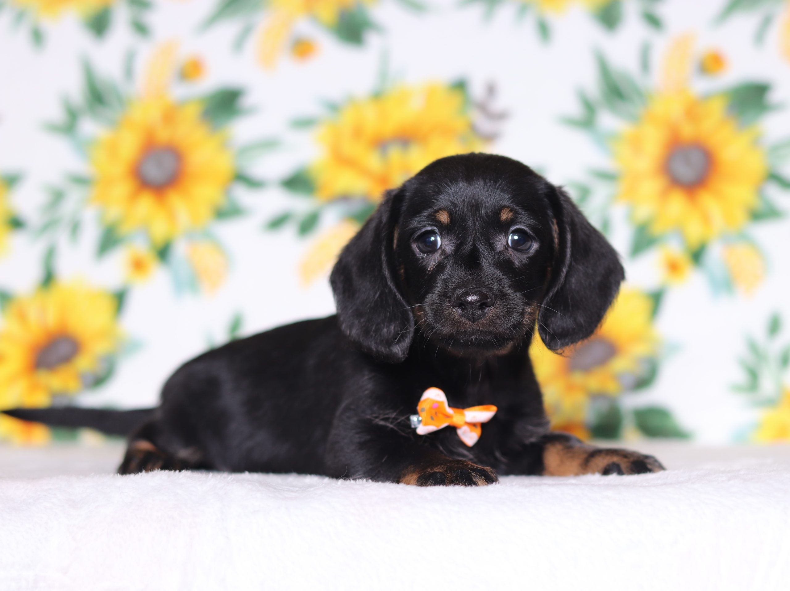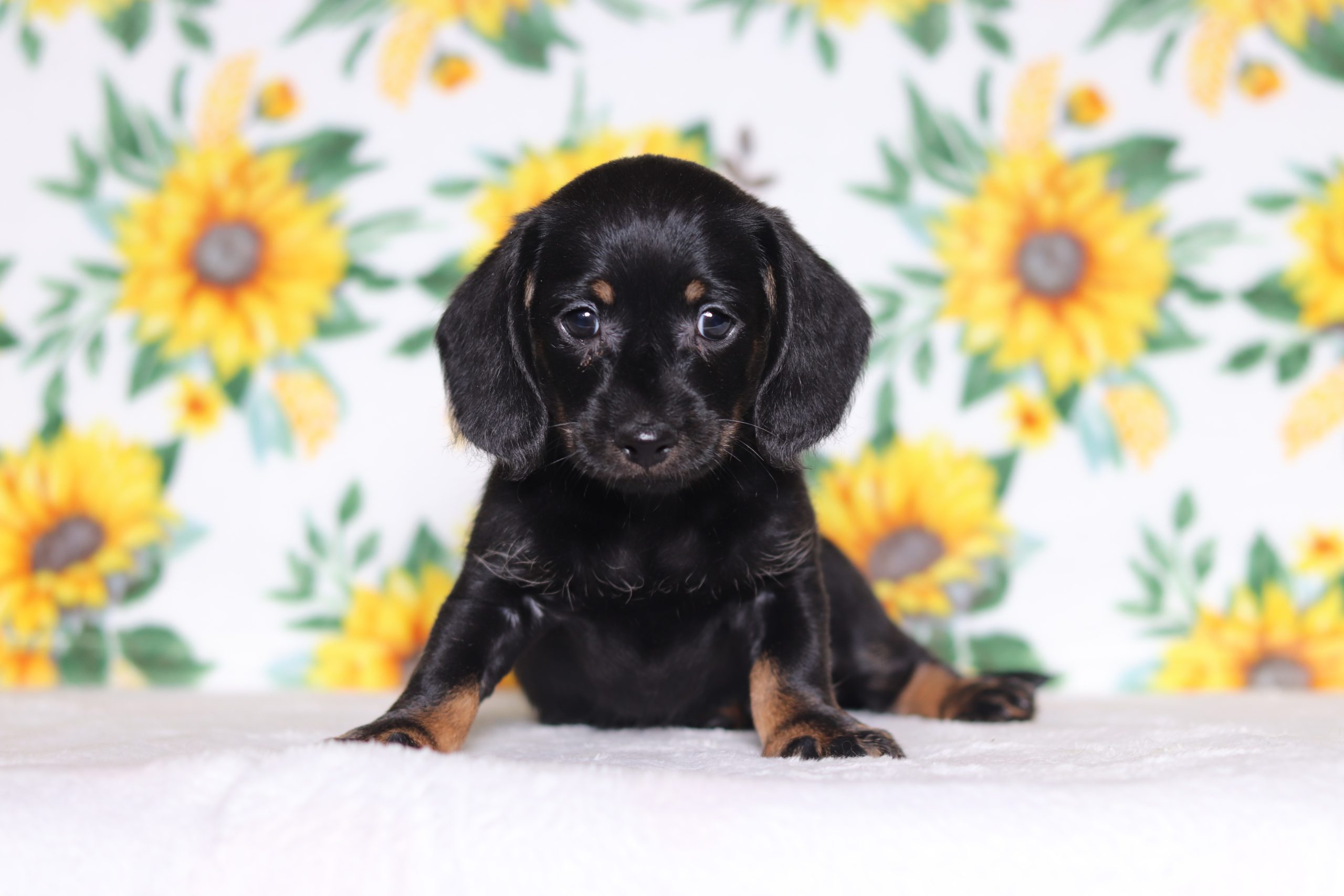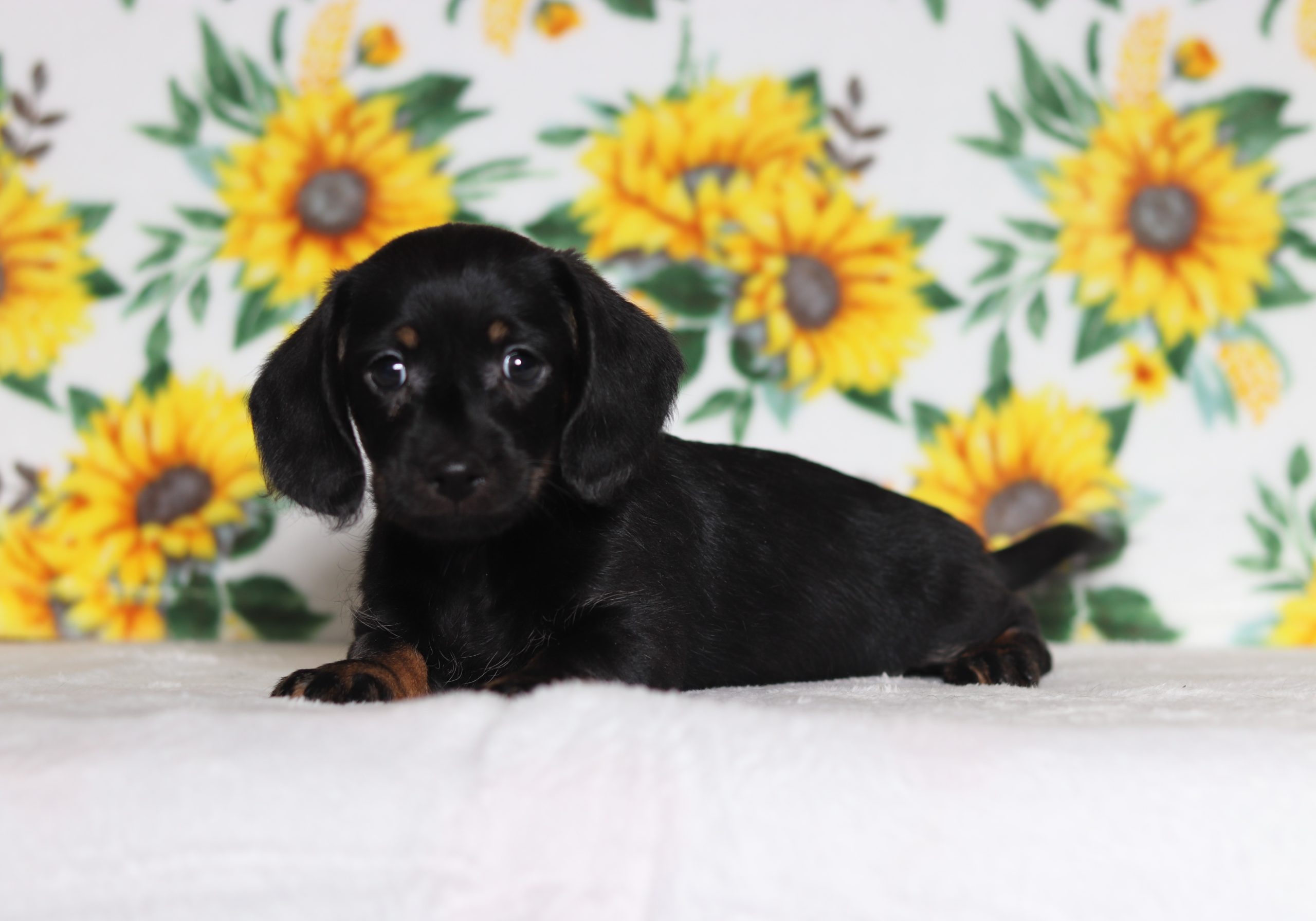 Pinto, the black/tan shorthaired mini dachshund is very caring and sweet! He is such a cheerful little boy, a great companion to his littermates! His temperament is wonderful! He is eager to please and a bundle of love!
