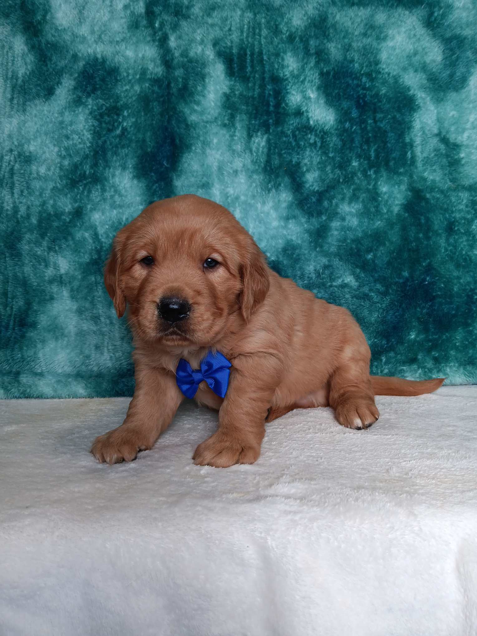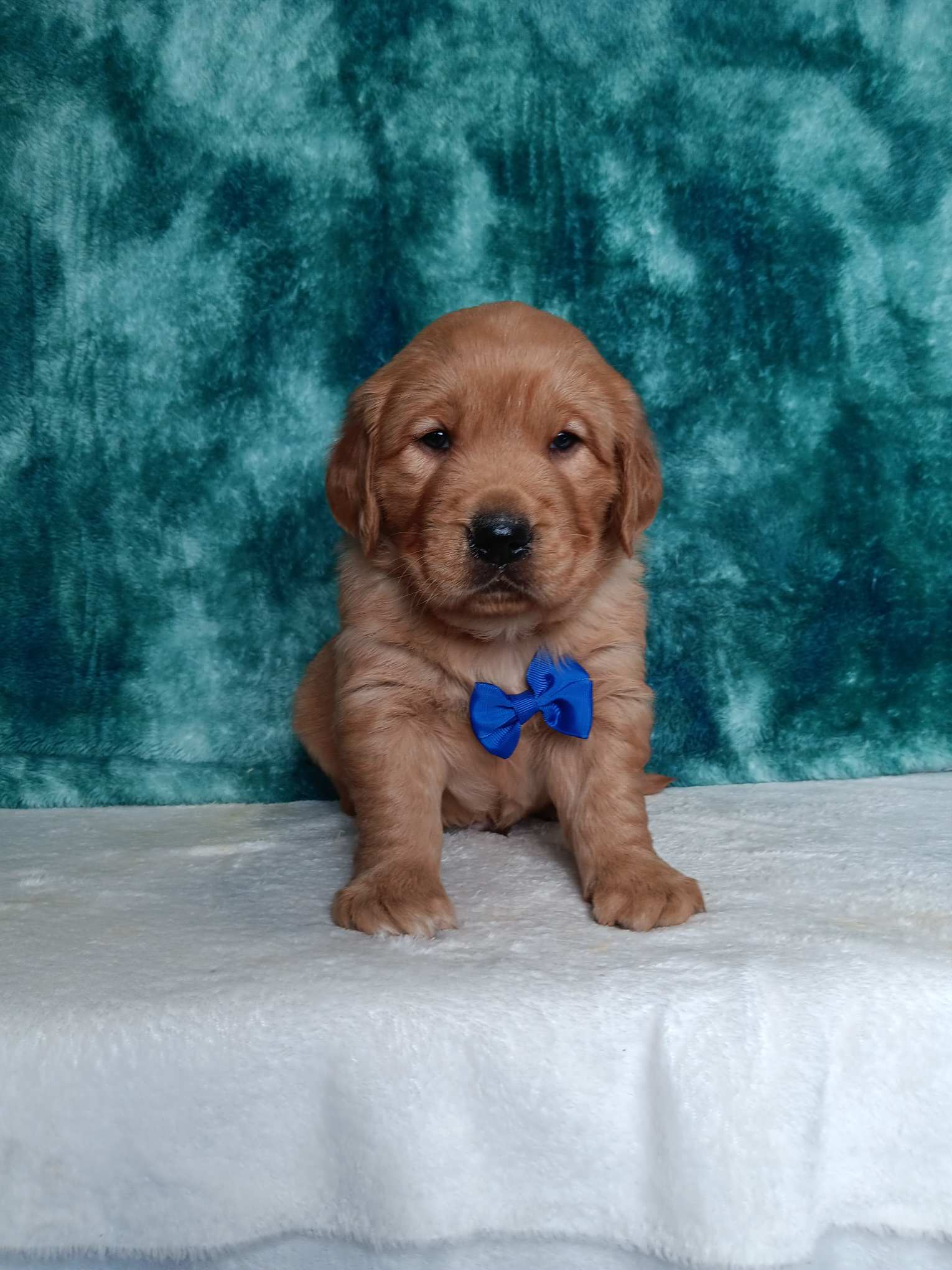 Hello, this is Ray! He’s a cute looking little Golden Retriever boy with a nice red/white, soft, furry coat and 2 shining eyes. He loves to play with his siblings and also loves to be held and cuddled! He will be sure to shower you with lots of kisses! (Estimated Wt. 62#)