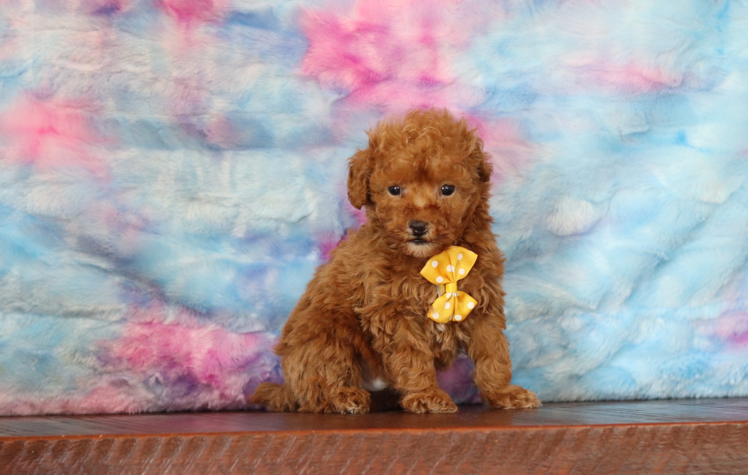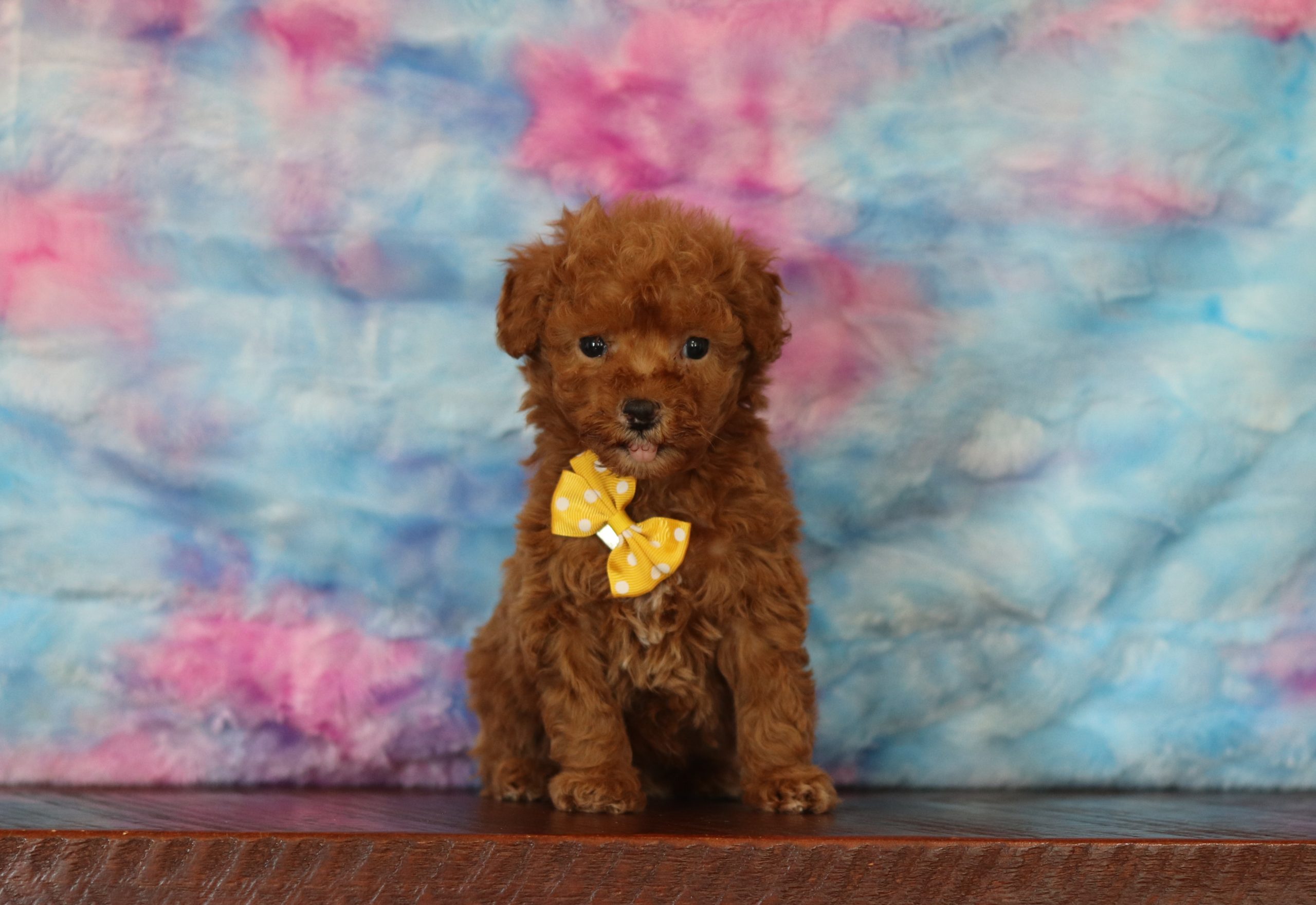 Hello, this is Saucer! He’s a cute little Mini Poodle boy with a gorgeous,red, wavy coat and 2 shining eyes. He loves to be held and cuddled! He will be sure to shower you with lots of kisses!