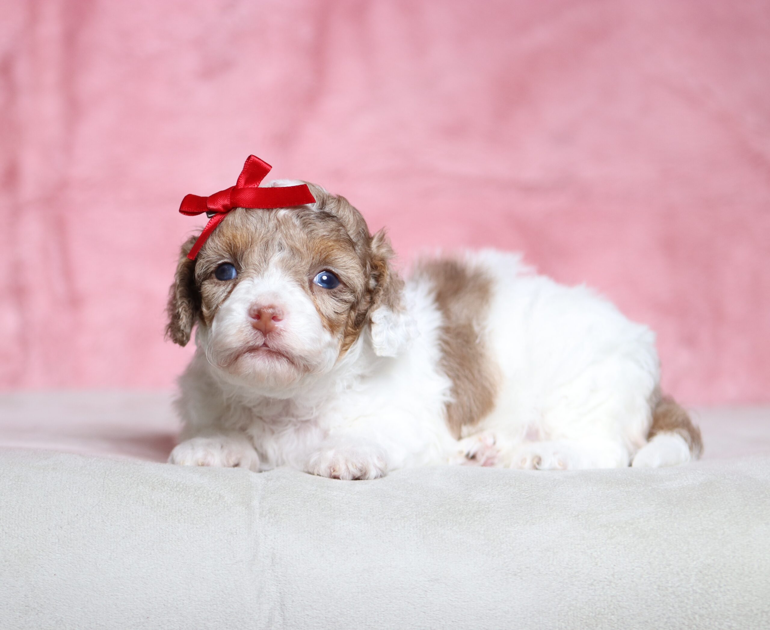 Sunrise a precious little Doxiedoodle girl with a beautiful coat of white with some patches of chocolate merle! She enjoys every minute of snuggling together! She loves being pampered and getting belly rubs! She did great with (ENS) Early Neurological Stimulation and enjoys playing with toys and running around! She is a friendly and adorable girl!