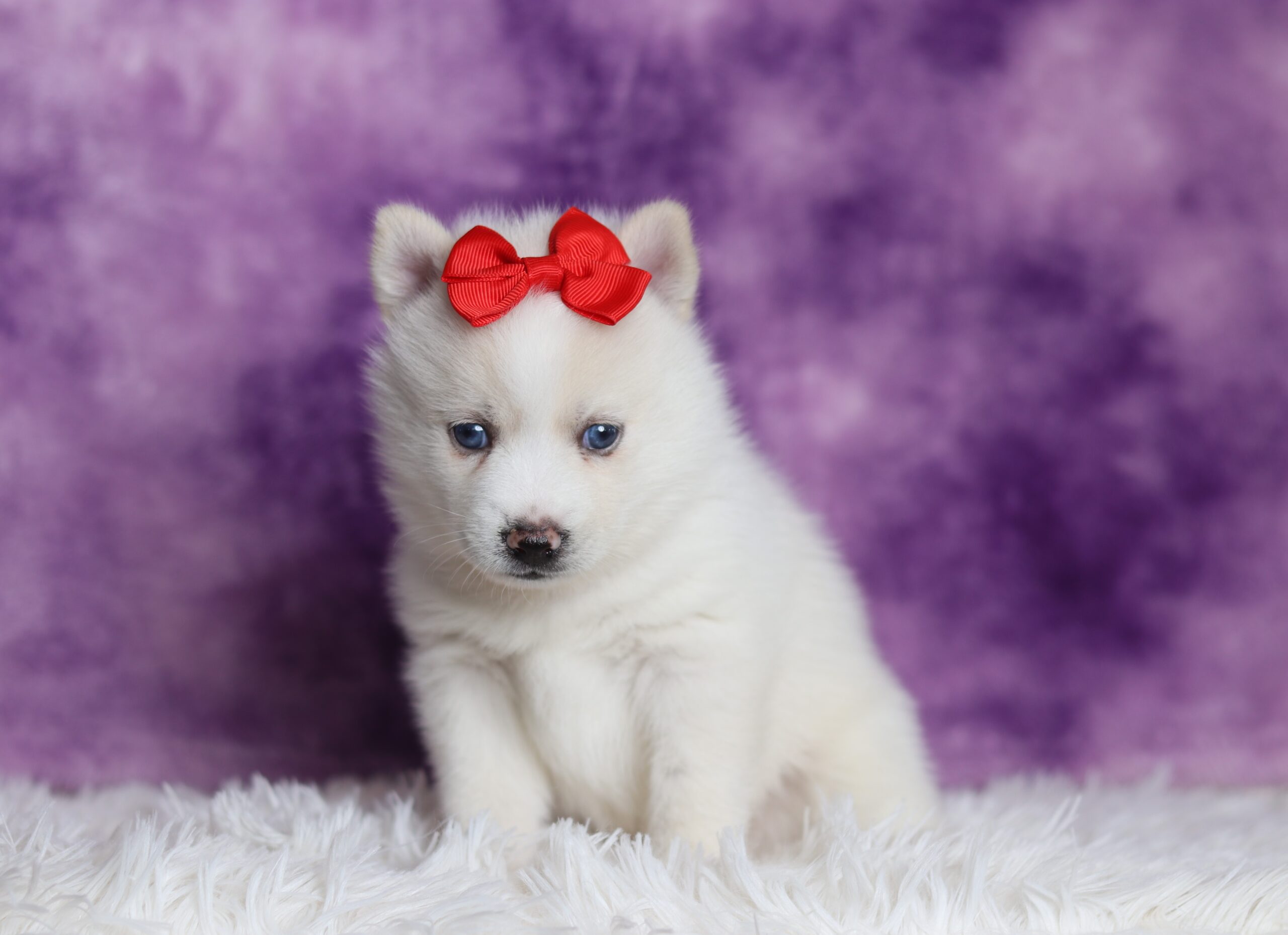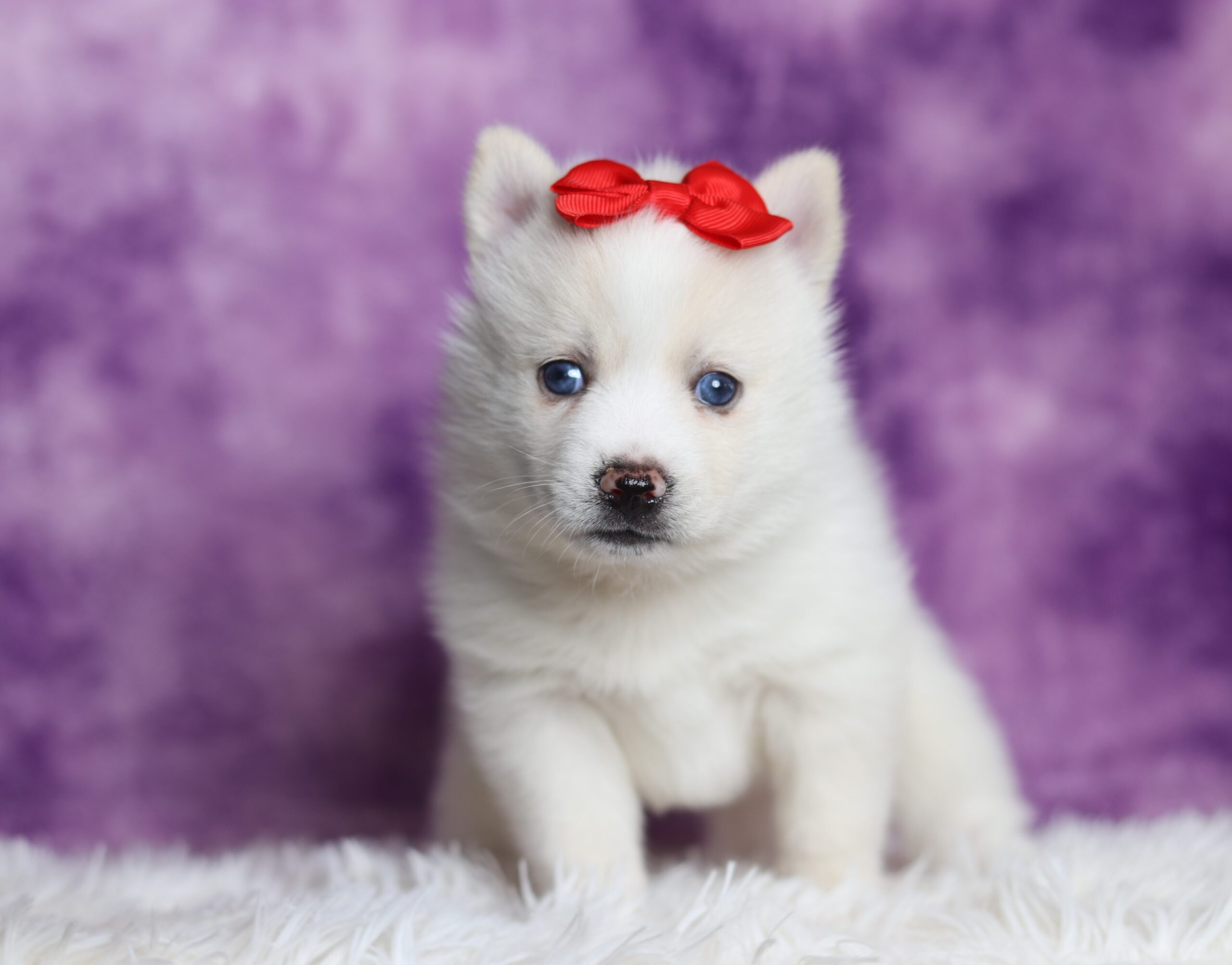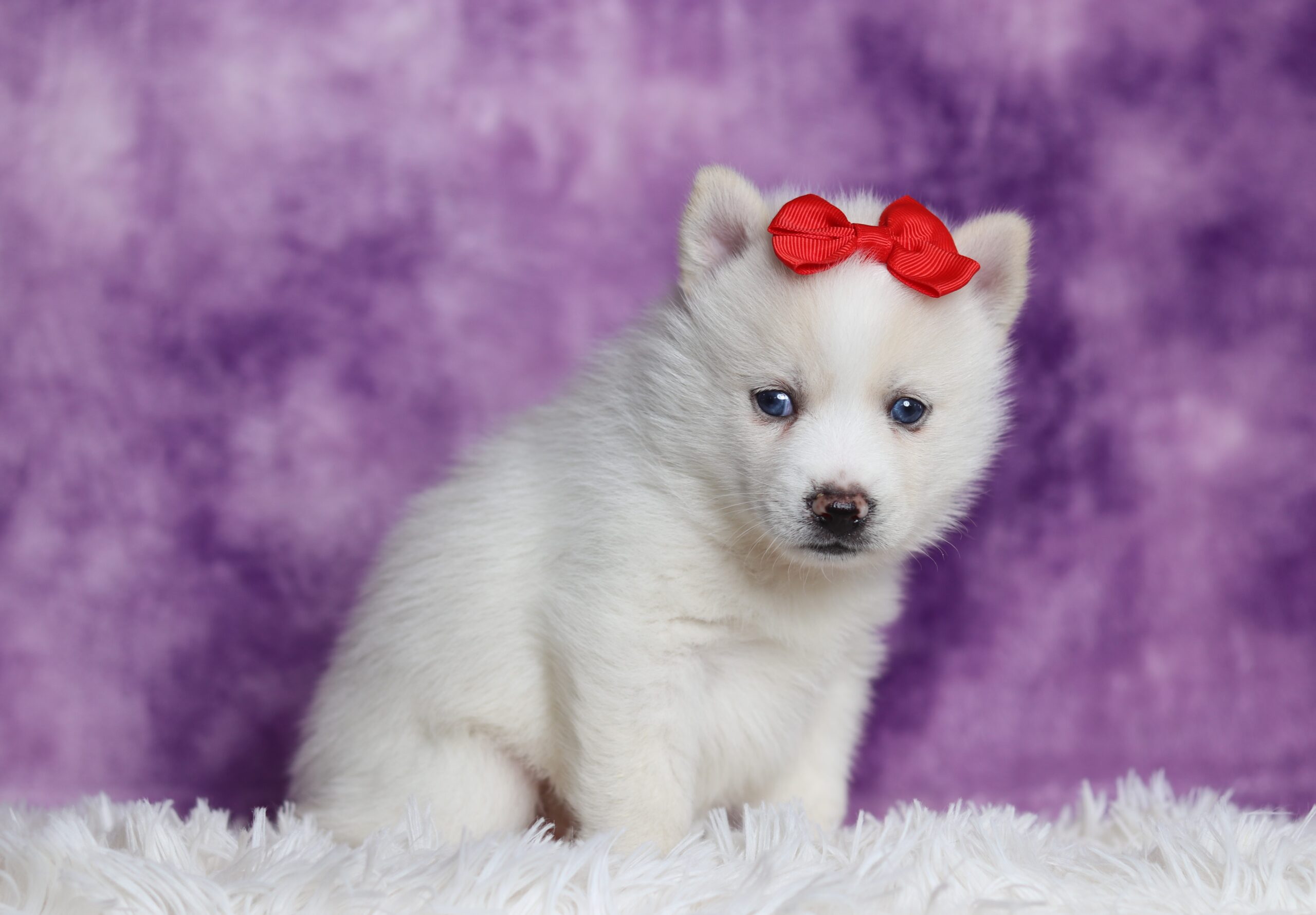Hi, this is Valerie a fluffy white pomsky gir, she’s a sweetie and loves to snuggle which will make her adaptable to any home! The kids play with her a lot and she enjoys every moment of it. Reserve her today, she is eager to join your family!